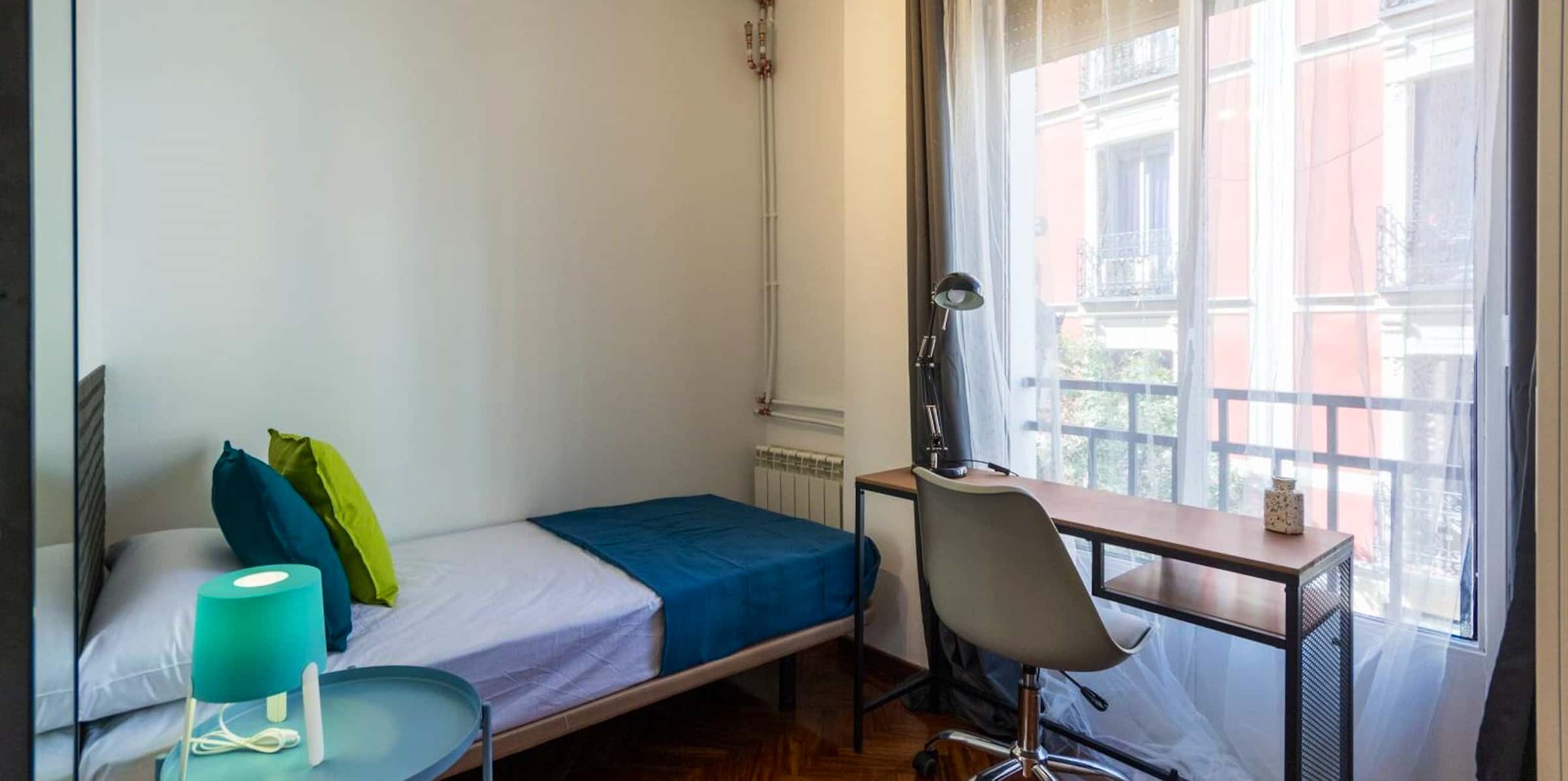 HABITACIÓN CON CAMA DE USO INDIVIDUAL La habitación cuenta con cama individual, zona de escritorio y armario. El apartamento cuenta con cocina completamente equipada, 1 baño compartido por un máximo de 5 personas. Nuestro coliving está enfocado a estudiantes y jóvenes profesionales, generalmente entre 18 y 40 años, y ambiente internacional. Buscamos que disfrutes de Madrid y que tu estancia sea cómoda, por lo que nuestros asesores te ayudaran ante cualquier duda. Al hacer tu reserva queremos que disfrutes con nosotros, estés cómodo y cuentes con nuestro equipo y comunidad, por ello no solo te ofrecemos un alquiler, sino que alojándote con nosotros: -Formarás parte de nuestra comunidad, teniendo acceso a eventos y actividades semanales para que descubras Madrid y te sientas como en casa siendo uno más. -Limpieza semanal de las zonas comunes. -Servicio de mantenimiento. -Posibilidad de empadronamiento -Servicio Medico 24/7 por Quirón Salud -Atención al cliente 24/7 a través de nuestro departamento de Atención al coliver -Invitación a eventos y actividades especiales Condiciones: -Un mes de Fianza -Membership Club -Tarifa plana mensual de electricidad, agua, calefacción, internet de alta velocidad -Consultar estancia mínima -De documentación únicamente solicitamos DNI o pasaporte Nuestro coliving está enfocado a estudiantes y jóvenes profesionales que quieren disfrutar de una estancia en Madrid. La ubicación es inmejorable en el centro. Bien comunicado, se encuentran edificios de gran importancia cultural y de ocio, y cerca de la parada de metro de Opera, líneas 2 y 5 de Metro, que conectan directamente con importantes zonas de Madrid. Además, cuenta con numerosas paradas de autobuses con excelentes conexiones por toda la ciudad rodeado de restaurantes, cafés y tiendas. Check in: Lunes - Domingo: 15:00 - 24:00 Check-out: Antes de las 11:00 Durante el fin de semana o festivo el check-in es posible si se coordina antes del viernes o el último día laborable antes de las 13h00. 📅 CONTRATO QUINCENAL En el mes de entrada o de salida: - Si te quedas 14 días o menos, pagarás la mitad del alquiler de ese mes. - Si te quedas más de 14 días, pagarás el alquiler del mes completo. (El importe a pagar de cada mes aparece calculado en el resumen de pagos)