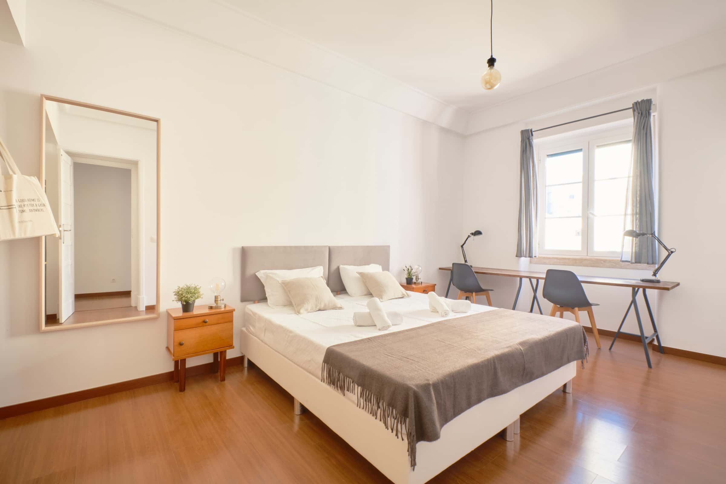 Recently renovated 8-bedroom apartment with 2 full bathrooms, including a suite. The apartment is located at Rua Filipe Folque, near the Picoas and Parque metro stations (one of the most premium neighborhoods in Lisbon). The kitchen is fully equipped (dishwasher, washing machine, stove, kettle, microwave and oven). IMPORTANT NOTES: 1. RESPONSIBILITY: In shared apartments, certain rules naturally apply to all tenants, regardless of whether they have a private bathroom. These rules are intended to ensure the proper functioning, maintenance and hygiene of the common areas and they apply to everyone without exception, especially when it is not possible to assign responsibility for damages/misuse to a specific tenant. Such measures are standard in shared living environments, helping to ensure that all tenants can enjoy a clean, safe and well-maintained apartment. 2. BILLS: Not included. They are €45 per person per month (€35 for water, electricity, gas, internet and €10 for the cleaning of shared spaces). You do not have to pay anything more if €45 per person is enough to cover all the bills, which is usually sufficient. 3. DEPOSIT: Equal to the value of one month’s rent. 4. AMOUNTS NECESSARY FOR RESERVATION: First month’s rent. 5. AMOUNTS NECESSARY UNTIL THE STARTING DATE: Deposit + last month’s rent (with bills) + missing bills from the first month’s rent. 6. OTHER RENTS: Must be paid by the last day of the previous month to which each one refers. 7. ADJUSTMENTS: Although the contract is fortnightly, whenever the first or last rent is for half of the month, it must be paid in full. The appropriate adjustments will be made to the rent for the following month and the rent for the previous month, respectively. 8. BED LINEN AND TOWELS: We only provide a mattress cover, a pillow, a pillow cover and a duvet (only one pillow per person). 9. FINAL CLEANING FEE: A fee of €50 for single rooms without WC or €60 for shared rooms or rooms with WC will be deducted from the Deposit at the end of the stay for the complete cleaning of the room and the provided linen. 10. GUESTS: Each tenant can receive in the room only 1 guest for a maximum period of 3 nights during the entire stay. 11. PHOTOS: Bedspreads, computers, decorative pillows, tote bags, clothing items, etc., are purely for illustrative/decorative purposes during photo sessions and will not be provided to any tenant. 12. CHECK-IN: Available between 3:00 PM and 10:00 PM (a €25 fee applies for check-ins after 10:00 PM). 13. CHECK-OUT: Must be completed by 11:00 AM. At departure, please leave the keys on the desk in your room. 14. KEYS: Only one set of keys will be provided. Tenants are responsible for the safe use of the keys during their stay. Avoid leaving keys in the lock or mailbox. In case of lost keys, damage to keys/locks or the need for technical assistance to access the property, tenants will be responsible for any related costs. 15. SMOKING: Strictly prohibited in all areas of the apartment, including bedrooms, shared spaces and any balconies. 16. TENANT'S PROFILE: Usually students and young professionals (or occasionally other profiles) aged between 20 and 30 years old. By confirming your reservation, you agree to these terms. For any questions, please don’t hesitate to contact us or the platform.