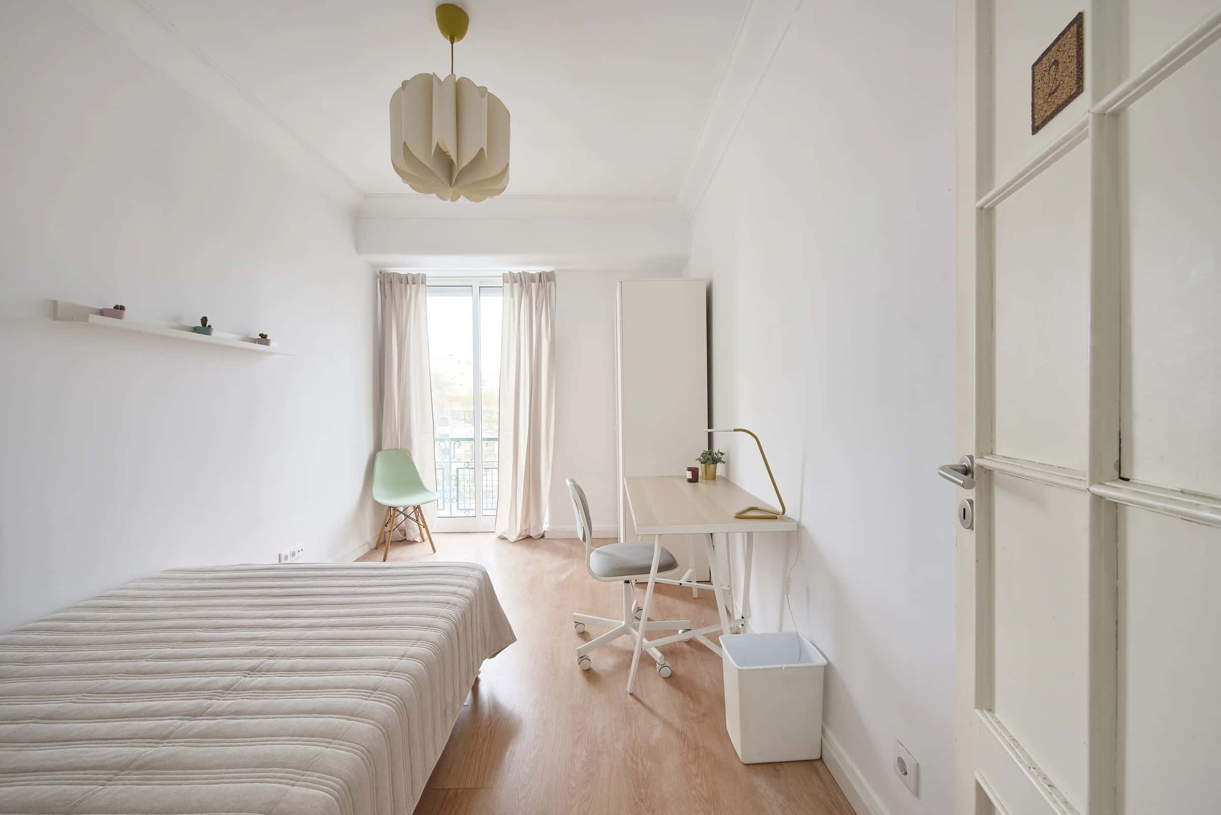 EN Situated on the fourth floor, this spacious apartment in Areeiro offers the ideal balance between comfort and convenience. Located in one of Lisbon’s most central and well-connected neighborhoods, it provides easy access to everything you need for everyday life. You’ll find cafés, restaurants, supermarkets, and local shops just a few minutes away, making daily life practical and pleasant. The area provides excellent public transport connections, with Areeiro metro station (Green Line) and several Carris bus routes nearby, allowing quick access to Lisbon’s main areas such as Baixa, Marquês de Pombal, and Parque das Nações. The apartment has 6 bedrooms, a fully equipped kitchen, 3 bathrooms (1 shared and 2 en-suite), offering comfort and convenience in the common areas. Areeiro is one of Lisbon’s most elegant and well-connected neighborhoods, known for its wide avenues, charming architecture, and convenient city living. It’s a calm yet central area, perfect for those who want easy access to all parts of Lisbon without being in the middle of the tourist hustle. You’ll find cafés, traditional bakeries, supermarkets, restaurants, and local shops all within walking distance, offering everything you need for comfortable everyday living. A Pingo Doce supermarket is just a 5-minute walk away, along with several cafés and small grocery stores nearby. The neighborhood has excellent public transport connections, with Areeiro metro station (Green Line) just a few minutes away, providing quick access to Baixa/Chiado, Marquês de Pombal, and Parque das Nações. Several Carris bus routes and train services from Roma-Areeiro station also make it easy to reach other areas of the city and beyond. With its convenient transport links, quiet streets, and variety of nearby services, Areeiro is the perfect place to enjoy comfortable city life in Lisbon. Metro: The Areeiro metro station (Green Line) is just a few minutes away, providing quick connections to Baixa/Chiado, Marquês de Pombal, Alameda, and Parque das Nações. Train: The Roma-Areeiro train station is also nearby, offering direct access to areas like Entrecampos, Sete Rios, and other parts of Lisbon’s metropolitan region. Buses: Several Carris bus routes pass through the area, including lines 206, 208, 705, 708, 722, 735, and 736, ensuring easy connections to different parts of the city. In short, Areeiro offers excellent public transport links, making it easy to move around Lisbon quickly and conveniently. - Praça Francisco Sá Carneiro – The main square of the neighborhood, surrounded by cafés, restaurants, and shops — a pleasant spot for a coffee or a walk. - Avenida de Roma – One of Lisbon’s most well-known avenues, filled with stores, bakeries, and local services, giving the area a lively and urban feel. - Instituto Superior Técnico (IST) – One of Portugal’s top universities, just a short walk away, adding a vibrant student atmosphere to the area. - Jardim Fernando Pessa – A small, quiet green space ideal for relaxing outdoors or reading under the trees. - Roma-Areeiro Station – A key transport hub connecting metro, train, and several bus lines, ensuring great mobility across Lisbon. - With its combination of local life, accessibility, and green spaces, Areeiro offers a comfortable and convenient environment in the heart of Lisbon. - No smoking.- No pets allowed.- No parties.- Trash must be taken out daily.- Short-term visitors are allowed (2 days). Longer period: €20 per day.- Utilities: included up to €25 per tenant.- Cleaning: offered by the landlord.- Bedding: pillows, duvet, and bed sheets are not provided.- Payment before check-in: first and last month, deposit and admin fee.- Check-ins: from Monday to Saturday from 4pm until 7:30pm. No check-ins on Sundays and bank holidays. Check-in is authorized only 24h after the payment is confirmed in our bank account and the contract is signed. The bedroom is a cozy and comfortable space, designed to offer residents a peaceful and restful environment. The room features a cozy double bed, a desk, a chair, and storage space for your belongings.