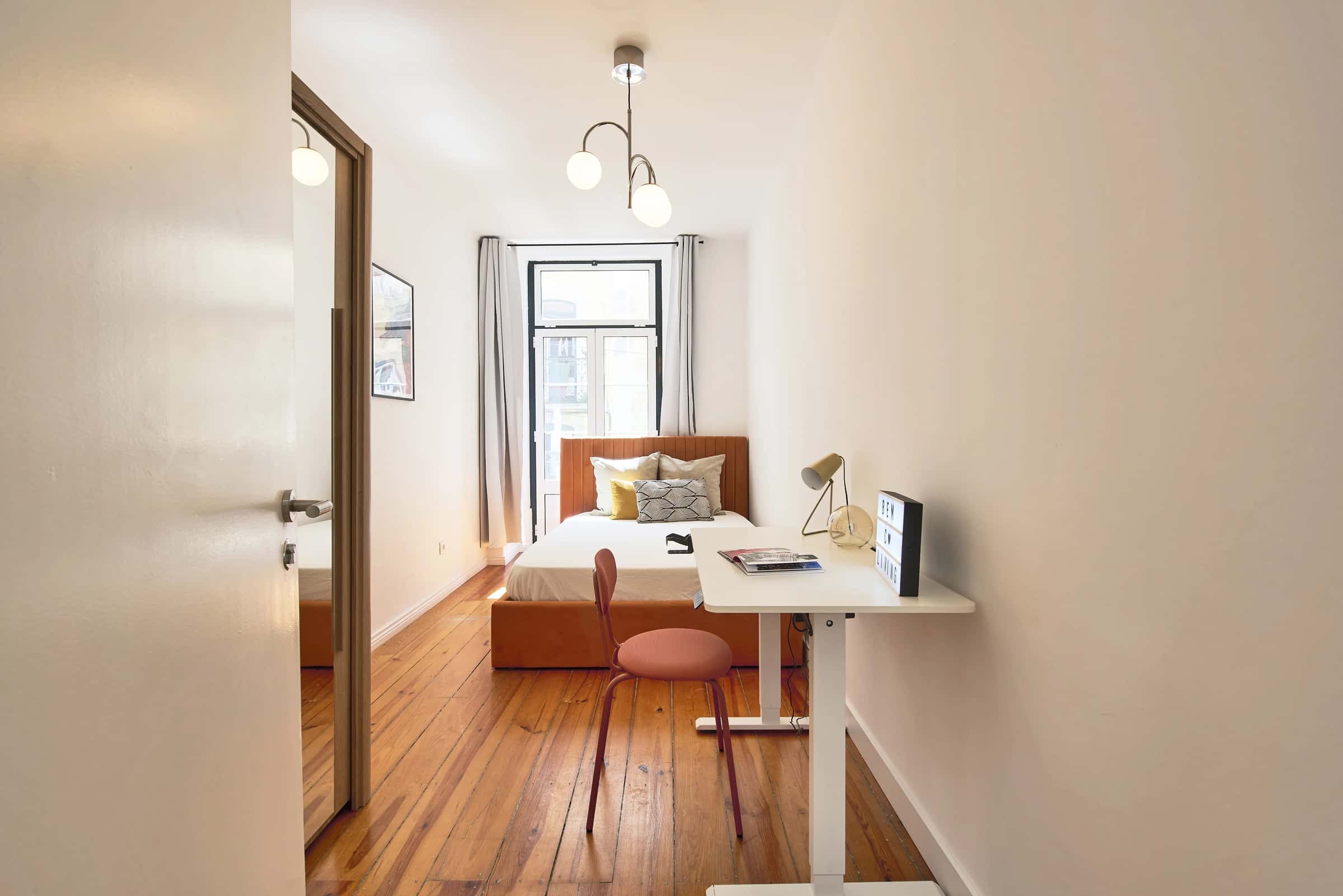 EN This bright and recently renovated apartment in Graça offers a comfortable and modern living experience in one of Lisbon’s most traditional neighborhoods. With 13 bedrooms and shared 4 bathrooms, it provides plenty of space and privacy for all residents, ideal for students, young professionals, or anyone looking to enjoy the authentic atmosphere of Lisbon while staying in a convenient and well-connected area.The apartment features a fully equipped kitchen with modern appliances and bright common areas that receive plenty of natural light throughout the day. Its great location makes daily life easy and enjoyable, just a 5-minute walk from the nearest supermarket, 6 minutes from the Graça tram stop, and around 8 minutes from the Santa Apolónia train and metro stations, ensuring quick access to all parts of the city. Graça is one of Lisbon’s most charming and historic neighborhoods, known for its local cafés, traditional bakeries, and panoramic viewpoints overlooking the city and the river. Despite its old Lisbon charm, the area is also well served by shops, restaurants, and essential services, offering a perfect blend of history, comfort, and convenience. Trams & Buses: The famous Tram 28 and several Carris bus lines pass through Graça, providing direct access to Baixa, Alfama, Areeiro, and Cais do Sodré.Metro & Trains: The Santa Apolónia metro and train station is about 8 minutes away on foot, offering connections to the Blue Line (Linha Azul) and regional trains to other parts of Portugal.With excellent tram, bus, and metro connections, getting around Lisbon from Graça is easy, fast, and scenic. - Miradouro da Senhora do Monte – One of Lisbon’s most iconic viewpoints with breathtaking city views.- Castelo de São Jorge – A historic landmark just a short walk away.- Feira da Ladra – Lisbon’s famous flea market, full of vintage treasures.- Igreja da Graça – A beautiful church with stunning architecture and views.- Alfama – The neighboring district, known for its Fado houses and winding streets.Graça combines Lisbon’s historic soul with modern convenience — making this bright and renovated apartment a perfect place to enjoy the best of the city’s authentic lifestyle. - No smoking.- No pets allowed.- No parties.- Trash must be taken out daily.- Short-term visitors are allowed (2 days). Longer period: €20 per day.- Utilities: included up to €25 per tenant.- Cleaning: offered by the landlord.- Bedding: pillows, duvet, and bed sheets are not provided.- Payment before check-in: first and last month, deposit and admin fee.- Check-ins: from Monday to Saturday from 4pm until 7:30pm. No check-ins on Sundays and bank holidays. Check-in is authorized only 24h after the payment is confirmed in our bank account and the contract is signed. The bedroom is a cozy and comfortable space, designed to offer residents a peaceful and restful environment. The room features a cozy double bed, a desk, a chair, and storage space for your belongings.