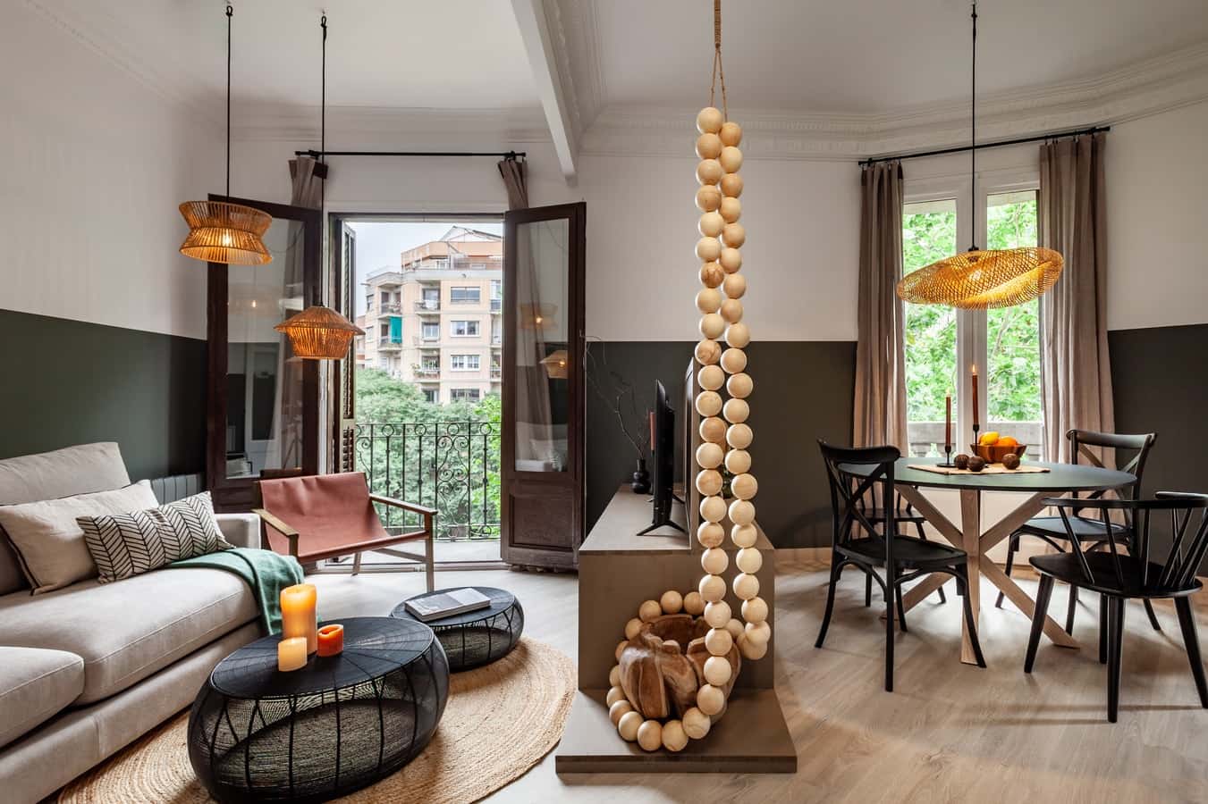 EN Our mission is to empower individuals to immerse themselves in new places by having a home wherever they go. We do this by providing artfully designed fully furnished and serviced apartments for stays of one month or more. We are currently present in some of the most important cities in Europe As lush and green as the jungle, Vili is an 80 square meter apartment located in the Sant Antoni neighborhood of Barcelona. Right in the heart of the city, in a place that’s rich with restaurants, cafes, and bars, this apartment with 1 double bedroom and 1 single bedroom, 1 bathroom, and an office is hard to miss. For comfort, this apartment also comes with air conditioning in the living room and in one bedroom. Fully furnished with everything you need, including bedding, linens, and a fully equipped kitchen, Vili is artfully decorated with unique woven baskets and wooden beading hanging from the ceiling, as an ode to the complex jungle environment. The french balconies bring a breath of life into the apartment and help transform this green space into a home. *We welcome pets, fees are subject to apply. Guests will be informed of any additional charges in the final contract. *We cannot be held liable for any noises (construction, or street noise) done outside the apartment. We also cannot be liable for any rooms without air conditioning (all the rooms with air conditioner will be explicitly explained in our description). We will not accept any reservation cancellations or refund request related to these two issues. *Our in-house design team expertly selects all apartment furniture and decor to ensure the highest level of quality and comfort. As part of consistent home upkeep, design improvements, and photo staging, there may be minor differences in furnishings seen in the photos and what you find in the apartment. Inquire with a sales agent for any questions or doubts. *This accommodation may only be used for stays longer than 31 nights for personal purposes such as holiday, recreational, or leisure. The information provided may be submitted to the relevant registry and/or administrative authority in accordance with Catalan regulations. NRA ESFCNT00000806900099576300000000000000000000000000001