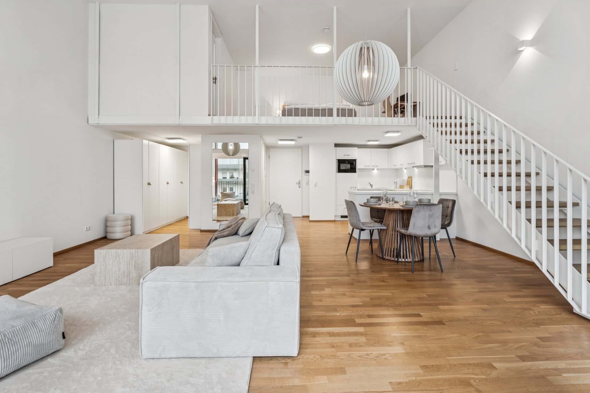 Dieses außergewöhnliche, voll möblierte Loft im ersten Obergeschoss bietet auf ca. 88 m² ein modernes Wohnkonzept mit beeindruckender Deckenhöhe von 4,5 Metern und offener Galerie. Großzügige Fensterflächen, klare Linien und hochwertige Materialien schaffen ein lichtdurchflutetes, urbanes Wohnambiente. Der offen gestaltete Wohnbereich überzeugt durch seine Weite und Helligkeit. Er ist stilvoll möbliert mit einem komfortablen Sofa, welches bei Bedarf zu einem Schlafsofa umfunktioniert werden kann, einem 65“ Samsung Smart-TV sowie einem Essbereich für bis zu vier Personen. Von hier aus gelangen Sie auf den großen, tagsüber sonnigen Balkon, welcher zum Entspannen einlädt. Hier ist ebenfalls für ausreichend Sitzmöglichkeiten gesorgt. Die moderne Einbauküche ist vollständig ausgestattet und in den Wohnbereich integriert. Über die innenliegende Treppe erreichen Sie den Schlafbereich auf der Galerieebene. Das 180 x 200 cm große Boxspringbett sorgt für erholsamen Schlaf, während das angrenzende Badezimmer mit Badewanne eine private Wohlfühloase schafft. Ein integrierter Waschtrockner unterstreicht die durchdachte Einrichtung. Ein separates Gäste-WC im unteren Bereich erhöht den Komfort im Alltag. Der integrierte Arbeitsplatz mit höhenverstellbarem Schreibtisch und einer schnellen 100Mbit/s Internet-Leitung ermöglicht produktives Arbeiten im Homeoffice. Ein separater Schrankbereich bietet großzügige Staumöglichkeiten. Die Miete versteht sich als Pauschalmiete und beinhaltet: • Strom • Internet (WLAN) • Rundfunkgebühren (GEZ) • Tiefgaragenstellplatz • Waschmaschine/Trockner • sämtliche Nebenkosten