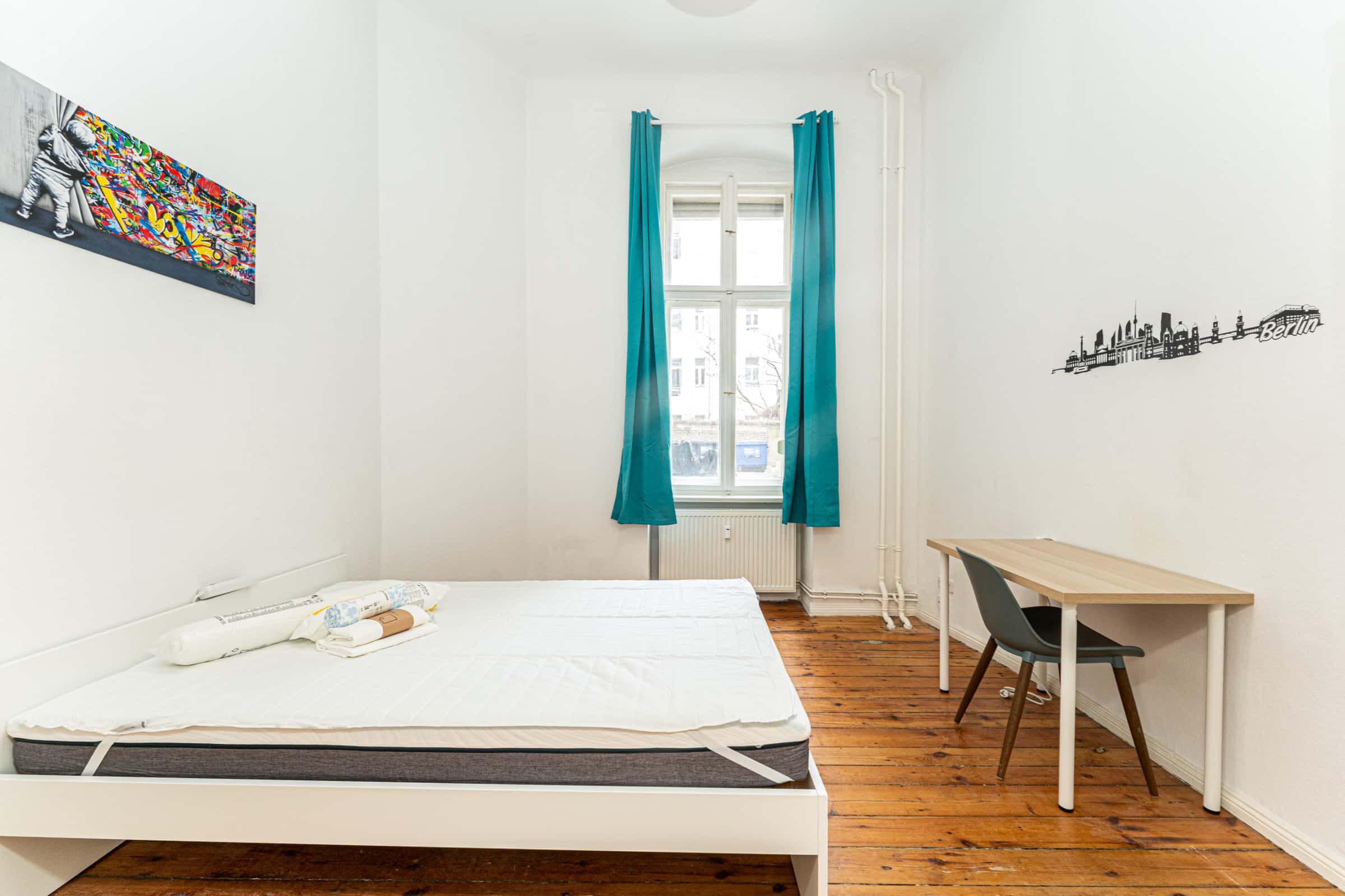 EN Enjoy your stay in this beautiful and bright room in a freshly renovated shared apartment! Located in a dynamic district in Berlin, this room will become your nest in the lively city. Your cosy room will be fully furnished with bed (incl. mattress, blanket and pillow), desk and chair, wardrobe, shelf, curtains. hanging and/or standing lamp. Heating, electricity, water, and internet are included in the price. Public transport connections are easily reachable nearby and you will find many restaurants, supermarkets and shops in the area. Check-in is possible from Monday to Firday, from 9AM to 2PM. DE Genieß deinen Aufenthalt in diesem schönen und hellen Zimmer in einem frisch renovierten Apartment! In einem dynamischen Stadtteil Berlins gelegen, wird dieses Zimmer zu deinem Rückzugsort in der lebendigen Stadt. Dein gemütliches Zimmer ist komplett eingerichtet mit Bett (inkl. Matratze, Decke und Kissen), Schreibtisch und Stuhl, Kleiderschrank, Regal, Vorhängen, Hänge- und/oder Stehlampe. Heizung, Strom, Wasser und Internet sind im Preis inkludiert. Öffentliche Verkehrsmittel sind in der Nähe und leicht erreichbar. In der Umgebung findest du viele Restaurants, Supermärkte und Geschäfte. Check-in ist möglich von Montag bis Freitag, von 9 bis 14 Uhr.