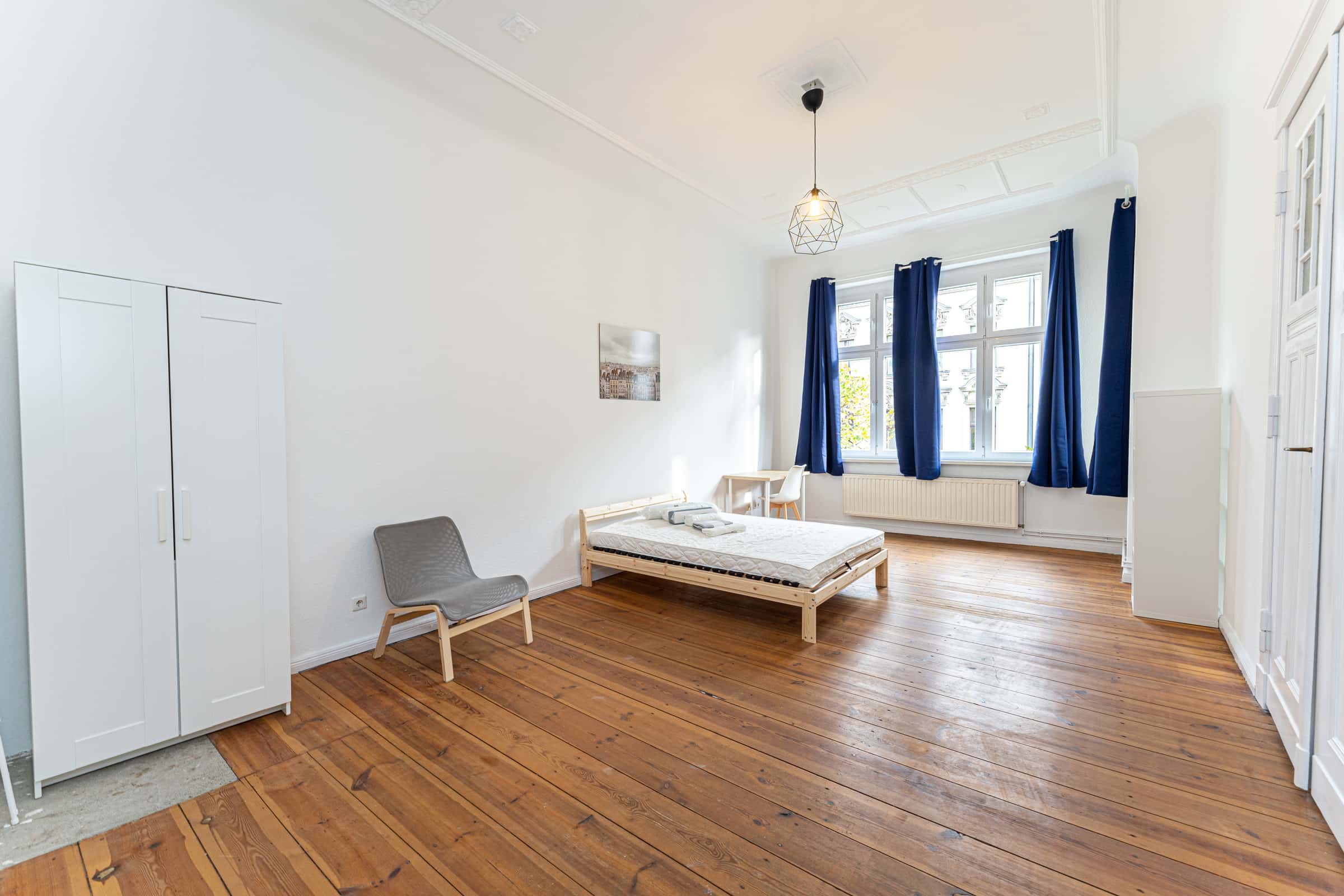 EN Enjoy your stay in this beautiful and bright room in a freshly renovated shared apartment! Located in a dynamic district in Berlin, this room will become your nest in the lively city. Your cosy room will be fully furnished with bed (incl. mattress, blanket and pillow), desk and chair, wardrobe, shelf, curtains. hanging and/or standing lamp. Heating, electricity, water, and internet are included in the price. Public transport connections are easily reachable nearby and you will find many restaurants, supermarkets and shops in the area. Check-in is possible from Monday to Firday, from 9AM to 2PM. DE Genieß deinen Aufenthalt in diesem schönen und hellen Zimmer in einem frisch renovierten Apartment! In einem dynamischen Stadtteil Berlins gelegen, wird dieses Zimmer zu deinem Rückzugsort in der lebendigen Stadt. Dein gemütliches Zimmer ist komplett eingerichtet mit Bett (inkl. Matratze, Decke und Kissen), Schreibtisch und Stuhl, Kleiderschrank, Regal, Vorhängen, Hänge- und/oder Stehlampe. Heizung, Strom, Wasser und Internet sind im Preis inkludiert. Öffentliche Verkehrsmittel sind in der Nähe und leicht erreichbar. In der Umgebung findest du viele Restaurants, Supermärkte und Geschäfte. Check-in ist möglich von Montag bis Freitag, von 9 bis 14 Uhr.