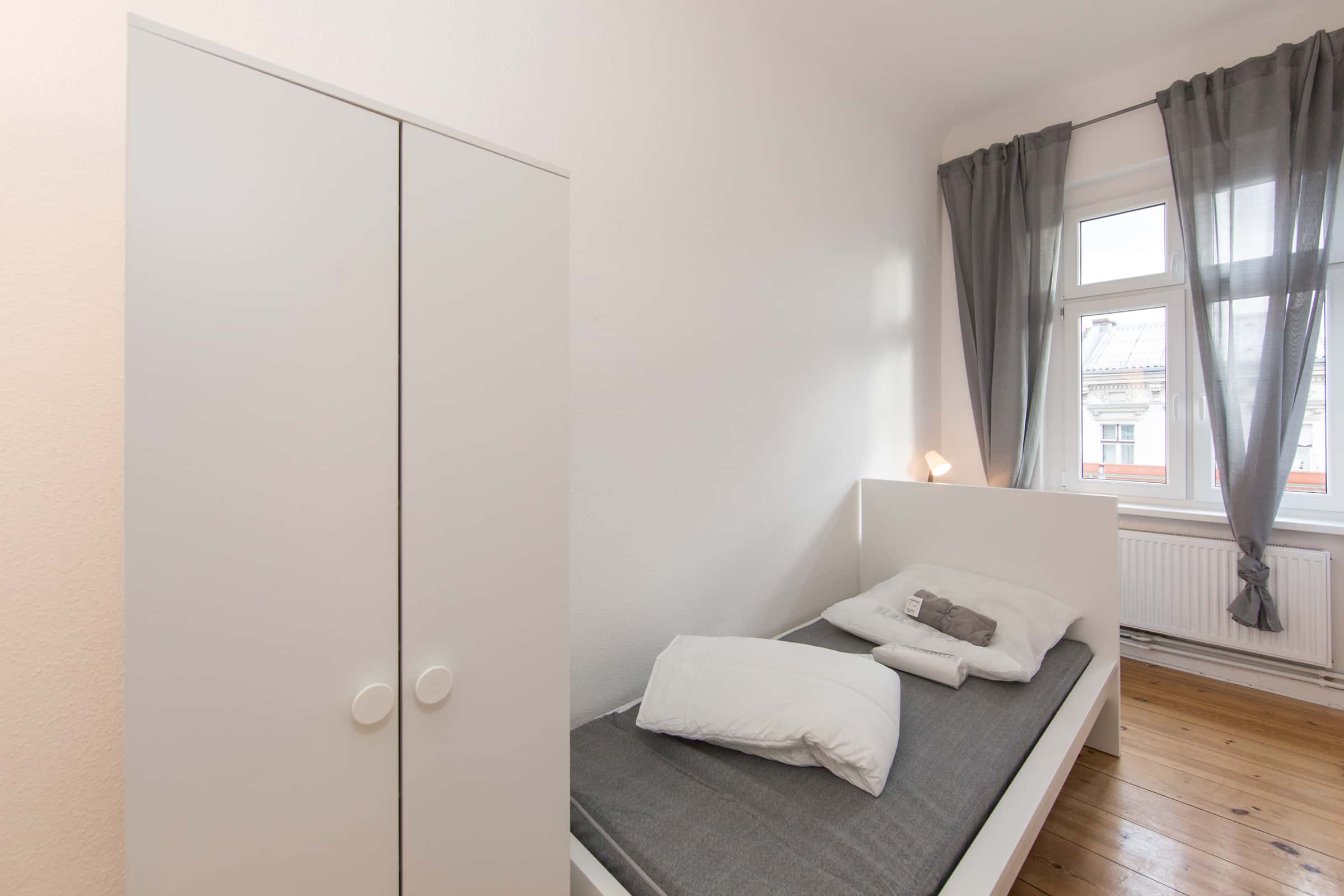 EN Enjoy your stay in this beautiful and bright room in a freshly renovated shared apartment! Located in a dynamic district in Berlin, this room will become your nest in the lively city. Your cosy room will be fully furnished with bed (incl. mattress, blanket and pillow), desk and chair, wardrobe, shelf, curtains. hanging and/or standing lamp. Heating, electricity, water, and internet are included in the price. Public transport connections are easily reachable nearby and you will find many restaurants, supermarkets and shops in the area. Check-in is possible from Monday to Firday, from 9AM to 2PM. DE Genieß deinen Aufenthalt in diesem schönen und hellen Zimmer in einem frisch renovierten Apartment! In einem dynamischen Stadtteil Berlins gelegen, wird dieses Zimmer zu deinem Rückzugsort in der lebendigen Stadt. Dein gemütliches Zimmer ist komplett eingerichtet mit Bett (inkl. Matratze, Decke und Kissen), Schreibtisch und Stuhl, Kleiderschrank, Regal, Vorhängen, Hänge- und/oder Stehlampe. Heizung, Strom, Wasser und Internet sind im Preis inkludiert. Öffentliche Verkehrsmittel sind in der Nähe und leicht erreichbar. In der Umgebung findest du viele Restaurants, Supermärkte und Geschäfte. Check-in ist möglich von Montag bis Freitag, von 9 bis 14 Uhr.