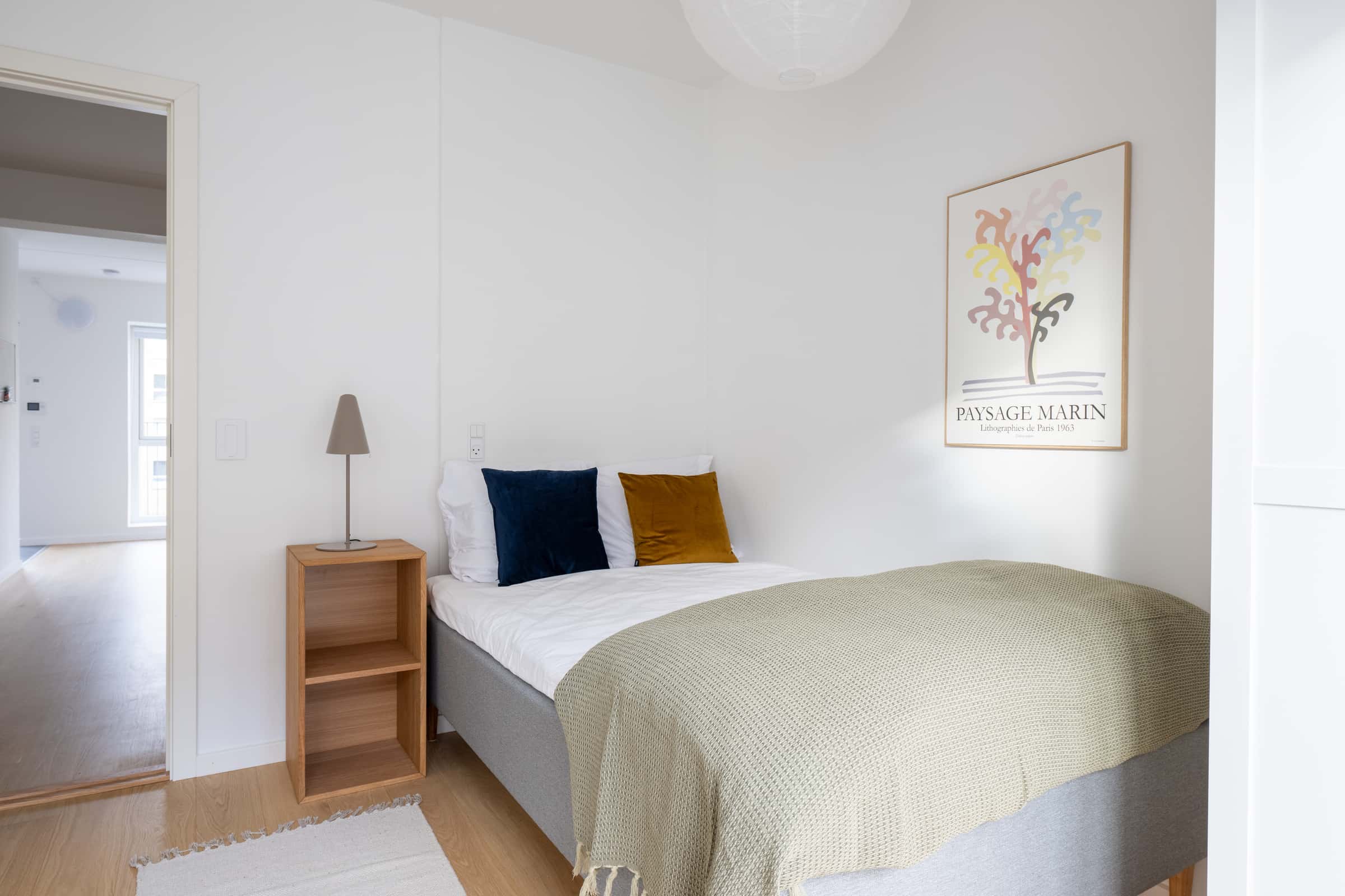 High-quality bed with bedspread, duvet and pillows. Bedside table with reading lamp. Desk with desk chair and desk lamp. Wardrobe with drawers and hanging space. Storage boxes underneath the bed. Curtains, mirror, laundry basket, trash can, rugs and decoration (not all on photos)