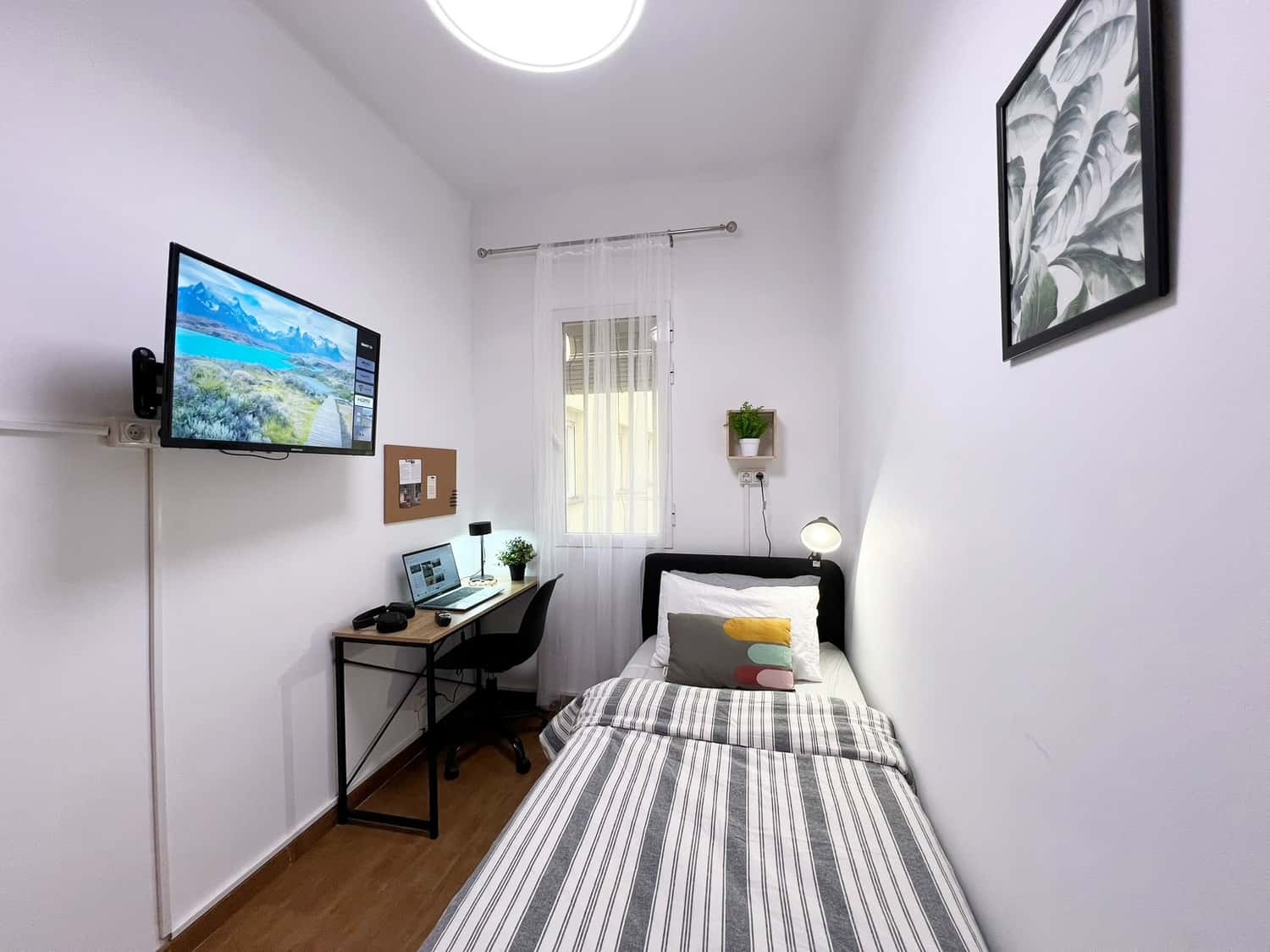 Características de la habitación: Habitación con medida de 5.48mtrs2. Cama individual de 90 cm. Smart TV 32”. Armario. Espacio de trabajo, con escritorio y silla. Ventana interior con vista al patio. Cerradura en la habitación. Piso de siete habitaciones y dos baños, ubicado en la segunda planta (con ascensor). La cocina está equipada con todos los electrodomésticos, utensilios y menaje necesarios. Los baños cuentan con espacio de almacenaje para tus enseres personales. Condiciones de Alquiler: DNI, NIE o Pasaporte. Mes corriente. Depósito de seguridad reembolsable (ciertas condiciones aplican). Se solicita un pago único al momento de la entrada, para gastos de gestión y mantenimiento (este importe puede variar según la temporada). Las habitaciones no incluyen: Ropa de cama, mantas o toallas. Horario de Check-in: Horario: 14:30 - 18:30 de lunes a viernes en la oficina del propietario. Los check-ins fuera del horario habitual, durante fines de semana y días festivos, son una excepción y sólo podrán realizarse si han sido autorizados previamente. Además, tendrán un cargo adicional de 30 euros. Por favor, consulta antes de planificar tu llegada en horarios distintos, puesto que no se garantiza la disponibilidad. Normas: No se permiten mascotas y está prohibido fumar. Los límites de edad establecidos para el alquiler son entre los 18 y 39 años. Transporte: - Tienes la Estación Príncipe Pío (Línea 6 y 10 del Metro) y la Estación de Metro Puerta del Ángel (Línea 6), a 15 minutos caminando. - Parada de los autobuses 36, 50 y 62 “Virgen del Puerto - Fósforo” a 2 minutos caminando.