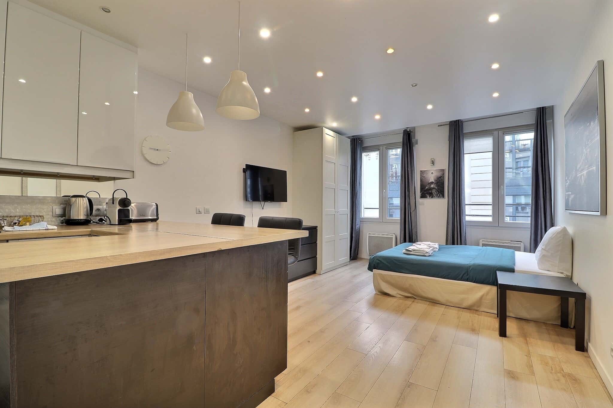 [FR] Cet appartement de 24 m² , Studio, est situé rue Poissonniere dans le 2ème arrondissement , au 4ème étage d'un immeuble du 19ème siècle sans ascenseur et il peut accueillir 2 personnes. Cet appartement est équipé avec : un lave linge, un sèche linge, un lave-vaisselle, les chaines cablées, la télévision, un accès internet haut débit illimité avec le wifi, un téléphone. L'immeuble du 19ème siècle sans ascenseur est équipé avec : un code d entrée. [EN] This 24 m² apartment, Studio, is located rue Poissonniere in the 2nd arrondissement, on the 4th floor of a 19th century building without elevator, and can accommodate 2 people. This apartment is equipped with: washing machine, tumble dryer, dishwasher, cable channels, television, unlimited broadband internet access with wifi, telephone. The 19th-century building has no elevator and is equipped with: an entry code.
