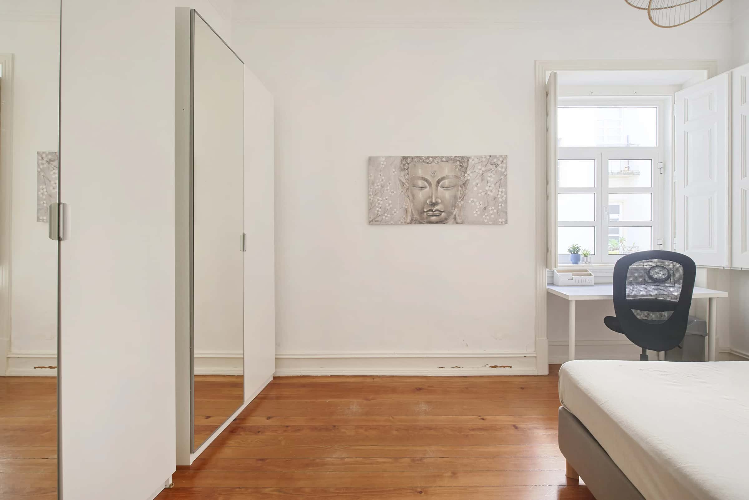 EN Located in one of Lisbon’s most vibrant and fast-growing neighborhoods, this apartment offersthe ideal mix of comfort, space, and convenience. You’ll be surrounded by cafés,supermarkets, pharmacies, and local shops, with everything you need just a few minutesaway. Supermarkets are only a 5-minute walk from the apartment, making daily life easy andpractical.Situated on the ground floor, the apartment features a well-equipped kitchen and 3 bathrooms, providing comfort and practicality in the shared spaces. With 7 bedrooms, this apartment combines space, functionality and a great location, perfect for students or young professionals looking to enjoy Lisbon life ina lively and well-connected neighborhood. Alcântara is one of Lisbon’s most vibrant and up-and-coming neighborhoods, perfectly balancing tradition and modern lifestyle. Located between the city center and Belém, the area is known for its riverside charm, trendy restaurants, and lively atmosphere. You’ll find cafés, supermarkets, restaurants, and local shops all within walking distance, making daily life easy and convenient. A Pingo Doce supermarket is just a 5-minute walk away, along with several cafés and grocery stores nearby. Alcântara is also home to the famous LX Factory, a creative hub full of cafés, boutiques, art galleries, and cultural events. With its unique mix of local authenticity and youthful energy, Alcântara offers an exciting place to live in Lisbon — full of life, culture, and convenience. Train: The neighborhood is served by two train stations — Alcântara-Terra and Alcântara-Mar — offering direct connections to Cais do Sodré, Belém, and Cascais. Buses and Trams: Several Carris bus lines and the iconic tram 15E pass through the area, providing easy access to Baixa, Belém, and Praça do Comércio. Driving and Cycling: Alcântara has quick access to major roads like Avenida 24 de Julho and Ponte 25 de Abril, and offers new cycling paths along the riverside. With so many transport options, getting around Lisbon from Alcântara is quick and easy, whether by train, tram, or bus. LX Factory – A must-visit creative complex filled with cafés, concept stores, restaurants, art galleries, and weekly markets. Docas de Santo Amaro – A beautiful riverside area with bars and restaurants overlooking the 25 de Abril Bridge. Ponte 25 de Abril Viewpoint – An impressive spot offering panoramic views of the bridge and the Tagus River. Museu do Oriente – A fascinating museum dedicated to Asian art and Portuguese exploration history. Tapada das Necessidades Park – A quiet green park ideal for walks, picnics, or a break from the city buzz. From its creative spirit and river views to its great transport links and lively social scene, Alcântara is one of Lisbon’s most exciting neighborhoods to live in. - No smoking.- No pets allowed.- No parties.- Trash must be taken out daily.- Short-term visitors are allowed (2 days). Longer period: €20 per day.- Utilities: included up to €25 per tenant.- Cleaning: offered by the landlord.- Bedding: pillows, duvet, and bed sheets are not provided.- Payment before check-in: first and last month, deposit and admin fee.- Check-ins: from Monday to Saturday from 4pm until 7:30pm. No check-ins on Sundays and bank holidays. Check-in is authorized only 24h after the payment is confirmed in our bank account and the contract is signed. The bedroom is a cozy and comfortable space, designed to offer residents a peaceful and restful environment. The room features a cozy double bed, a desk, a chair, and storage space for your belongings.