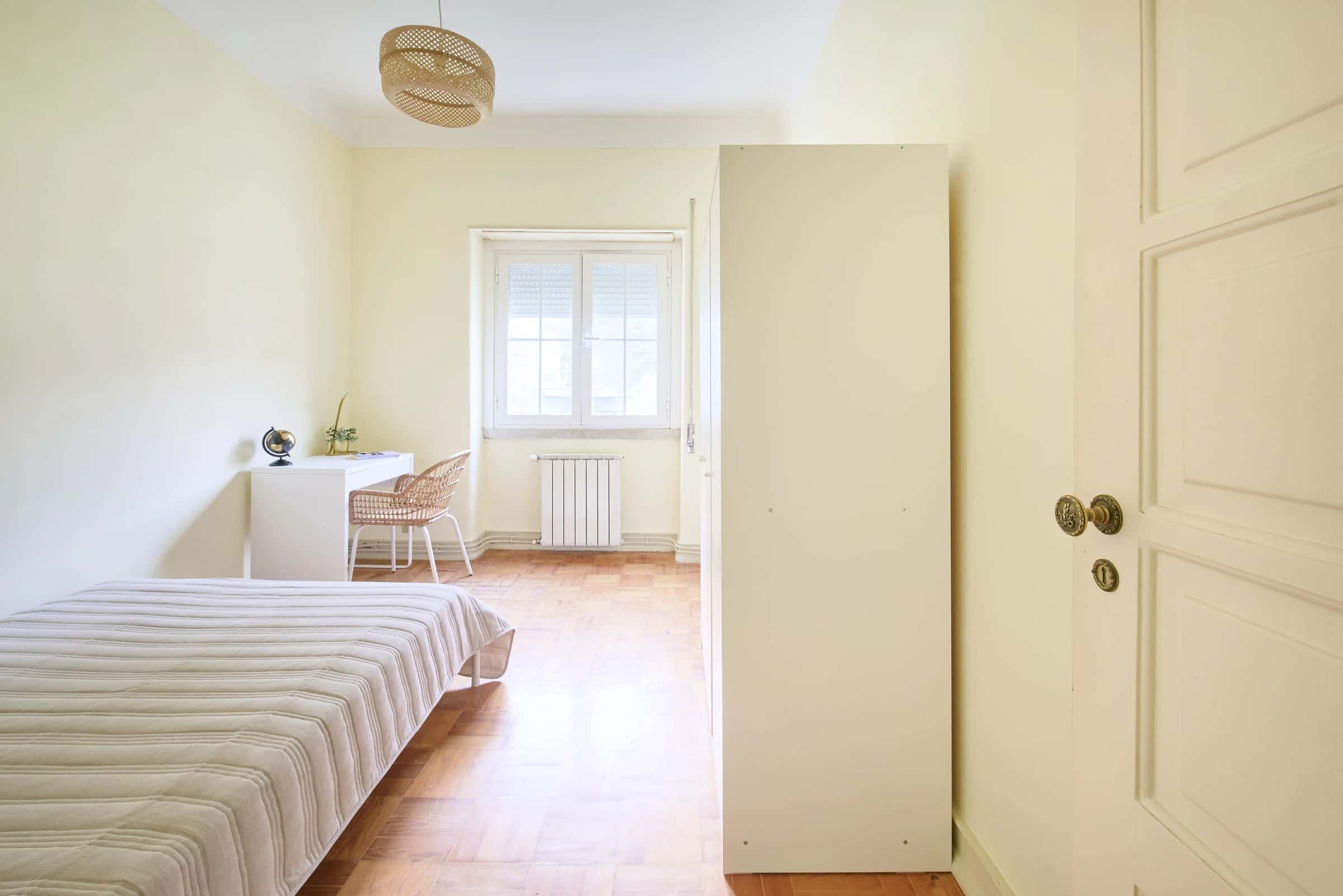 EN Situated on the first floor, this spacious apartment in Alvalade offers the perfect mix of comfort and convenience. Located in one of Lisbon’s most traditional and well-connected neighborhoods, it provides a calm residential atmosphere with everything you need close by. You’ll find cafés, restaurants, supermarkets, and local shops just a short walk away, making daily life practical and comfortable. The area has excellent public transport connections, with the Alvalade metro station (Green Line) and several Carris bus routes nearby, providing quick access to Lisbon’s main areas such as Saldanha, Baixa/Chiado, and Campo Grande. The apartment features 6 bedrooms, a fully equipped kitchen, and 2 bathrooms, offering comfort and practicality in the shared spaces. Alvalade is one of Lisbon’s most traditional and desirable neighborhoods, known for its tree-lined streets, peaceful atmosphere, and excellent quality of life. It’s a well-balanced area that combines a residential feel with the convenience of having everything close by. You’ll find cafés, restaurants, supermarkets, and local shops within walking distance, as well as parks and green areas that give the neighborhood its unique charm. The Alvalade metro station (Green Line) and several Carris bus routes are just a few minutes away, offering quick access to Saldanha, Baixa/Chiado, and Campo Grande. With its great location, calm streets, and easy access to daily essentials, Alvalade is the perfect neighborhood for comfortable and authentic Lisbon living. Metro: The Alvalade metro station (Green Line) is the main connection, providing fast access to Saldanha, Baixa-Chiado, and Cais do Sodré in less than 15 minutes. Buses: Multiple Carris bus lines serve the area, including routes that connect Alvalade with Campo Grande, Areeiro, and Marquês de Pombal. Cycling and Driving: Alvalade has wide, organized streets and new cycle paths, making it easy to move around by bike or car. With excellent public transport and safe, walkable streets, Alvalade offers quick and comfortable connections to the entire city. - Avenida da Igreja – The main avenue of Alvalade, full of cafés, pastry shops, and local stores. - Jardim do Campo Grande – A large nearby park perfect for walks, picnics, or outdoor exercise. - Mercado de Alvalade Norte – A traditional market offering fresh produce, flowers, and local goods. - Museu de Lisboa – Palácio Pimenta – A museum surrounded by gardens, showcasing the history of Lisbon. - Cidade Universitária – The main campus of the University of Lisbon, only a short metro ride away. - From its peaceful charm and local cafés to its excellent transport connections and green spaces, Alvalade is one of Lisbon’s most welcoming neighborhoods to live in. - No smoking.- No pets allowed.- No parties.- Trash must be taken out daily.- Short-term visitors are allowed (2 days). Longer period: €20 per day.- Utilities: included up to €25 per tenant.- Cleaning: offered by the landlord.- Bedding: pillows, duvet, and bed sheets are not provided.- Payment before check-in: first and last month, deposit and admin fee.- Check-ins: from Monday to Saturday from 4pm until 7:30pm. No check-ins on Sundays and bank holidays. Check-in is authorized only 24h after the payment is confirmed in our bank account and the contract is signed. The bedroom is a cozy and comfortable space, designed to offer residents a peaceful and restful environment. The room features a cozy double bed, a desk, a chair, and storage space for your belongings.