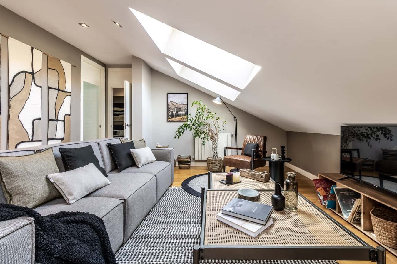 Welcome to Lecina, a stunning attic apartment located in the charming neighborhood of Goya, Madrid. This neighborhood does not lack in luxury with its grand boulevards lined with upscale shops and restaurants and its close proximity to Retiro park. After exploring, come home to this spacious and bright 119 square meter mountain theme apartment. Lecina features two cozy double bedrooms with throw carpets in accordance to the mountain theme. Both rooms feature queen size beds to provide you with maximum comfort and restful nights. The apartment also boasts two modern and stylish bathrooms, one of which is ensuite and with a bathtub, so you can indulge in a relaxing bath after a long day exploring the city. The living room is the heart of the apartment, with skylights that bring in natural light and create a warm and inviting atmosphere. The pops of green from plants and stone-like wall hangings bring the mountain theme to life. The living room is equipped with a full entertainment system, perfect for movie nights or streaming your favorite TV shows. A dedicated workstation is also available for those who need to get some work done. The dining table is located in the living room and can accommodate up to four people, making it ideal for enjoying meals with friends or family. The fully furnished kitchen is equipped with all the necessary appliances and utensils to cook up delicious meals, including a dishwasher for easy cleanup. Air conditioning is available in all rooms to keep you cool during the hot summer months. The apartment also includes a cellar for storage and disabled access, making it easy for everyone to enjoy. Fully furnished, this apartment comes with everything you need, including bedding and linens. *We welcome pets, fees are subject to apply. Guests will be informed of any additional charges in the final contract. *We cannot be held liable for any noises (construction, or street noise) done outside the apartment. We also cannot be liable for any rooms without air conditioning (all the rooms with air conditioner will be explicitly explained in our description). We will not accept any reservation cancellations or refund requests related to these two issues. *Our in-house design team expertly selects all apartment furniture and decor to ensure the highest level of quality and comfort. As part of consistent home upkeep, design improvements, and photo staging, there may be minor differences in furnishings seen in the photos and what you find in the apartment. Inquire with a sales agent for any questions or doubts.