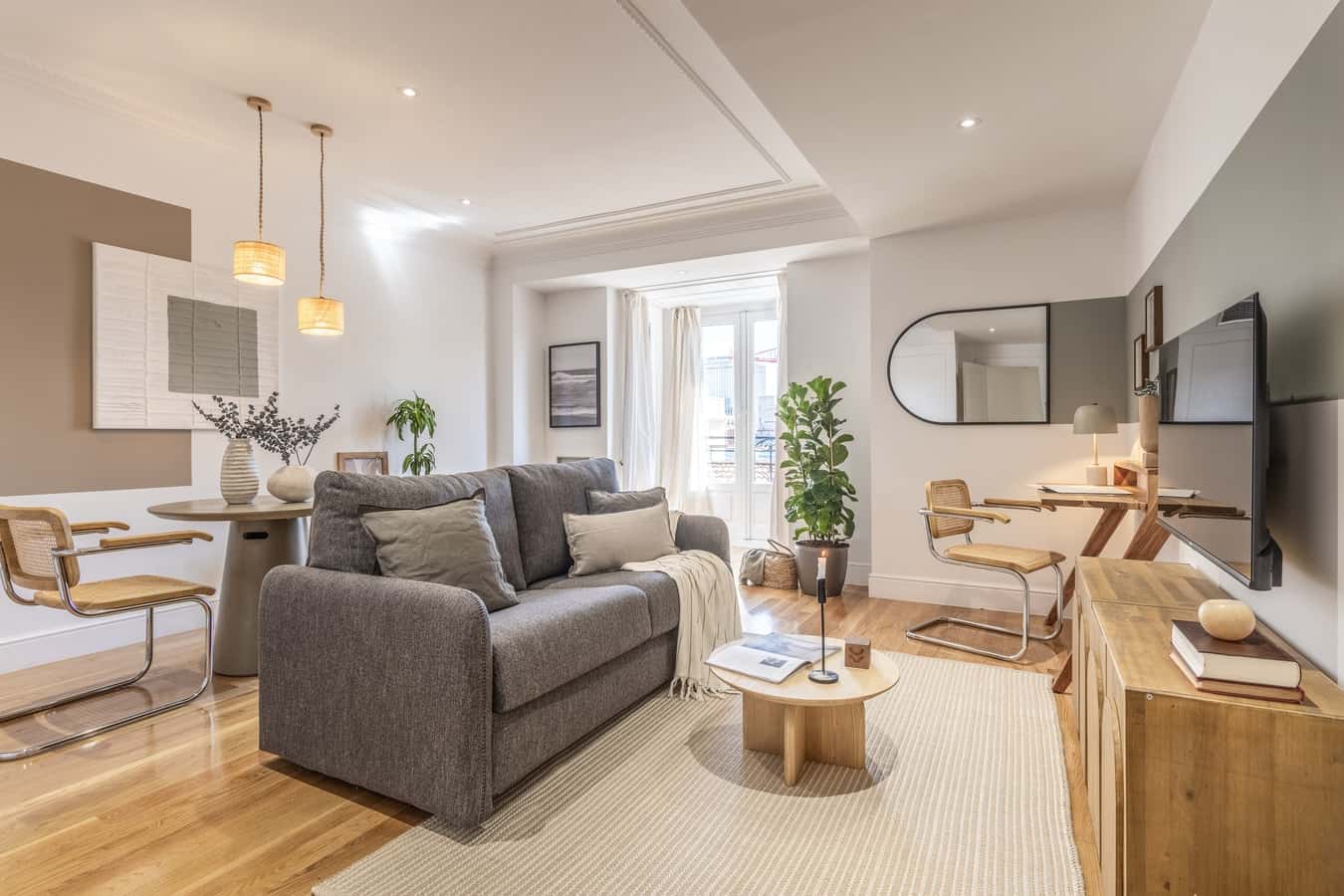 Welcome to Fratta, an inviting haven nestled in the prestigious Almagro neighborhood of Madrid. This upscale neighborhood has restaurants and boutiques a plenty right outside your front door. This delightful 66-square-meter retreat seamlessly blends comfort, style, and coastal charm, offering you a captivating sanctuary to enhance your stay in this vibrant city. Fratta features one thoughtfully designed bedroom adorned with a luxurious queen-size bed, promising nights of peaceful rest. An additional sofa bed in the living room ensures ample space for relaxation without compromising on comfort. The marbled tile bathroom is chic and functional in design. The heart of this residence lies within its living room, a meticulously curated space infused with a tranquil coastal atmosphere, evoking the soothing ambiance of a seaside getaway. Enjoy the entertainment system for immersive leisure, and utilize the dedicated workstation to catch up on emails or plan your city adventures. The adjacent dining table beckons for memorable gatherings over delectable dishes. The fully furnished kitchen stands ready to cater to your culinary aspirations, equipped with modern appliances and all the essentials you need for delightful meals. Air conditioning ensures your comfort even during the warmest days, while the attentive presence of a doorman enhances your sense of security and convenience. Fully furnished, this apartment comes with everything you need, including bedding and linens. *This apartment comes equipped with a ducted air system for absolute comfort. *We welcome pets, fees are subject to apply. Guests will be informed of any additional charges in the final contract. *We cannot be held liable for any noises (construction, or street noise) done outside the apartment. We also cannot be liable for any rooms without air conditioning (all the rooms with air conditioner will be explicitly explained in our description). We will not accept any reservation cancellations or refund requests related to these two issues. *Our in-house design team expertly selects all apartment furniture and decor to ensure the highest level of quality and comfort. As part of consistent home upkeep, design improvements, and photo staging, there may be minor differences in furnishings seen in the photos and what you find in the apartment. Inquire with a sales agent for any questions or doubts.