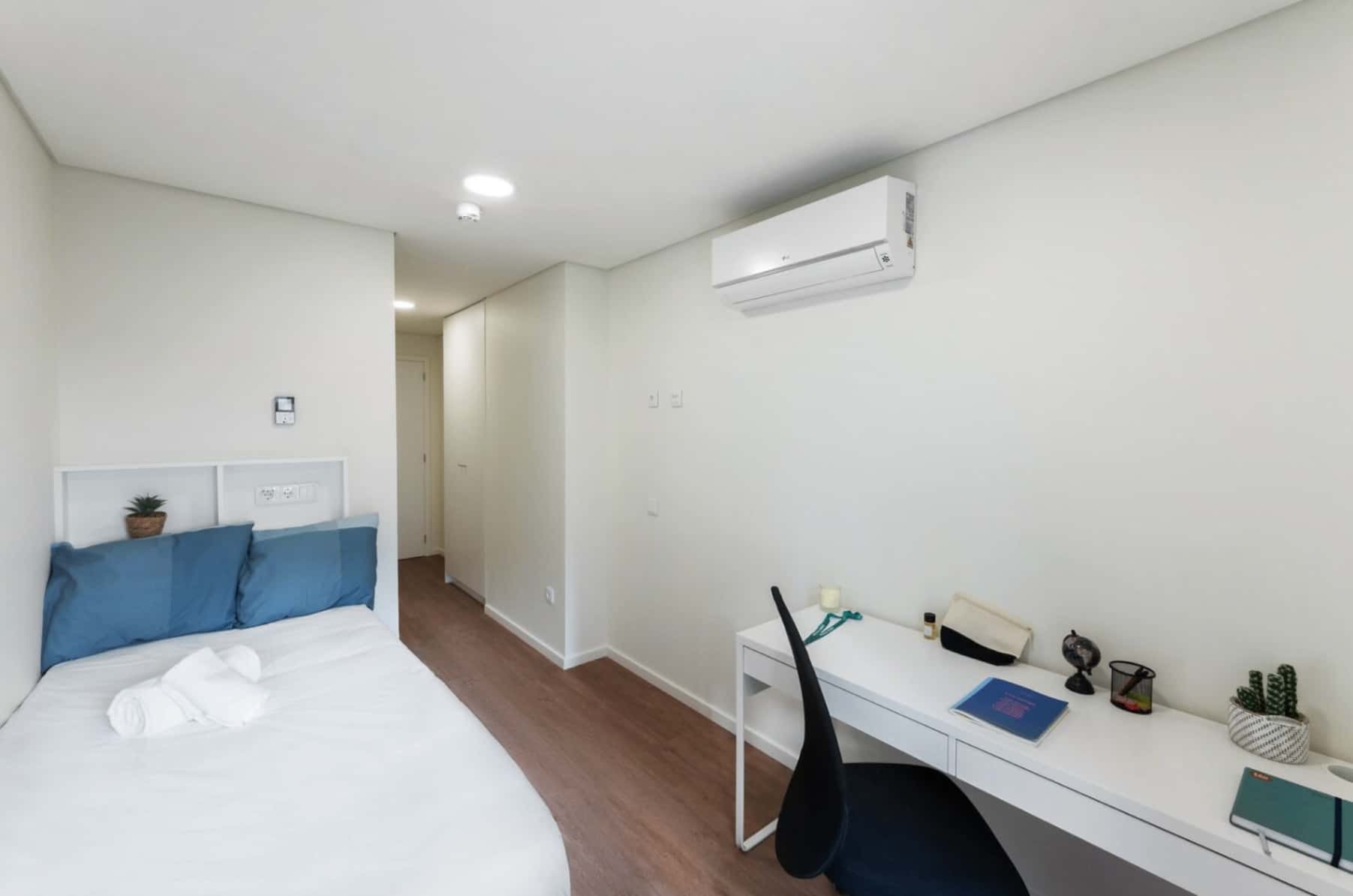 PT Se procura conforto e praticidade encontrou o estúdio certo! O estúdio standard está localizado numa residência universitária e é perfeito para estudantes e jovens trabalhadores que buscam equilíbrio entre os afazeres do dia-a-dia e dos momentos de lazer. Todos os estúdios contam com casa de banho privada, Kitchenette, armário, secretária e cadeira, contas incluídas e limpeza semanal! - Recepção aberta 24 horas por dia. - A residência tem serviço de lavandaria (máquinas de lavar e secar) que funcionam através de um aplicativo dedicado onde pode carregar o saldo e utilizar. - A residência tem ainda uma cozinha comum equipada, salas de estudo, ginásio e garagem. Estará estratégicamente localizado, a 10min a pé de distância da estação de metro Areeiro (linha verde). Sendo assim, poderá se deslocar com facilidade para qualquer lugar da cidade em poucos minutos. Na residência universitária, podes escolher viver com os teus colegas. Só tens de avisar a nossa equipa. Tem em conta que isto está sujeito a disponibilidade, por isso recomendamos que faças a reserva o quanto antes. Os estúdios são individuais. São permitidas visitas durante o dia na residência universitária na Lisboa. No entanto, os hóspedes não podem pernoitar na residência sem uma autorização prévia da direção. Note que o estúdio standard é uma tipologia. O estúdio que lhe for designado pode haver pequenas mudanças na decoração/disposição da mobília. EN If you are looking for comfort and convenience, you have found the right studio! The standard studio is located in a university residence and is perfect for students and young workers seeking a balance between their daily tasks and leisure time. All studios have a private bathroom, kitchenette, closet, desk, and chair, with bills included and weekly cleaning! - Reception open 24 hours a day. - The residence has a laundry service (washers and dryers) that works through a dedicated app where you can load your balance and use it. - The residence also has a fully equipped communal kitchen, study rooms, gym, and garage. It is strategically located, a 10-minute walk from the Areeiro metro station (green line). This means you can easily get anywhere in the city in a few minutes. In the university residence, you can choose to live with your classmates. Just let our team know. Please note that this is subject to availability, so we recommend that you make your reservation as soon as possible. The studios are single occupancy. Visitors are allowed during the day at the university residence in Lisbon. However, guests are not allowed to stay overnight at the residence without prior authorization from the management. Please note that the standard studio is a type of accommodation. The studio assigned to you may have slight changes in the decoration/furniture layout.