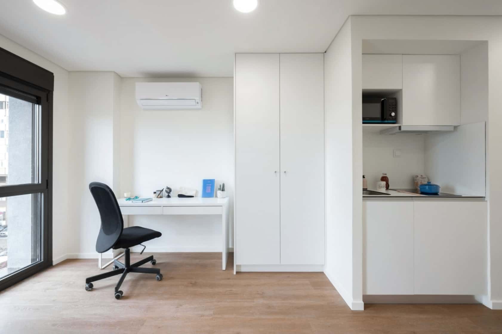 PT Se procura conforto e praticidade encontrou o estúdio certo! O estúdio deluxe está localizado numa residência universitária e é perfeito para estudantes e jovens trabalhadores que buscam equilíbrio entre os afazeres do dia-a-dia e dos momentos de lazer. Todos os estúdios contam com casa de banho privada, Kitchenette, armário, secretária e cadeira, contas incluídas e limpeza semanal! - Recepção aberta 24 horas por dia. - A residência tem serviço de lavandaria (máquinas de lavar e secar) que funcionam através de um aplicativo dedicado onde pode carregar o saldo e utilizar. - A residência tem ainda uma cozinha comum equipada, salas de estudo, ginásio e garagem. Estará estratégicamente localizado, a 10min a pé de distância da estação de metro Areeiro (linha verde). Sendo assim, poderá se deslocar com facilidade para qualquer lugar da cidade em poucos minutos. Na residência universitária, podes escolher viver com os teus colegas. Só tens de avisar a nossa equipa. Tem em conta que isto está sujeito a disponibilidade, por isso recomendamos que faças a reserva o quanto antes. Os estúdios são individuais. São permitidas visitas durante o dia na residência universitária na Lisboa. No entanto, os hóspedes não podem pernoitar na residência sem uma autorização prévia da direção. Note que o estúdio deluxe é uma tipologia. O estúdio que lhe for designado pode haver pequenas mudanças na decoração/disposição da mobília. EN If you are looking for comfort and convenience, you have found the right studio! The deluxe studio is located in a university residence and is perfect for students and young workers seeking a balance between their daily tasks and leisure time. All studios have a private bathroom, kitchenette, closet, desk, and chair, with bills included and weekly cleaning! - Reception open 24 hours a day. - The residence has a laundry service (washers and dryers) that works through a dedicated app where you can load your balance and use it. - The residence also has a fully equipped communal kitchen, study rooms, gym, and garage. It is strategically located, a 10-minute walk from the Areeiro metro station (green line). This means you can easily get anywhere in the city in a few minutes. In the university residence, you can choose to live with your classmates. Just let our team know. Please note that this is subject to availability, so we recommend that you make your reservation as soon as possible. The studios are single occupancy. Visitors are allowed during the day at the university residence in Lisbon. However, guests are not allowed to stay overnight at the residence without prior authorization from the management. Please note that the deluxe studio is a type of accommodation. The studio assigned to you may have slight changes in the decoration/furniture layout.