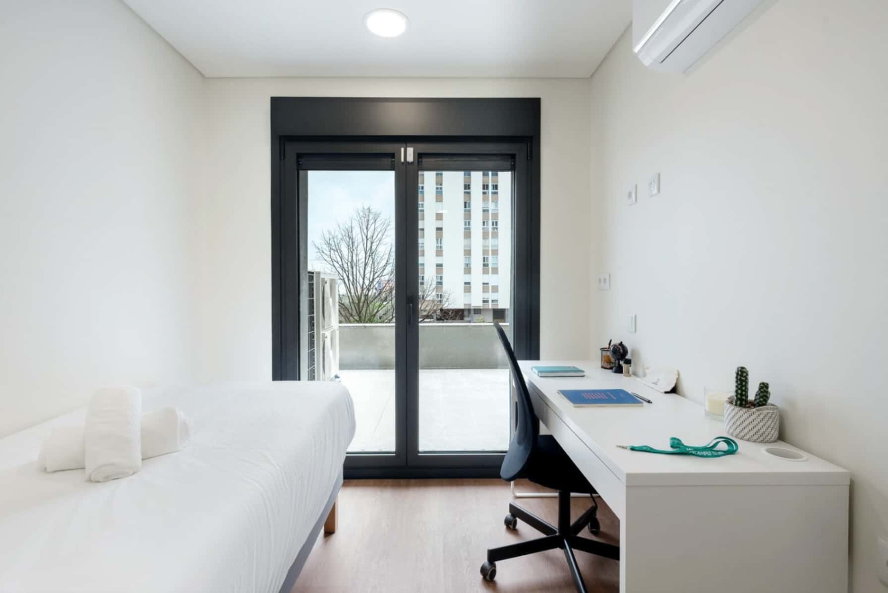 PT Se procura conforto e praticidade encontrou o estúdio certo! O estúdio balcony está localizado numa residência universitária e é perfeito para estudantes e jovens trabalhadores que buscam equilíbrio entre os afazeres do dia-a-dia e dos momentos de lazer. Todos os estúdios contam com casa de banho privada, Kitchenette, armário, secretária e cadeira, contas incluídas e limpeza semanal! - Recepção aberta 24 horas por dia. - A residência tem serviço de lavandaria (máquinas de lavar e secar) que funcionam através de um aplicativo dedicado onde pode carregar o saldo e utilizar. - A residência tem ainda uma cozinha comum equipada, salas de estudo, ginásio e garagem. Estará estratégicamente localizado, a 10min a pé de distância da estação de metro Areeiro (linha verde). Sendo assim, poderá se deslocar com facilidade para qualquer lugar da cidade em poucos minutos. Na residência universitária, podes escolher viver com os teus colegas. Só tens de avisar a nossa equipa. Tem em conta que isto está sujeito a disponibilidade, por isso recomendamos que faças a reserva o quanto antes. Os estúdios são individuais. São permitidas visitas durante o dia na residência universitária na Lisboa. No entanto, os hóspedes não podem pernoitar na residência sem uma autorização prévia da direção. Note que o estúdio balcony é uma tipologia. O estúdio que lhe for designado pode haver pequenas mudanças na decoração/disposição da mobília. EN If you are looking for comfort and convenience, you have found the right studio! The balcony studio is located in a university residence and is perfect for students and young workers seeking a balance between their daily tasks and leisure time. All studios have a private bathroom, kitchenette, closet, desk, and chair, with bills included and weekly cleaning! - Reception open 24 hours a day. - The residence has a laundry service (washers and dryers) that works through a dedicated app where you can load your balance and use it. - The residence also has a fully equipped communal kitchen, study rooms, gym, and garage. It is strategically located, a 10-minute walk from the Areeiro metro station (green line). This means you can easily get anywhere in the city in a few minutes. In the university residence, you can choose to live with your classmates. Just let our team know. Please note that this is subject to availability, so we recommend that you make your reservation as soon as possible. The studios are single occupancy. Visitors are allowed during the day at the university residence in Lisbon. However, guests are not allowed to stay overnight at the residence without prior authorization from the management. Please note that the balcony studio is a type of accommodation. The studio assigned to you may have slight changes in the decoration/furniture layout.