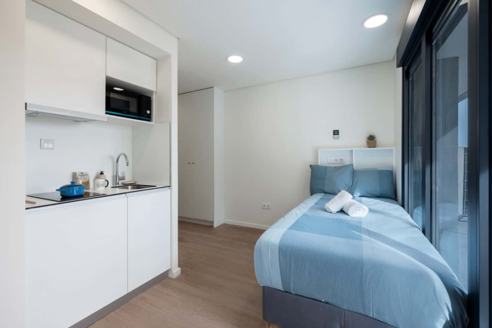 PT Se procura conforto e praticidade encontrou o estúdio certo! O estúdio balcony deluxe está localizado numa residência universitária e é perfeito para estudantes e jovens trabalhadores que buscam equilíbrio entre os afazeres do dia-a-dia e dos momentos de lazer. Todos os estúdios contam com casa de banho privada, Kitchenette, armário, secretária e cadeira, contas incluídas e limpeza semanal! - Recepção aberta 24 horas por dia. - A residência tem serviço de lavandaria (máquinas de lavar e secar) que funcionam através de um aplicativo dedicado onde pode carregar o saldo e utilizar. - A residência tem ainda uma cozinha comum equipada, salas de estudo, ginásio e garagem. Estará estratégicamente localizado, a 10min a pé de distância da estação de metro Areeiro (linha verde). Sendo assim, poderá se deslocar com facilidade para qualquer lugar da cidade em poucos minutos. Na residência universitária, podes escolher viver com os teus colegas. Só tens de avisar a nossa equipa. Tem em conta que isto está sujeito a disponibilidade, por isso recomendamos que faças a reserva o quanto antes. Os estúdios são individuais. São permitidas visitas durante o dia na residência universitária na Lisboa. No entanto, os hóspedes não podem pernoitar na residência sem uma autorização prévia da direção. Note que o estúdio balcony deluxe é uma tipologia. O estúdio que lhe for designado pode haver pequenas mudanças na decoração/disposição da mobília. EN If you are looking for comfort and convenience, you have found the right studio! The balcony deluxe studio is located in a university residence and is perfect for students and young workers seeking a balance between their daily tasks and leisure time. All studios have a private bathroom, kitchenette, closet, desk, and chair, with bills included and weekly cleaning! - Reception open 24 hours a day. - The residence has a laundry service (washers and dryers) that works through a dedicated app where you can load your balance and use it. - The residence also has a fully equipped communal kitchen, study rooms, gym, and garage. It is strategically located, a 10-minute walk from the Areeiro metro station (green line). This means you can easily get anywhere in the city in a few minutes. In the university residence, you can choose to live with your classmates. Just let our team know. Please note that this is subject to availability, so we recommend that you make your reservation as soon as possible. The studios are single occupancy. Visitors are allowed during the day at the university residence in Lisbon. However, guests are not allowed to stay overnight at the residence without prior authorization from the management. Please note that the balcony deluxe studio is a type of accommodation. The studio assigned to you may have slight changes in the decoration/furniture layout.