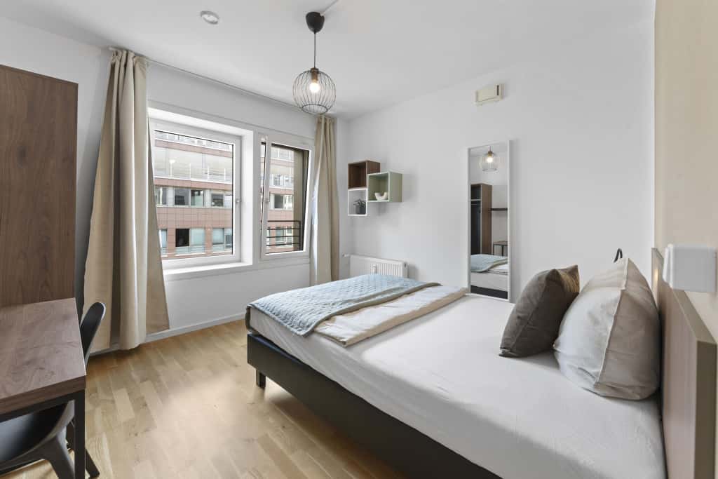 [EN] Enjoy your stay in this beautiful room in a shared apartment! Located in a lively district, this brand-new living complex will offer you everything you need: high speed internet, laundry room, a community area, co-working/co-learning area and even a 75m2 gym*! Your cosy room will be fully furnished with bed (incl. mattress, blanket and pillow), desk and chair, wardrobe, shelf, curtains. hanging and/or standing lamp and bedside table. Heating, electricity, water, and internet are included in the price. The structure is linked to superb public transport connections nearby and you will find many restaurants, supermarkets, shops & parks in the area. (The maximum stay period is 1 year. However, it is possible to extend the stay in the same structure by moving to another room) *only for the co-living in Nazarethkirchstraße [DE] Genieß dein Aufenthalt in diesem schönen Zimmer in einer WG! Dieser brandneue Wohnkomplex in einem belebten Viertel bietet dir alles, was du brauchst: Highspeed-Internet, Waschküche, Gemeinschaftsraum, Co-Working/Co-Learning Bereich und sogar einen 75 m2 großen Fitnessraum*! Dein gemütliches Zimmer ist komplett eingerichtet mit Bett (inkl. Matratze, Decke und Kissen), Schreibtisch und Stuhl, Kleiderschrank, Regal, Vorhängen, Hänge- und/oder Stehlampe und Nachttisch. Heizung, Strom, Wasser und Internet sind alles inkludiert. Die Struktur ist an hervorragende öffentliche Verkehrsmittel in der Nähe angebunden und in der Umgebung kannst du viele Restaurants, Supermärkte, Geschäfte und Parks finden. (Die maximale Aufenthaltsdauer beträgt 1 Jahr. Es ist jedoch möglich, den Aufenthalt in derselben Struktur durch Umzug in ein anderes Zimmer zu verlängern) *nur für den Co-living in der Nazarethkirchstraße