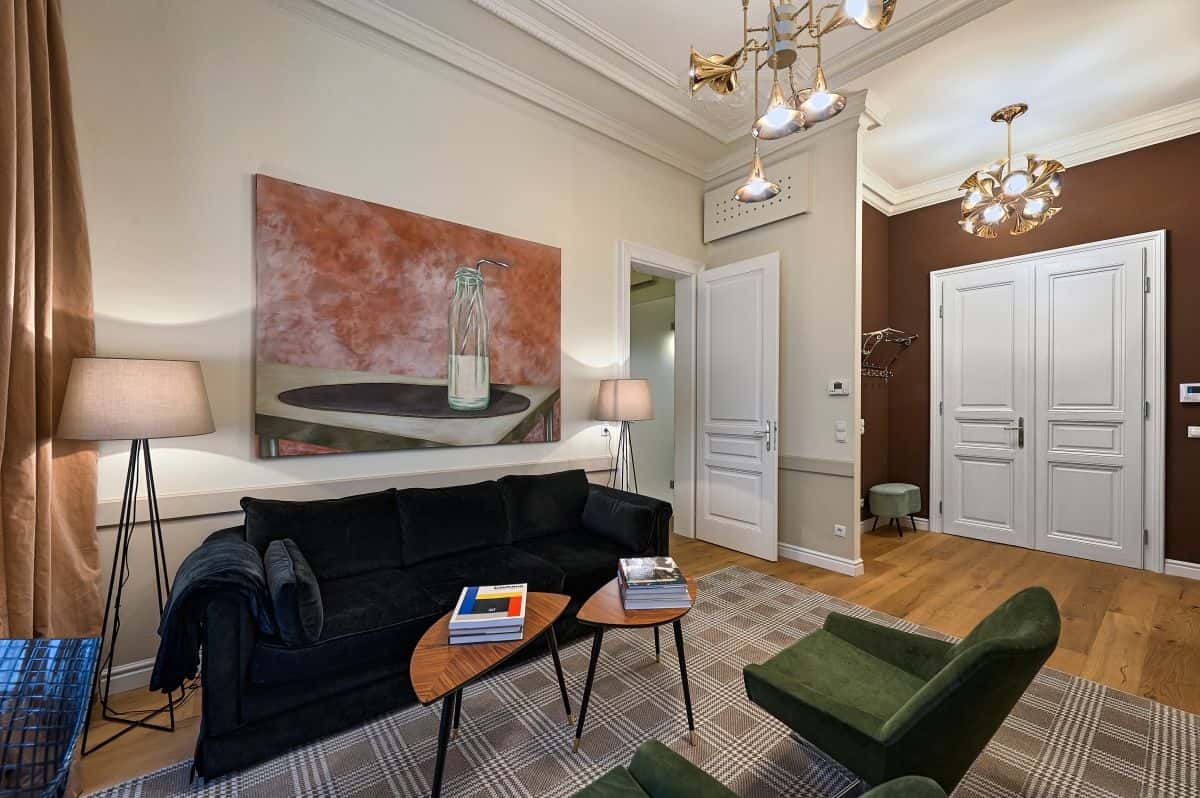 Entire apartment This exceptionally luxurious 58 m² apartment in a beautiful old Viennese building is located directly adjacent to the center of Vienna, the 1st district. It consists of a spacious living room with dining area, a fully equipped kitchen, two bedrooms, a bathroom with walk-in shower, a separate WC and an entrance area. The apartment is also equipped with air conditioning. The furniture and materials used in the apartment meet the highest standards, from the box-spring bed with two different firmness levels to designer armchairs and hand-picked art. A free high-speed internet connection and LED TVs with cable TV in the bedrooms and living room are available. Fresh towels, shower towels, shower mats and bed linen are provided. Cleaning equipment is also available. The apartment is a non-smoking apartment. The building has an elevator, an intercom system and an easily accessible garbage room. The most famous shopping streets in Vienna around Graben, Kohlmarkt and Tuchlauben are not far from the apartment. The apartment is in close proximity to all the sights of the 1st district, such as St. Stephen's Cathedral, the Hofburg, the Spanish Riding School, Heldenplatz and many, many more. The Bank Austria Kunstforum, which is known for its changing exhibitions, is just a few steps away from the apartment. Regular events on the Rathausplatz throughout the year are within walking distance. So an entertaining evening can end with a short walk of just a few minutes. Close to the apartment are some of the best restaurants in Vienna as well as many small local restaurants and food stores, for example the world-famous Meinl am Graben or the famous Schwarze Kameel with its special Viennese flair. The Votive Church, the Parliament, the Volksgarten and the Museumsquartier are also in the immediate vicinity of the apartment. The Danube Canal, Vienna's longest cycling and jogging route, can be reached on foot in five minutes. Several bus stops are no more than 4 minutes away, and there is also a subway station within walking distance. All in all, an exquisite home in the middle of the city. Additional Information Non-smoking apartment. If you smoke in the apartment, 600 EUR will be charged for the special smoke cleaning. Please do not leave your keys inside in the door lock of the apartment when you leave the apartment. Please also be sure to lock the door when you leave, otherwise stolen or damaged items will not be replaced in the event of a burglary. Please do not use the key box after check-in and always take the key with you when leaving the apartment. For insurance reasons, the key must not remain in the key box longer than necessary. If the lessee’s behavior (for example leaving the key in the apartment door, forgetting the key in the rental object, loss of the key etc.) results in the opening of the door by the lessor, the following expenses will be charged: Monday – Friday 8 am to 6 pm: EUR 100 Monday – Friday 6 pm to 10 pm: EUR 150 Monday – Friday 6 am to 8 am: EUR 150 Saturday, Sunday, holidays: EUR 200 In addition, the lessee has to bear the costs of any necessary locksmith services. The lessee acknowledges that this service is only offered on availability of the lessor. If the lessor cannot be reached and always between 10 pm and 6 am the lessee needs to reach out to an official locksmith service on own cost. Please mind that the costs for a locksmith service can be higher and cannot be influenced by the lessor. No specific security level or fire protection class is guaranteed for a safe that may be installed in the apartment. Use is therefore at the lessee’s own risk and is insured by the lessor for a maximum of EUR 500. In the event of an insured event, the lessee must prove the contents of the safe. If the guest has not yet left the apartment at the time of check-out, 10 am, and therefore the cleaning cannot start on time, all associated costs, such as additional approach, additional cleaning staff, costs for the delayed check-in of the following guest will be charged. The consumables available at check-in to the apartment (washing-up liquid, kitchen roll, dishwasher tabs, washing detergent, cosmetics, toilet paper, coffee capsules, coffee cream, tea, salt, pepper, sugar, etc.) only serve as a starter kit and will not be refilled during the stay.“ Please note that a local tax of 3.2% of the total amount is due for bookings of less than three months.