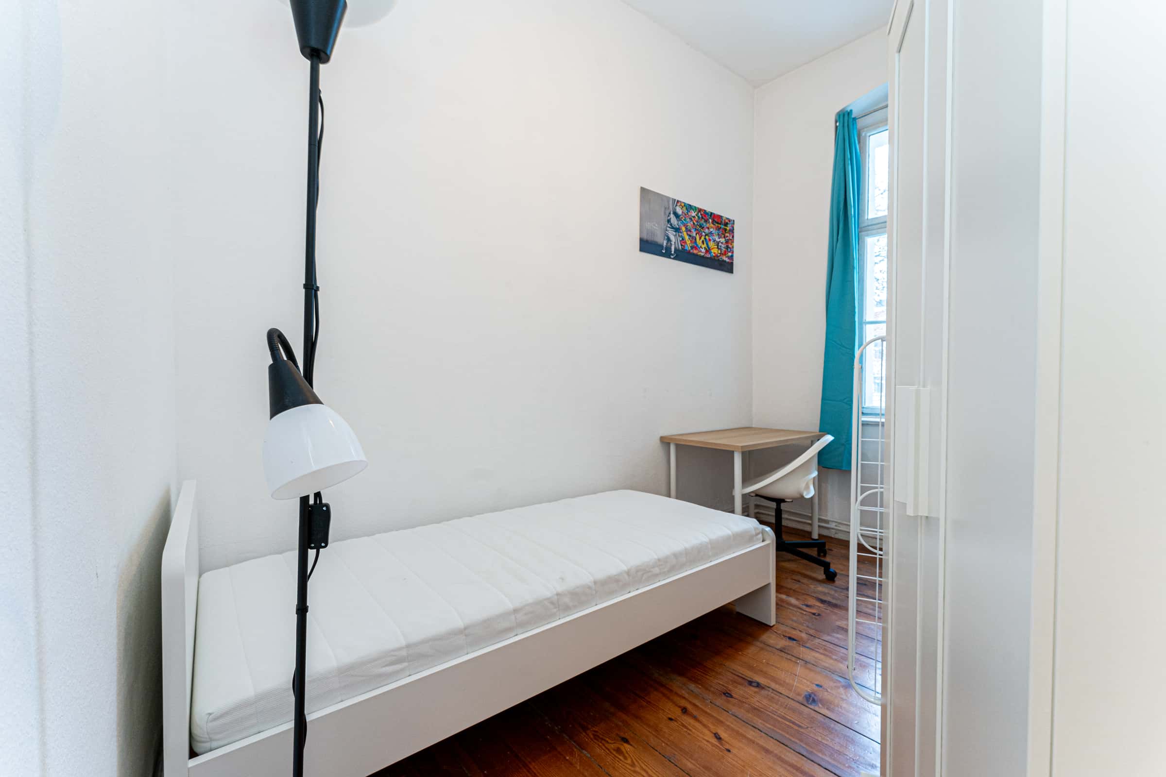 EN Enjoy your stay in this beautiful and bright room in a freshly renovated shared apartment! Located in a dynamic district in Berlin, this room will become your nest in the lively city. Your cosy room will be fully furnished with bed (incl. mattress, blanket and pillow), desk and chair, wardrobe, shelf, curtains. hanging and/or standing lamp. Heating, electricity, water, and internet are included in the price. Public transport connections are easily reachable nearby and you will find many restaurants, supermarkets and shops in the area. Check-in is possible from Monday to Firday, from 9AM to 2PM. DE Genieß deinen Aufenthalt in diesem schönen und hellen Zimmer in einem frisch renovierten Apartment! In einem dynamischen Stadtteil Berlins gelegen, wird dieses Zimmer zu deinem Rückzugsort in der lebendigen Stadt. Dein gemütliches Zimmer ist komplett eingerichtet mit Bett (inkl. Matratze, Decke und Kissen), Schreibtisch und Stuhl, Kleiderschrank, Regal, Vorhängen, Hänge- und/oder Stehlampe. Heizung, Strom, Wasser und Internet sind im Preis inkludiert. Öffentliche Verkehrsmittel sind in der Nähe und leicht erreichbar. In der Umgebung findest du viele Restaurants, Supermärkte und Geschäfte. Check-in ist möglich von Montag bis Freitag, von 9 bis 14 Uhr.