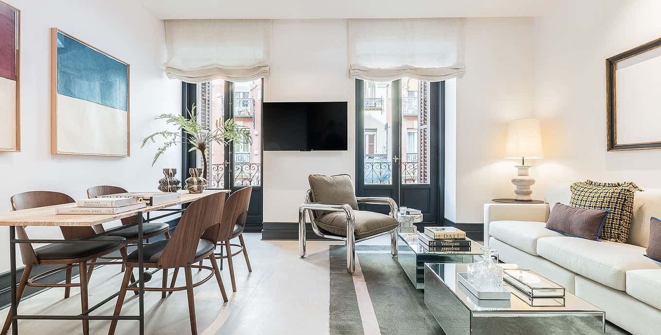 [EN] Located on the 1st floor of an elegant new construction building from 2024, Apodaca I offers an exceptional residence for those seeking an exclusive enclave. This modern 2-bedroom, 2-bathroom apartment stands out for its brightness, thanks to the large windows, and its sophisticated design. The furniture is kept to a minimum, with a natural color palette over intense tones, creating a functional and pleasant space. This apartment is situated in one of the most traditional neighborhoods of Madrid. The area has a lot to offer, with excellent metro connections and just steps away from various points of interest, such as the Museum of Madrid History or the Romanticism Museum. You'll also find shops and small boutiques, as well as markets for your daily shopping. An environment known for its gastronomic variety and lively, welcoming atmosphere. General Info This 79m2 apartment located on the first floor with an exterior orientation can accommodate up to four people. Living / Dining Area The open living room to the dining area features a three-piece sofa, two coffee tables, an armchair, and a Smart TV. It also has a large window that provides access to the balcony. The dining area has a table and chairs for four people. Kitchen The kitchen is fully equipped with utensils and small appliances (toaster, kettle, juicer, coffee maker, vacuum cleaner), as well as a dishwasher, and oven/microwave. It has a kitchen island with two high chairs. Bedrooms The main bedroom is equipped with a double bed (1.80m x 2.00m), two bedside tables, a bench, and built-in wardrobes. The second bedroom has a single bed (0.90m x 2.00m), a nightstand, and built-in wardrobes. Bathroom The apartment has two fully equipped bathrooms with shower. Additional Info The building has an elevator. The apartment has air conditioning and central heating through ducts. [ES] Ubicado en la 1ª planta de un elegante edificio de obra nueva de 2024, Apodaca I ofrece una residencia excepcional para aquellos que buscan un enclave exclusivo. Este moderno piso de 2 dormitorios y 2 baños destaca por la luminosidad que le brindan los altos ventanales y su diseño sofisticado. Las piezas de mobiliario se mantienen al mínimo, con una paleta de colores natural sobre tonos intensos, creando un espacio funcional y agradable. Este piso está situado en una de las zonas más castizas de Madrid. La zona tiene mucho que ofrecer, con muy buena conexión de metro y a pocos pasos de diferentes lugares de interés, como el Museo de Historia de Madrid o el Museo del Romanticismo. También encontrarás tiendas y pequeñas boutiques, así como mercados para tus compras diarias. Un entorno que resalta por su variedad gastronómica y su animado y acogedor ambiente. Información General Este piso de 79 m² ubicado en la primera planta, con orientación exterior, puede alojar hasta cuatro personas. Área de Estar / Comedor El salón abierto al comedor cuenta con un sofá de tres piezas, dos mesitas, una butaca y una Smart TV. Además, tiene un gran ventanal que da acceso al balcón. El comedor tiene una mesa y sillas con capacidad para cuatro personas. Cocina La cocina está completamente equipada con menaje y pequeños electrodomésticos (tostador, hervidor, exprimidor, cafetera, aspiradora), además de lavavajillas y horno/microondas. Cuenta con una isla de cocina con dos sillas altas. Dormitorios El dormitorio principal está equipado con una cama doble (1,80 m x 2,00 m), dos mesitas auxiliares, un banco y armarios empotrados. El segundo dormitorio cuenta con una cama individual (0,90 m x 2,00 m), mesita de noche y armarios empotrados. Baños El apartamento cuenta con dos baños con ducha completamente equipados. Información Adicional El edificio dispone de ascensor. El piso cuenta con aire acondicionado y calefacción central por conducto. Pets are allowed -with an extra cleaning fee- / se permiten mascotas con un pago adicional de limpieza. Utilities are included in the price up to a specified amount for further info please ask / Los servicios públicos están incluidos en el precio hasta una cantidad específica para mayor información por favor consultar.