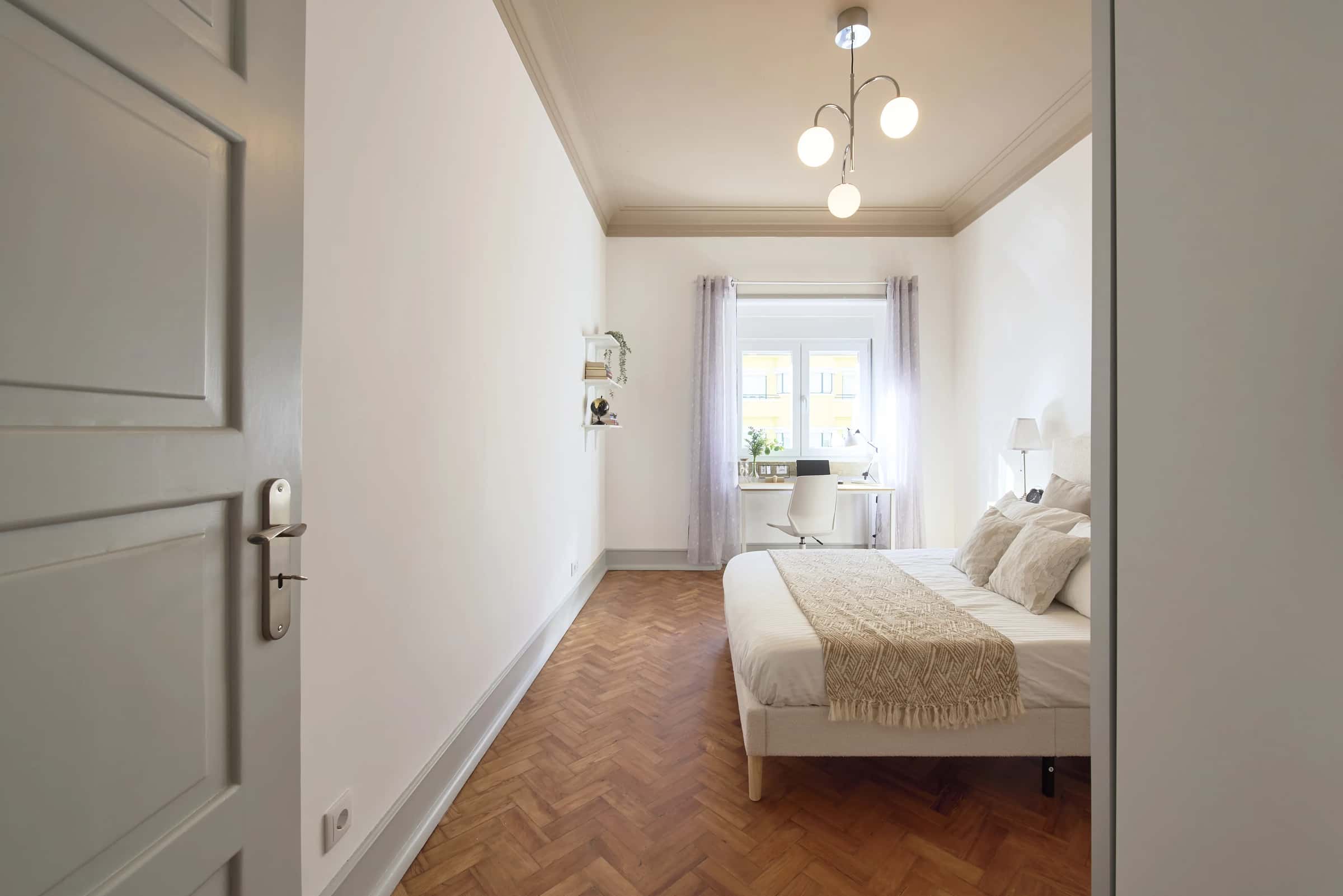 EN This bright apartment in Alameda offers an ideal combination of comfort and convenience in one of Lisbon’s most central and well-connected neighborhoods. With 7 bedrooms and 3 bathrooms (2 shared and 1 guest toilet), it provides a spacious and pleasant environment, perfect for those looking for a practical and welcoming home in the city.The apartment features a fully equipped kitchen, perfect for preparing daily meals, and bright common areas that receive plenty of natural light throughout the day. The location ensures excellent access to all essentials, with a supermarket about 3 minutes away on foot, Alameda metro station around 4 minutes away, and several bus stops just a short walk from the door. Alameda is one of Lisbon’s most vibrant and central neighborhoods, known for its wide avenues, green park, and lively atmosphere. The area offers a great variety of cafés, restaurants, supermarkets, and local shops, all within easy reach. It’s a perfect blend of residential comfort and city life, ideal for those who value both convenience and community. Metro: The Alameda metro station serves both the Green Line (Linha Verde) and Red Line (Linha Vermelha), providing direct access to Baixa-Chiado, Saldanha, Oriente, and Aeroporto.Buses: Multiple Carris bus routes serve the area, connecting quickly to Areeiro, Anjos, Cais do Sodré, and Parque das Nações.Trains: The Areeiro train station is about 10 minutes away on foot, offering suburban and regional connections to destinations outside Lisbon.With excellent metro, bus, and train access, getting around from Alameda is fast, simple, and convenient. - Jardim da Alameda Dom Afonso Henriques – A beautiful park ideal for walks and outdoor relaxation. - Instituto Superior Técnico – One of Lisbon’s most prestigious universities, nearby. - Fonte Luminosa – A landmark fountain with light and water shows. - Avenida Almirante Reis – A lively avenue filled with shops, bakeries, and cafés. - Saldanha – A nearby business and shopping district easily reached by metro.Alameda combines accessibility, energy, and comfort, making this bright apartment with a fully equipped kitchen an excellent choice for living in the heart of Lisbon. - No smoking.- No pets allowed.- No parties.- Trash must be taken out daily.- Short-term visitors are allowed (2 days). Longer period: €20 per day.- Utilities: included up to €25 per tenant.- Cleaning: offered by the landlord.- Bedding: pillows, duvet, and bed sheets are not provided.- Payment before check-in: first and last month, deposit and admin fee.- Check-ins: from Monday to Saturday from 4pm until 7:30pm. No check-ins on Sundays and bank holidays. Check-in is authorized only 24h after the payment is confirmed in our bank account and the contract is signed. The bedroom is a cozy and comfortable space, designed to offer residents a peaceful and restful environment. The room features a cozy double bed, a desk, a chair, and storage space for your belongings.