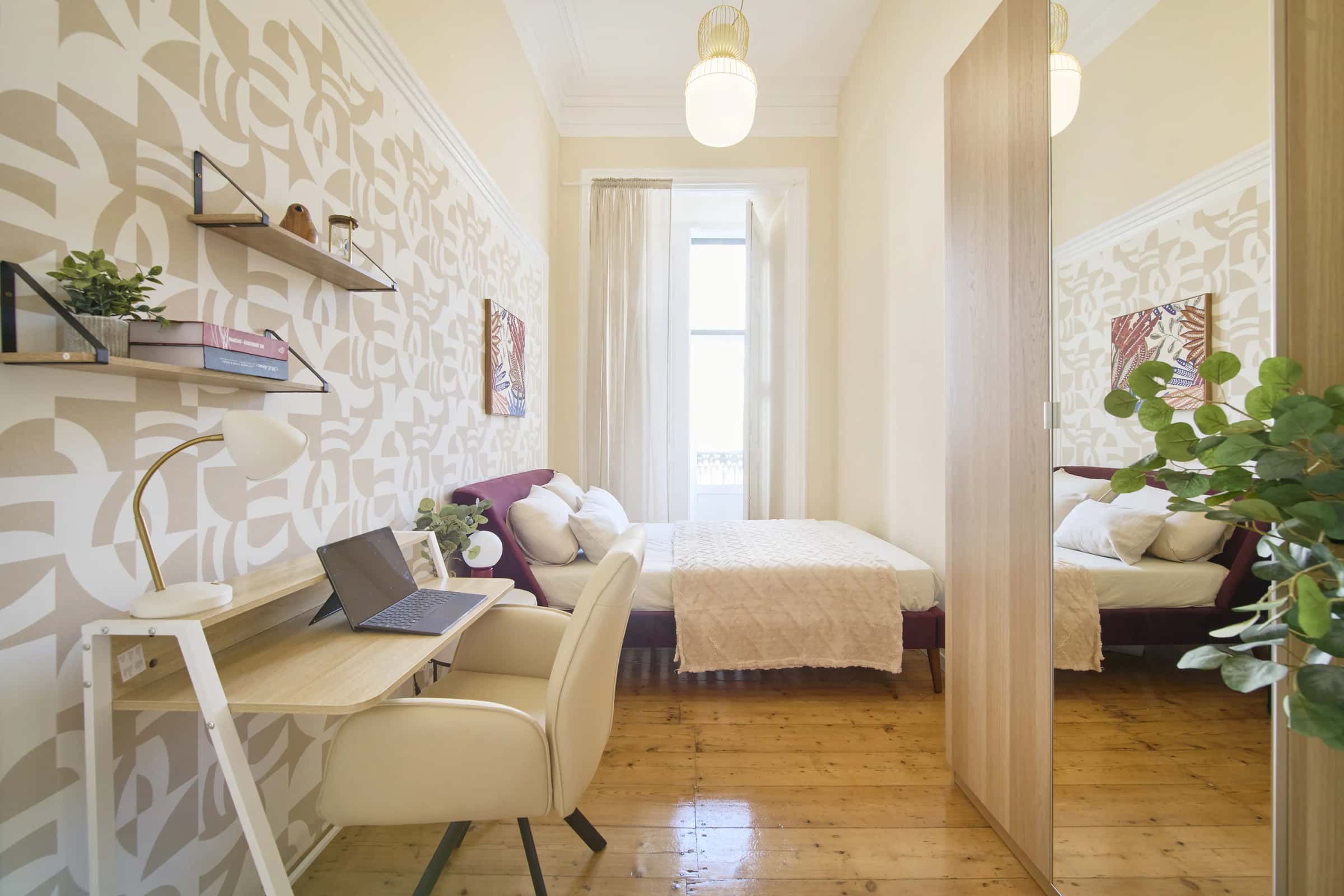 EN This cozy first-floor apartment in Santos offers comfort and practicality in a lively area of Lisbon. Featuring 8 bedrooms, 3 bathrooms (2 full and 1 half bathroom), it is designed to provide a welcoming and functional living space. The apartment also includes a bright and fully equipped kitchen, ideal for everyday use.With its generous space and inviting atmosphere, this apartment is perfect for those who value both comfort and location. Shops, cafés, restaurants, and essential services are all within easy reach, making it a great place to enjoy life in Lisbon. The nearest supermarket is about a 2-minute walk, and the closest bus stop is approximately 3 minutes away, ensuring convenient access to transport and nearby amenities. Santos is a vibrant and historic neighborhood in Lisbon, known for its lively streets, riverside views, and cultural atmosphere. The area offers a mix of shops, cafés, restaurants, and essential services, making it ideal for comfortable urban living. Train: Santos station provides convenient access to the Cascais Line, connecting easily to central Lisbon and the coastal areas.Buses: Several main bus lines serve the Santos area, including the 714, 727, 736, and 758 lines, offering easy connections to other parts of the city.Thanks to its central location in Santos, living here means excellent public transport options and quick access to Lisbon’s main attractions. - Miradouro de Santo Amaro – A scenic viewpoint overlooking the river and city.- Museu da Carris – A cultural attraction showcasing Lisbon’s historic transport.- Riverside cafés and restaurants – Offering a vibrant dining and leisure scene.- Local shops and markets – Convenient for daily errands and exploring the neighborhood.- Cultural and historic landmarks – Adding charm and character to everyday life.Santos offers a mix of culture, leisure, and accessibility, making this spacious and well-equipped apartment a perfect choice for comfortable and authentic living in Lisbon. - No smoking.- No pets allowed.- No parties.- Trash must be taken out daily.- Short-term visitors are allowed (2 days). Longer period: €20 per day.- Utilities: included up to €25 per tenant.- Cleaning: offered by the landlord.- Bedding: pillows, duvet, and bed sheets are not provided.- Payment before check-in: first and last month, deposit and admin fee.- Check-ins: from Monday to Saturday from 4pm until 7:30pm. No check-ins on Sundays and bank holidays. Check-in is authorized only 24h after the payment is confirmed in our bank account and the contract is signed. The bedroom is a cozy and comfortable space, designed to offer residents a peaceful and restful environment. The room features a cozy double bed, a desk, a chair, and storage space for your belongings.