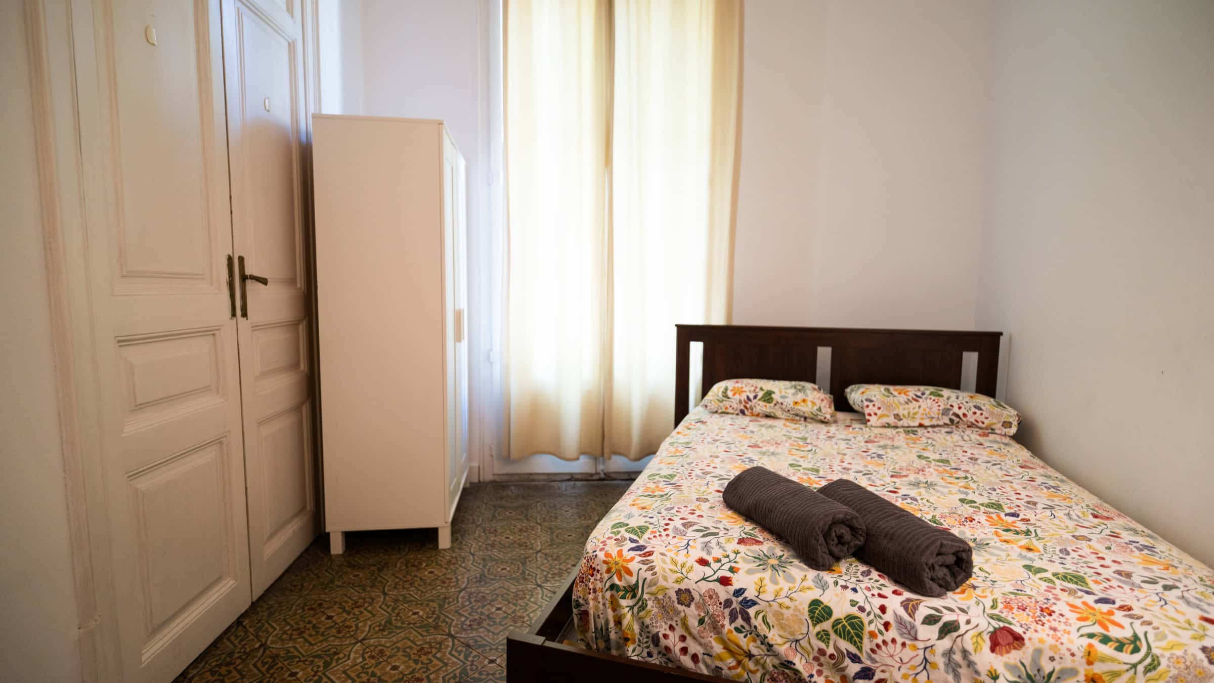 Habitación con cama doble, wifi, escritorio y una ventana exterior. Ubicación ideal para moverte por el centro sin depender de largos trayectos. Este cuarto está pensado para quienes buscan un espacio práctico y luminoso. Cuenta con una cama doble con ropa de cama, un escritorio amplio para trabajar o estudiar y una ventana que da a la calle, lo que aporta luz natural y ventilación durante el día. La habitación incluye cerradura con llave, toallas, wifi y las comodidades básicas para una estancia confortable. Dentro del piso encontrarás una cocina compartida equipada para preparar comidas sencillas y un baño también compartido con los demás huéspedes. Es un ambiente tranquilo, ordenado y pensado para que todos puedan convivir cómodamente sin perder privacidad. El edificio dispone de ascensor y el acceso es directo desde la entrada principal. Llegar es sencillo, tanto si vienes caminando desde el centro como si usas transporte público. La zona ofrece una mezcla de vida local y urbana: cafeterías con menú del día, supermercados pequeños, bares relajados, librerías y calles con movimiento constante. Es un área muy práctica para quienes quieren tener servicios, comercio y opciones para comer a pocos minutos a pie. Moverte desde aquí es muy sencillo. Tienes varias paradas de metro y autobús en un radio corto, que conectan con lugares emblemáticos como la Sagrada Familia, Casa Batlló, el casco antiguo, el paseo marítimo o los barrios más visitados del centro. Puedes caminar a zonas muy transitadas sin necesidad de transporte, lo que hace que la ubicación sea ideal si planeas explorar la ciudad a pie. Si llegas desde el aeropuerto, el Aerobús te deja en una zona central desde donde solo tendrás que caminar unos minutos hasta el piso. Todo queda a mano: tiendas, parques, restaurantes, centros culturales y los puntos turísticos más buscados. Exterior double room in a central and convenient area