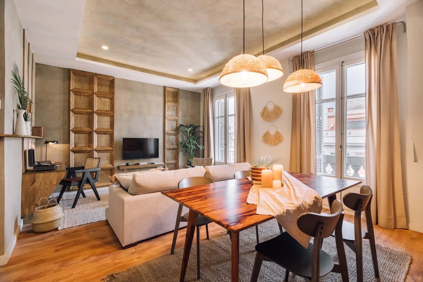 Wooden panelling and geometric patterns are paired with subtle hues to create a unique design in this 60 square meter space. Resting in the heart of Esquerra de Eixample, Salonga encapsulates Barcelona. Stroll down the many promenades speckling the neighborhood or try some of the local flavors. This dreamlike oasis offers 2 balconies, providing natural light throughout the property. Salonga offers comfort and style within its one bedroom and bathroom. Fully furnished, this home comes with everything you need, including bedding and linens. When the day is finished, come home to Salonga for absolute indulgence. *We welcome pets, fees are subject to apply. Guests will be informed of any additional charges in the final contract. *We cannot be held liable for any noises (construction, or street noise) done outside the apartment. We also cannot be liable for any rooms without air conditioning (all the rooms with air conditioner will be explicitly explained in our description). We will not accept any reservation cancellations or refund request related to these two issues. *Our in-house design team expertly selects all apartment furniture and decor to ensure the highest level of quality and comfort. As part of consistent home upkeep, design improvements, and photo staging, there may be minor differences in furnishings seen in the photos and what you find in the apartment. Inquire with a sales agent for any questions or doubts. *This accommodation may only be used for stays longer than 31 nights for personal purposes such as holiday, recreational, or leisure. The information provided may be submitted to the relevant registry and/or administrative authority in accordance with Catalan regulations.