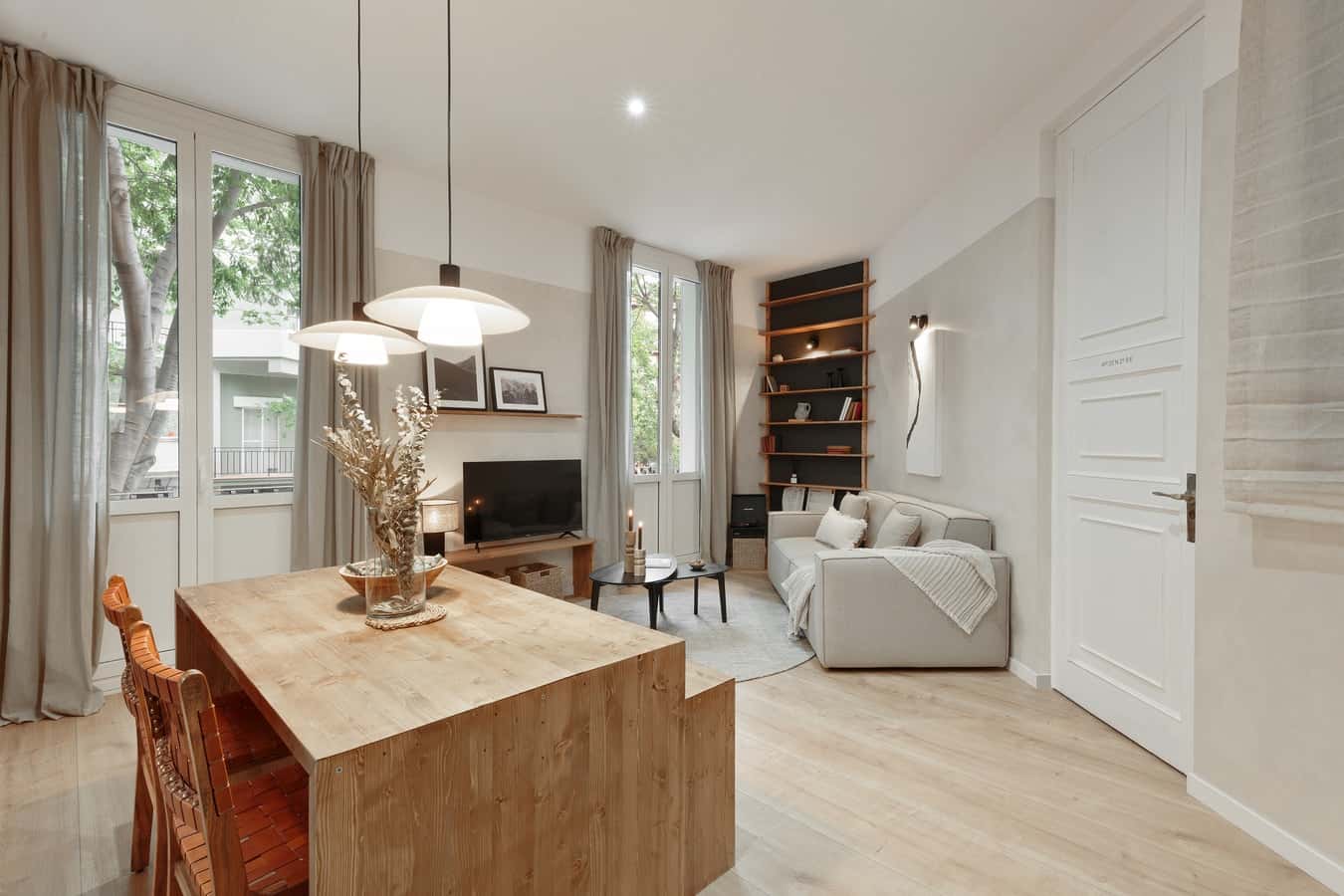Welcome to Sazos, a stunning mountain-themed apartment nestled in the vibrant neighborhood of Sant Antoni. Immerse yourself in Sant Antoni, known for its vibrant atmosphere, local markets, and eclectic dining options. After exploring, come back to this charming residence offers 76 square meters of contemporary living space, combining modern design with a touch of nature-inspired elements. As you step into the apartment, you'll be greeted by an open and inviting atmosphere. The open plan living room and kitchen area seamlessly flow together, creating a spacious and comfortable environment. The living room is thoughtfully furnished with a full entertainment system, perfect for unwinding and enjoying your favorite shows or movies. The fully furnished kitchen is a chef's delight, equipped with modern appliances and ample counter space. Prepare delicious meals or simply enjoy a cup of coffee while taking in the mountain-inspired design elements that add a touch of charm to the space. The apartment features two beautifully designed bedrooms, ensuring a restful and peaceful stay for all guests. The queen-size bedroom offers a comfortable retreat and boasts an ensuite bathroom for added convenience and balcony access. The single room provides a dedicated workstation, ideal for work or study. The apartment comprises two stylish bathrooms, ensuring privacy and comfort for all occupants. Both bathrooms are well-appointed, featuring modern fixtures and providing a relaxing space to rejuvenate after a day of exploring the city. Step out onto the balcony and be captivated by the picturesque views of the surrounding area. The balcony offers a dining table, creating a perfect setting for enjoying meals al fresco while soaking up the fresh air and admiring the beautiful scenery. To ensure your utmost comfort, the apartment is equipped with air conditioning, allowing you to set the perfect temperature and create a pleasant environment throughout your stay. Fully furnished, this apartment comes with everything you need, including bedding and linens. *We welcome pets, fees are subject to apply. Guests will be informed of any additional charges in the final contract. *We cannot be held liable for any noises (construction, or street noise) done outside the apartment. We also cannot be liable for any rooms without air conditioning (all the rooms with air conditioner will be explicitly explained in our description). We will not accept any reservation cancellations or refund requests related to these two issues. *Our in-house design team expertly selects all apartment furniture and decor to ensure the highest level of quality and comfort. As part of consistent home upkeep, design improvements, and photo staging, there may be minor differences in furnishings seen in the photos and what you find in the apartment. Inquire with a sales agent for any questions or doubts. *This accommodation may only be used for stays longer than 31 nights for personal purposes such as holiday, recreational, or leisure. The information provided may be submitted to the relevant registry and/or administrative authority in accordance with Catalan regulations.