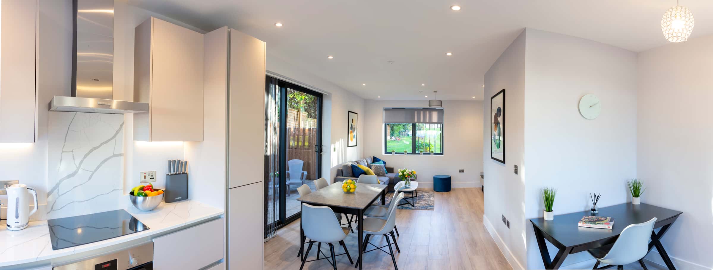 The apartment is available immediately. The apartment has a total area of 120 square meters. There are 3 bedroom(s), 2 bathroom(s). . It also has 1 living room(s). No additional fee is requested for the condominium. A minimum stay of 1 month(s) is required. It is possible to book directly online. A stunning new three bedroom home with flexible living accommodation for up to 6 guests. The property has been designed in a very modern style and has been finished to a high specification throughout, with underfloor heating to the downstairs, aircon to the master suite, fibre broadband and work space, with quartz worktops and Bosch appliances to the kitchen. Situated in a new and exclusive private development in the heart of north London. Situated over three floors the downstairs has an open plan lounge kitchen diner with a work space as well as access to a private patio. The first floor comprises two bedrooms and a bathroom and the entire top floor has the master suite with air con, en-suite bathroom and a terrace overlooking the communal gardens. All bedrooms have the choice of two single or one super king bed. The whole house is for your use only with two allocated parking spaces in the gated courtyard and large communal gardens to the rear and a private patio garden.
