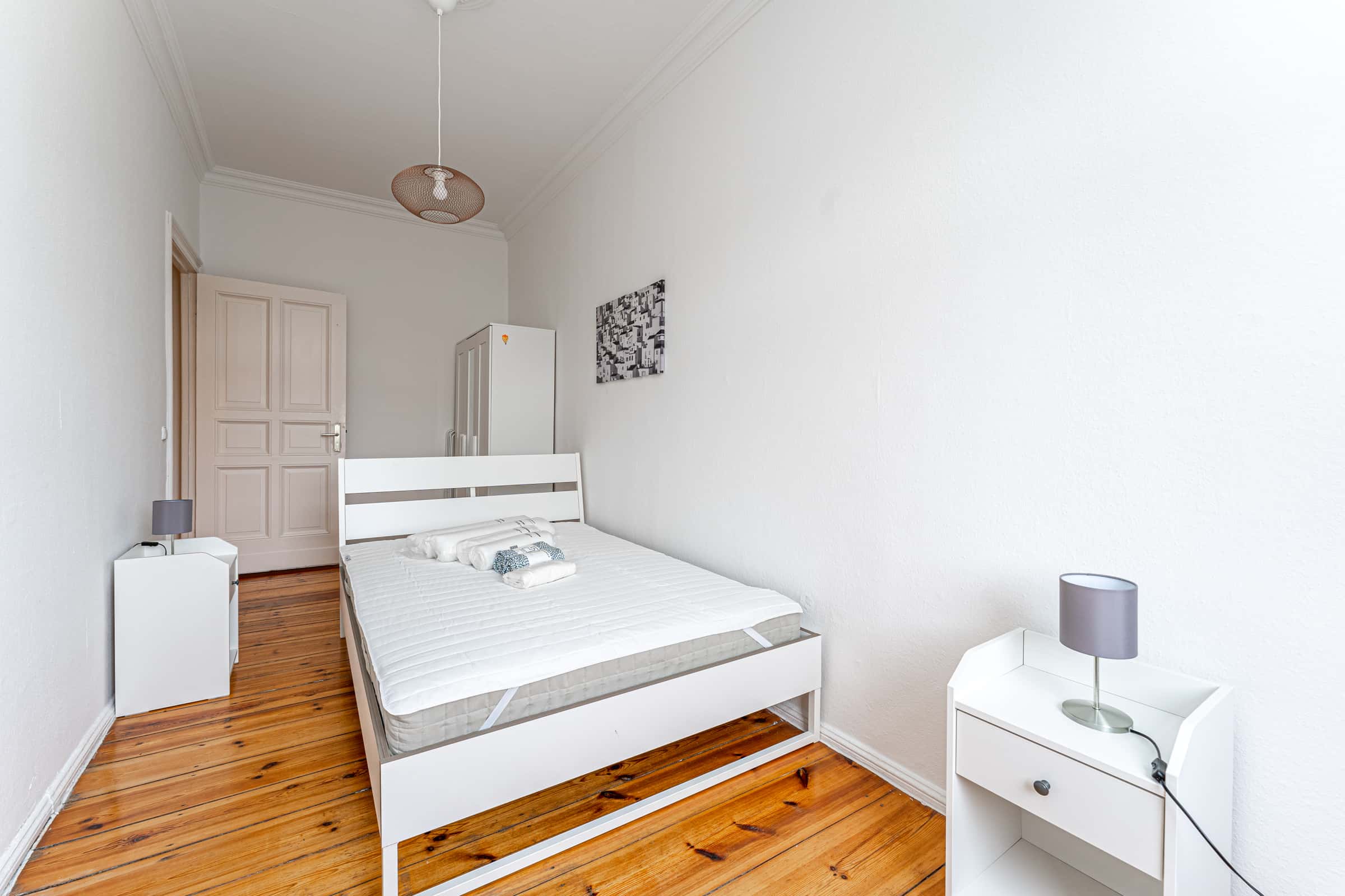 EN This beautiful apartment offers you all that you need in order to have a comfortable stay! With its smart design, the space is utilized to make it highly functional. The apartment is located in a dynamic district in Berlin, close to public transport connections and with many restaurants and shops in the area. If you want to stay calm and relaxed, you can resort back to your cosy apartment that will be fully furnished with a bed (incl. mattress, blanket and pillow), desk and chair, wardrobe, shelf, curtains, hanging and/or standing lamp. The apartment also offers a beautiful kitchen/kitchenette for you to enjoy your meals. Heating, electricity, water, and internet are included in the price. Check-in is possible from Monday to Firday, from 9AM to 2PM. DE Diese schöne Wohnung bietet dir alles, was du für einen komfortablen Aufenthalt benötigst! Mit dem intelligenten Design wird jeder Winkel der Wohnung perfekt genutzt. Die Wohnung befindet sich in einem dynamischen Bezirk in Berlin, in der Nähe der öffentlichen Verkehrsmittel und mit vielen Restaurants und Geschäften in der Umgebung. Wenn du ruhig und entspannt bleiben willst, kannst du dich in dein gemütliches Zuhause zurückziehen, das komplett mit Bett (inkl. Matratze, Decke und Kissen), Schreibtisch und Stuhl, Kleiderschrank, Regal, Vorhängen, Hänge- und/oder Stehlampe ausgestattet ist. Die Wohnung verfügt auch über eine schöne Küche/Kochnische, in der du deine Mahlzeiten genießen kannst. Heizung, Strom, Wasser und Internet sind im Preis inbegriffen. Check-in ist von Montag bis Freitag, von 9 Uhr bis 14 Uhr möglich.