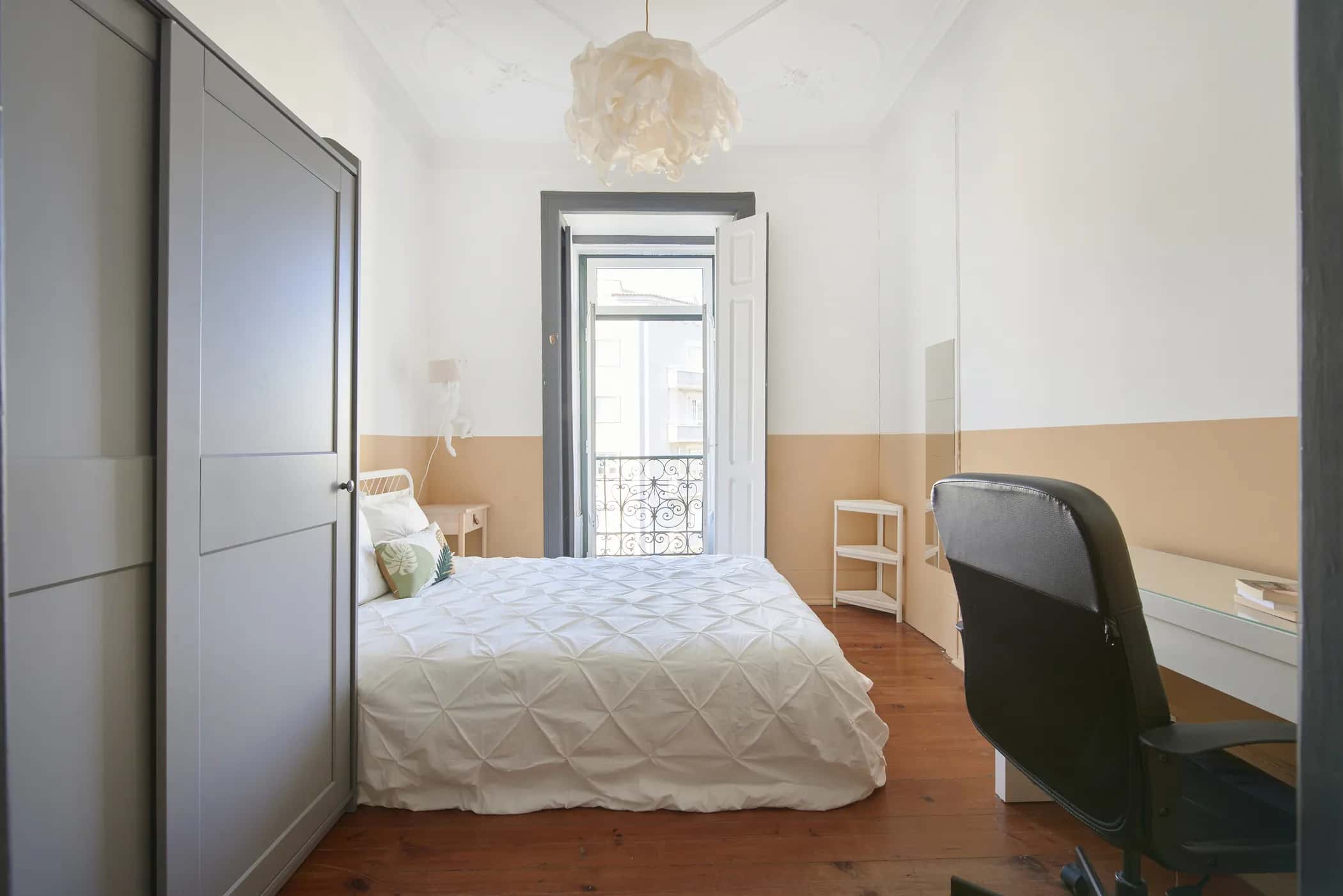 EN Situated on the fourth floor, this spacious apartment in Saldanha offers the perfect combination of comfort and convenience. Located in one of Lisbon’s most central and dynamic areas, you’ll be surrounded by cafés, restaurants, supermarkets, and all essential services, making everyday life easy and enjoyable. The neighborhood is exceptionally well-connected, with the Saldanha metro station (Red and Yellow Lines) and several bus routes nearby, allowing quick access to any part of the city, including the airport, the historic center, and university areas. The apartment features a fully equipped kitchen and 2 bathrooms, providing practicality and comfort in the shared areas. With 6 bedrooms, this apartment is the ideal choice for students or young professionals looking for a spacious and comfortable home in one of Lisbon’s most vibrant and well-connected neighborhoods. Saldanha is one of Lisbon’s most central and student-friendly neighborhoods, offering the perfect mix of convenience, accessibility, and city life. It’s surrounded by cafés, restaurants, supermarkets, and study-friendly spots, making it ideal for students who want everything close by. The area has excellent public transport connections — with the Saldanha metro station serving both the Red and Yellow Lines, providing quick access to the city center, university campuses, and the airport. Several bus routes also pass through the area, making it easy to reach any part of Lisbon. Saldanha is also close to major universities such as Instituto Superior Técnico and NOVA Medical School, attracting many students from Portugal and abroad. With its lively yet safe atmosphere, this neighborhood offers everything you need for a comfortable and balanced student life in Lisbon. Saldanha offers excellent public transport connections, making it easy to get anywhere in Lisbon quickly and conveniently. Metro: The Saldanha metro station serves both the Red Line (Linha Vermelha) and the Yellow Line (Linha Amarela), providing direct access to key areas such as the city center (Baixa/Chiado), Marquês de Pombal, and Lisbon Airport. Buses: Several Carris bus routes pass through Saldanha, connecting you to other parts of the city including Campo Grande, Alameda, and Cais do Sodré — perfect for daily commutes or exploring Lisbon. Trains: The nearby Entrecampos train station is just a short walk or quick bus ride away, offering regional connections to areas outside Lisbon. With these transport options, Saldanha ensures smooth and efficient travel for both students and professionals living in the area. Instituto Superior Técnico (IST) – One of Portugal’s top universities, located within walking distance, making Saldanha a popular choice among students. Atrium Saldanha & Monumental Shopping Center – Two modern shopping complexes offering cafés, restaurants, stores, and work-friendly spaces — perfect for study breaks or casual hangouts. Marquês de Pombal – Just a short metro ride away, this iconic Lisbon square connects Saldanha to the city’s main avenues and parks. Gulbenkian Garden & Museum – A peaceful green space just a 10-minute walk away, ideal for studying outdoors or relaxing after classes. Avenida da República – A lively avenue filled with shops, cafés, and restaurants, where you can experience Lisbon’s urban energy right at your doorstep. From cultural spots to relaxing green areas and excellent transport links, Saldanha offers everything students need to balance study, leisure, and city life. - No smoking.- No pets allowed.- No parties.- Trash must be taken out daily.- Short-term visitors are allowed (2 days). Longer period: €20 per day.- Utilities: included up to €25 per tenant.- Cleaning: offered by the landlord.- Bedding: pillows, duvet, and bed sheets are not provided.- Payment before check-in: first and last month, deposit and admin fee.- Check-ins: from Monday to Saturday from 4pm until 7:30pm. No check-ins on Sundays and bank holidays. Check-in is authorized only 24h after the payment is confirmed in our bank account and the contract is signed. The bedroom is a cozy and comfortable space, designed to offer residents a peaceful and restful environment. The room features a cozy double bed, a desk, a chair, and storage space for your belongings.