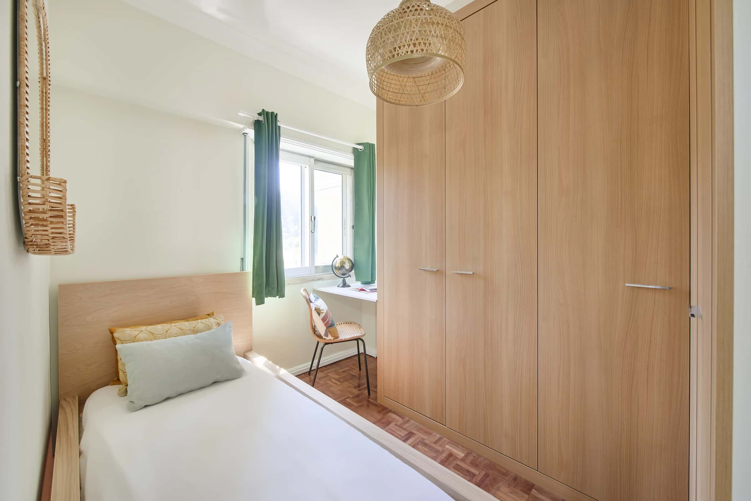 EN This cozy and bright 5-bedroom apartment in Benfica offers a perfect blend of comfort and convenience in one of Lisbon’s most residential and well-connected areas. Located on the third floor, the apartment features a welcoming atmosphere, ideal for anyone looking for a peaceful and pleasant place to live.It includes a fully equipped kitchen and 2 shared bathrooms, ensuring practicality for day-to-day living. With spacious and well-lit rooms, this apartment provides both comfort and a homely feel — perfect for enjoying quiet living while staying close to all amenities.The nearest supermarket is about 4 minutes away on foot, and the closest bus stop is approximately 2 minutes away, ensuring easy access to transportation and daily essentials. Benfica is a calm and traditional neighborhood located in the northwest of Lisbon. Known for its family-friendly atmosphere and local charm, the area offers plenty of green spaces, cafés, traditional bakeries, and local shops.It combines a residential lifestyle with great accessibility to other parts of the city, making it ideal for those seeking comfort and tranquility without being far from Lisbon’s center. Train: Benfica train station connects directly to Sete Rios and Lisbon’s main transport hubs.Buses: Multiple Carris bus routes link Benfica to Marquês de Pombal, Campo Grande, and Baixa.Metro: The Colégio Militar/Luz metro station (Blue Line) is nearby, providing a quick route to downtown Lisbon.With excellent transport options, Benfica offers both convenience and easy mobility throughout the city. - Estádio da Luz – Home of S.L. Benfica and one of Lisbon’s main landmarks. - Parque Silva Porto (Bairro de Benfica) – A lovely green park perfect for walking or relaxing outdoors. - Centro Comercial Colombo – One of Lisbon’s biggest shopping centers, with stores, restaurants, and a cinema. - Jardim Zoológico de Lisboa – A family-friendly attraction just a short metro ride away. - Mercado de Benfica – A traditional market offering fresh produce and local products.Benfica combines tradition, comfort, and accessibility — an excellent choice for those who value a peaceful lifestyle with everything close at hand. - No smoking.- No pets allowed.- No parties.- Trash must be taken out daily.- Short-term visitors are allowed (2 days). Longer period: €20 per day.- Utilities: included up to €25 per tenant.- Cleaning: offered by the landlord.- Bedding: pillows, duvet, and bed sheets are not provided.- Payment before check-in: first and last month, deposit and admin fee.- Check-ins: from Monday to Saturday from 4pm until 7:30pm. No check-ins on Sundays and bank holidays. Check-in is authorized only 24h after the payment is confirmed in our bank account and the contract is signed. The bedroom is a cozy and comfortable space, designed to offer residents a peaceful and restful environment. The room features a cozy single bed, a desk, a chair, and storage space for your belongings.