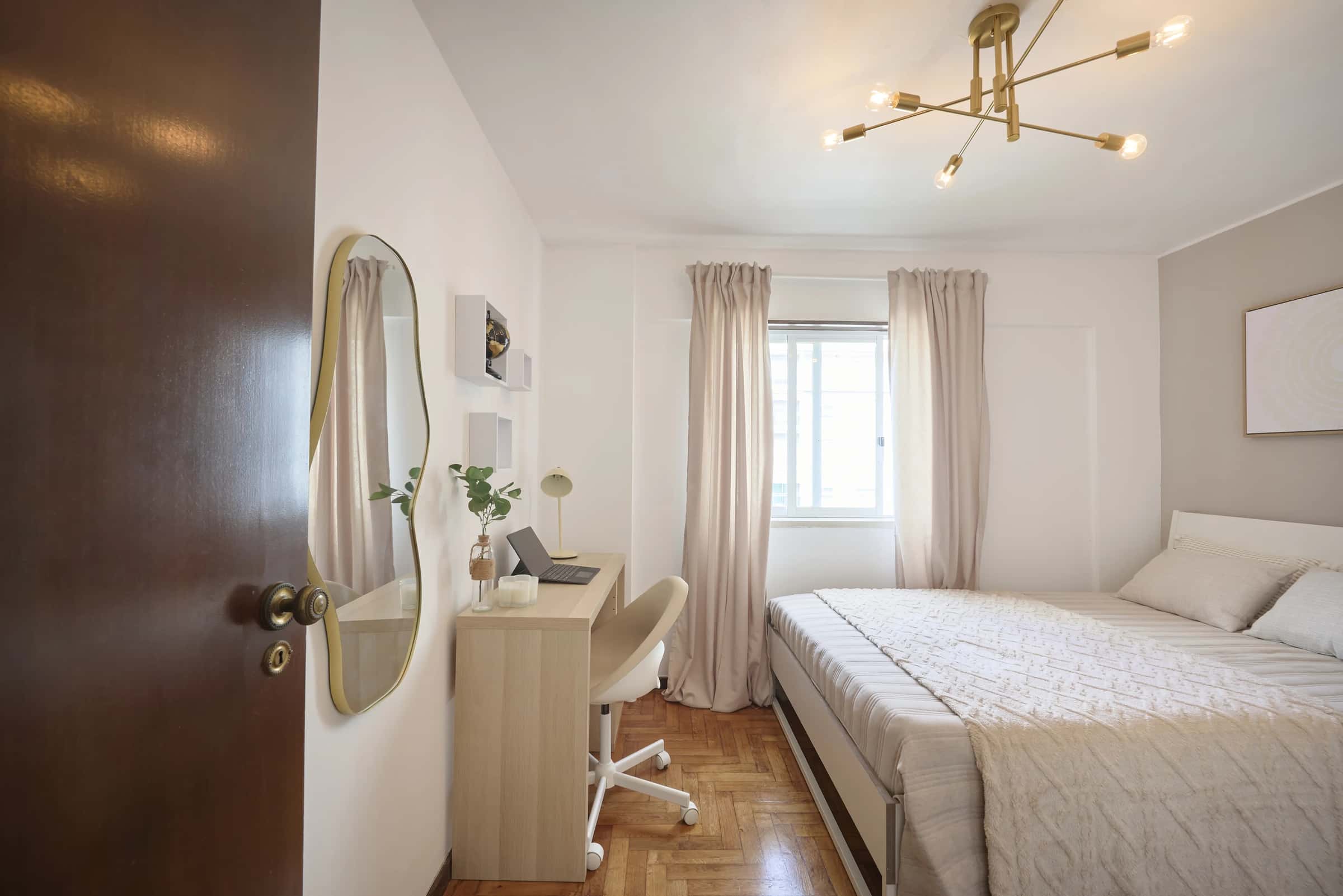 EN This cozy 5-bedroom apartment in Campo Grande offers a warm and comfortable atmosphere in one of Lisbon’s greenest and most convenient neighborhoods. Located on the seventh floor, the apartment features 2 bathrooms and a welcoming layout that provides both comfort and practicality for everyday living.Spacious and filled with natural light, this apartment is ideal for those who value a calm and pleasant environment while staying close to the city’s main areas. Cafés, restaurants, supermarkets, and essential services are all within walking distance, ensuring convenience and an excellent quality of life.The nearest supermarket is about 3 minutes away on foot, and the closest bus stop is approximately 2 minutes away, making daily commutes simple and efficient. Campo Grande is one of Lisbon’s most spacious and well-connected neighborhoods, known for its large green park, traditional cafés, and excellent accessibility. The area combines a peaceful residential feel with modern conveniences, offering plenty of shops, restaurants, and services nearby.It’s also home to one of the city’s main university campuses, making it a lively yet relaxed part of Lisbon. Metro: Campo Grande station (Green and Yellow Lines) offers direct connections to Saldanha, Marquês de Pombal, and Baixa-Chiado.Buses: Several Carris routes pass through the area, ensuring quick access to different parts of Lisbon.Trains: Entrecampos train station is nearby, linking the neighborhood to regional and suburban destinations.Campo Grande’s excellent public transport network makes it one of Lisbon’s most convenient areas to live in. - Jardim do Campo Grande – A large park perfect for walks, jogging, or relaxing outdoors.- Universidade de Lisboa – One of Portugal’s leading universities, located nearby.- Biblioteca Nacional de Portugal – The National Library, a major cultural landmark.- Estádio José Alvalade – Home to Sporting CP, just a few minutes away.- Campo Pequeno – A nearby shopping and entertainment hub.Campo Grande offers the perfect balance of tranquility, accessibility, and city life, making this cozy apartment an excellent choice for comfortable living in Lisbon. - No smoking.- No pets allowed.- No parties.- Trash must be taken out daily.- Short-term visitors are allowed (2 days). Longer period: €20 per day.- Utilities: included up to €25 per tenant.- Cleaning: offered by the landlord.- Bedding: pillows, duvet, and bed sheets are not provided.- Payment before check-in: first and last month, deposit and admin fee.- Check-ins: from Monday to Saturday from 4pm until 7:30pm. No check-ins on Sundays and bank holidays. Check-in is authorized only 24h after the payment is confirmed in our bank account and the contract is signed. The bedroom is a cozy and comfortable space, designed to offer residents a peaceful and restful environment. The room features a cozy double bed, a desk, a chair, and storage space for your belongings.