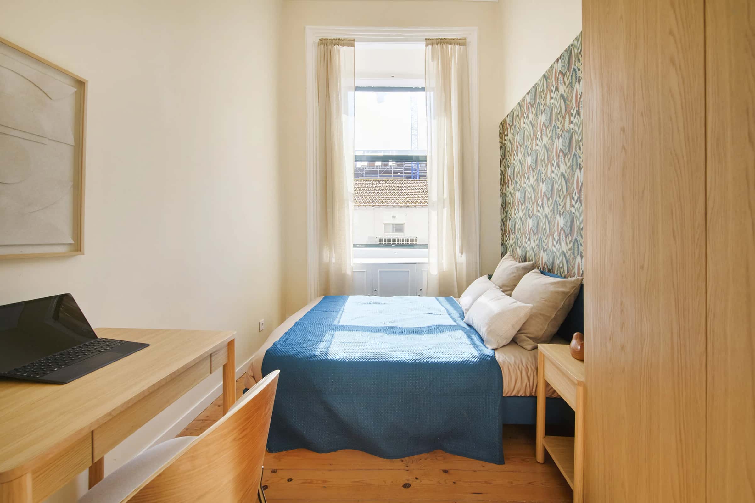 EN This cozy first-floor apartment in Santos offers comfort and practicality in a lively area of Lisbon. Featuring 8 bedrooms, 3 bathrooms (2 full and 1 half bathroom), it is designed to provide a welcoming and functional living space. The apartment also includes a bright and fully equipped kitchen, ideal for everyday use.With its generous space and inviting atmosphere, this apartment is perfect for those who value both comfort and location. Shops, cafés, restaurants, and essential services are all within easy reach, making it a great place to enjoy life in Lisbon. The nearest supermarket is about a 2-minute walk, and the closest bus stop is approximately 3 minutes away, ensuring convenient access to transport and nearby amenities. Santos is a vibrant and historic neighborhood in Lisbon, known for its lively streets, riverside views, and cultural atmosphere. The area offers a mix of shops, cafés, restaurants, and essential services, making it ideal for comfortable urban living. Train: Santos station provides convenient access to the Cascais Line, connecting easily to central Lisbon and the coastal areas.Buses: Several main bus lines serve the Santos area, including the 714, 727, 736, and 758 lines, offering easy connections to other parts of the city.Thanks to its central location in Santos, living here means excellent public transport options and quick access to Lisbon’s main attractions. - Miradouro de Santo Amaro – A scenic viewpoint overlooking the river and city.- Museu da Carris – A cultural attraction showcasing Lisbon’s historic transport.- Riverside cafés and restaurants – Offering a vibrant dining and leisure scene.- Local shops and markets – Convenient for daily errands and exploring the neighborhood.- Cultural and historic landmarks – Adding charm and character to everyday life.Santos offers a mix of culture, leisure, and accessibility, making this spacious and well-equipped apartment a perfect choice for comfortable and authentic living in Lisbon. - No smoking.- No pets allowed.- No parties.- Trash must be taken out daily.- Short-term visitors are allowed (2 days). Longer period: €20 per day.- Utilities: included up to €25 per tenant.- Cleaning: offered by the landlord.- Bedding: pillows, duvet, and bed sheets are not provided.- Payment before check-in: first and last month, deposit and admin fee.- Check-ins: from Monday to Saturday from 4pm until 7:30pm. No check-ins on Sundays and bank holidays. Check-in is authorized only 24h after the payment is confirmed in our bank account and the contract is signed. The bedroom is a cozy and comfortable space, designed to offer residents a peaceful and restful environment. The room features a cozy double bed, a desk, a chair, and storage space for your belongings.