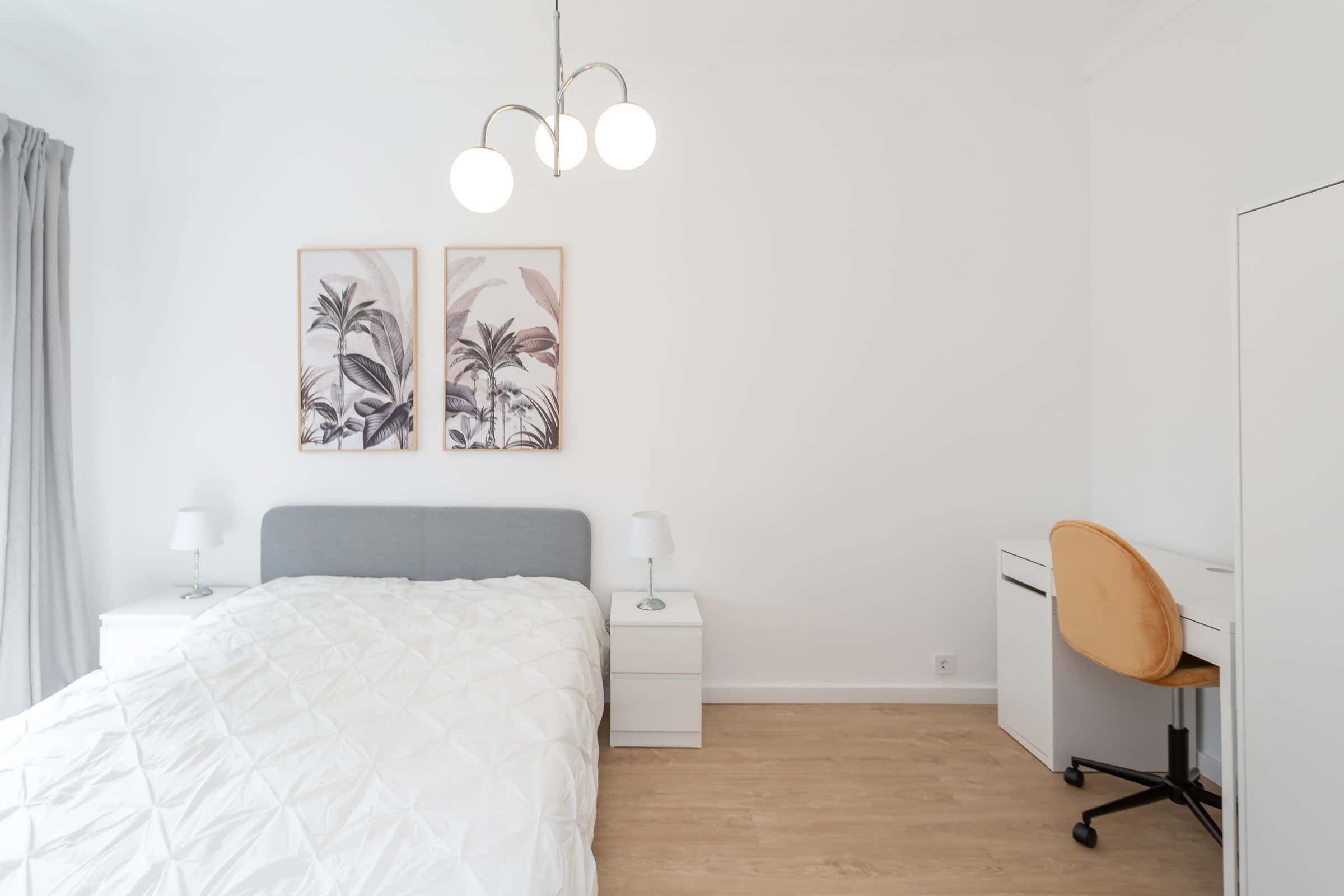 EN This cozy second-floor apartment in Queluz offers comfort and practicality in a charming and well-connected neighborhood. Featuring 5 bedrooms and 2 bathrooms (1 shared and 1 en-suite), it provides a welcoming living environment ideal for both relaxation and everyday life. The apartment also includes a fully equipped and bright kitchen, perfect for modern and convenient living.With its warm and inviting atmosphere, this apartment is ideal for those who value both comfort and location. Shops, cafés, restaurants, and essential services are all within easy reach. The nearest supermarket is about a 2-minute walk, and the closest bus stop is approximately 3 minutes away, ensuring convenient access to transport and local amenities. Queluz is a peaceful and residential area, known for its calm streets and proximity to Lisbon. The neighborhood offers a mix of local shops, cafés, restaurants, and essential services, providing a comfortable and convenient urban living experience. Train: Nearby stations provide easy access to central Lisbon and surrounding areas.Buses: Several bus lines operate in the area, ensuring convenient connections to other parts of Queluz and Lisbon.Thanks to its well-connected location, living in Queluz means easy access to public transport and nearby attractions. - Palácio Nacional de Queluz – A historic palace and gardens offering cultural and scenic experiences.- Local parks and green spaces – Perfect for relaxation and outdoor activities.- Shops, cafés, and restaurants – Convenient for daily needs and enjoying the neighborhood.- Community and cultural landmarks – Adding charm and authenticity to everyday life.- Nearby train stations – Facilitating easy travel to Lisbon and surrounding areas.Queluz combines calm residential living, accessibility, and local charm, making this cozy and well-equipped apartment a perfect choice for comfortable and authentic living. - No smoking.- No pets allowed.- No parties.- Trash must be taken out daily.- Short-term visitors are allowed (2 days). Longer period: €20 per day.- Utilities: included up to €25 per tenant.- Cleaning: offered by the landlord.- Bedding: pillows, duvet, and bed sheets are not provided.- Payment before check-in: first and last month, deposit and admin fee.- Check-ins: from Monday to Saturday from 4pm until 7:30pm. No check-ins on Sundays and bank holidays. Check-in is authorized only 24h after the payment is confirmed in our bank account and the contract is signed. The bedroom is a cozy and comfortable space, designed to offer residents a peaceful and restful environment. The room features a cozy double bed, a desk, a private bathroom, and storage space for your belongings.