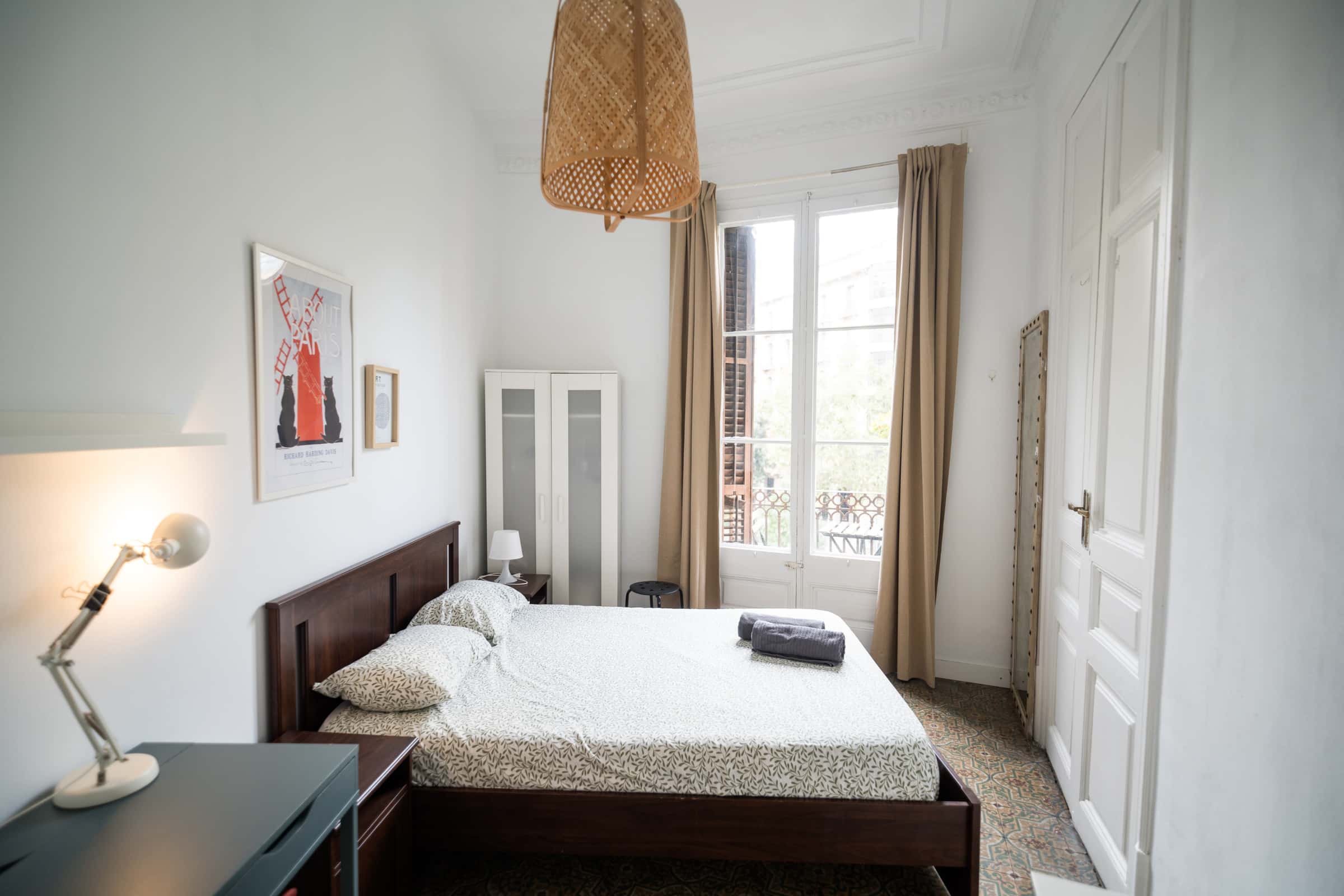 Habitación con cama doble, wifi, escritorio y una ventana exterior. Ubicación ideal para moverte por el centro sin depender de largos trayectos. Este cuarto está pensado para quienes buscan un espacio práctico y luminoso. Cuenta con una cama doble con ropa de cama, un escritorio amplio para trabajar o estudiar y una ventana que da a la calle, lo que aporta luz natural y ventilación durante el día. La habitación incluye cerradura con llave, toallas, wifi y las comodidades básicas para una estancia confortable. Dentro del piso encontrarás una cocina compartida equipada para preparar comidas sencillas y un baño también compartido con los demás huéspedes. Es un ambiente tranquilo, ordenado y pensado para que todos puedan convivir cómodamente sin perder privacidad. El edificio dispone de ascensor y el acceso es directo desde la entrada principal. Llegar es sencillo, tanto si vienes caminando desde el centro como si usas transporte público. La zona ofrece una mezcla de vida local y urbana: cafeterías con menú del día, supermercados pequeños, bares relajados, librerías y calles con movimiento constante. Es un área muy práctica para quienes quieren tener servicios, comercio y opciones para comer a pocos minutos a pie. Moverte desde aquí es muy sencillo. Tienes varias paradas de metro y autobús en un radio corto, que conectan con lugares emblemáticos como la Sagrada Familia, Casa Batlló, el casco antiguo, el paseo marítimo o los barrios más visitados del centro. Puedes caminar a zonas muy transitadas sin necesidad de transporte, lo que hace que la ubicación sea ideal si planeas explorar la ciudad a pie. Si llegas desde el aeropuerto, el Aerobús te deja en una zona central desde donde solo tendrás que caminar unos minutos hasta el piso. Todo queda a mano: tiendas, parques, restaurantes, centros culturales y los puntos turísticos más buscados. Exterior double room in a central and convenient area