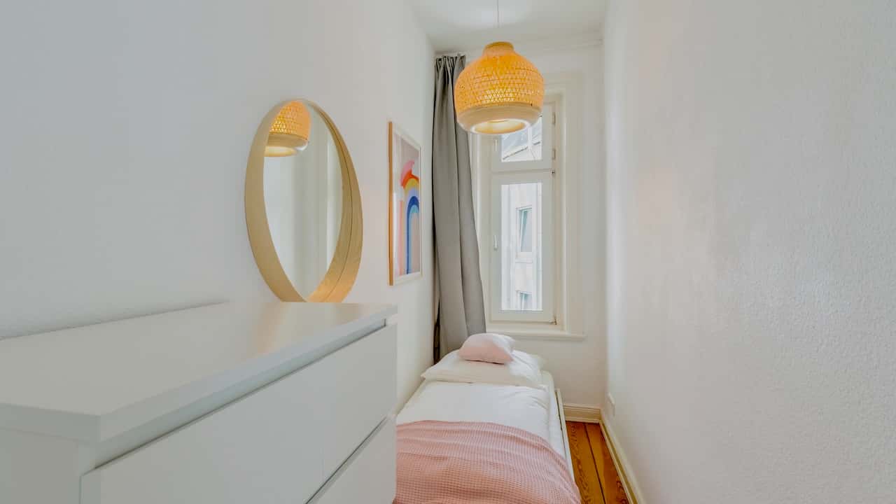 Centrally located in Hamburg Eimsbüttel Our smallest coliving location is located in Hamburg-Eimsbüttel, a neighborhood of locals. Offering a shared apartment with a kitchen and small inner yard, you can choose between private suites of up to 15 m2. This is STACEY coliving on a budget within a community you will not want to leave. Browse our availability, sign all documents online, and experience the STACEY magic yourself! This suite takes care of all your basic needs and is the smallest category at all our locations. Nevertheless, it is equipped with all esentials. Move-in and make memories! Interior: Single bed, sideboard, mirror, hangers, artwork & bedding Note: Furniture and suite layout might vary within the suite category