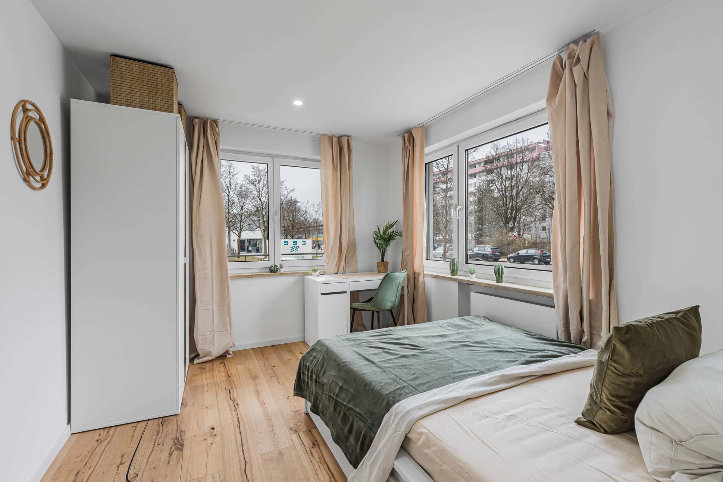 Are you moving to one of the most beautiful cities in the world? Your room should reflect that. CO-LIVING-MUNICH offers stylish, high-quality furnished rooms in shared apartments in central Munich. The fully renovated apartment is located on the 3rd floor of a well-maintained multi-family building, just a 5-minute walk from public transportation. Shops and everyday amenities are within walking distance. Bright rooms with modern interiors ensure comfort, quality, and a welcoming atmosphere. Each room is fully furnished with a bed, wardrobe, desk, and chair—move in with just your suitcase. The apartment features a bathroom with a walk-in rain shower, a modern fitted kitchen with dishwasher, and a washing machine with drying function. Balcony/loggia with seating included. Heating and electricity are covered in the all-inclusive rent; internet and broadcasting fees are shared. A lockable cellar compartment is included. First occupancy after renovation. Key conditions: Minimum rental period: 6 months Notice period: 3 months Deposit: €1,500 No pets No double occupancy Images shown are sample photos from comparable apartments in our portfolio.