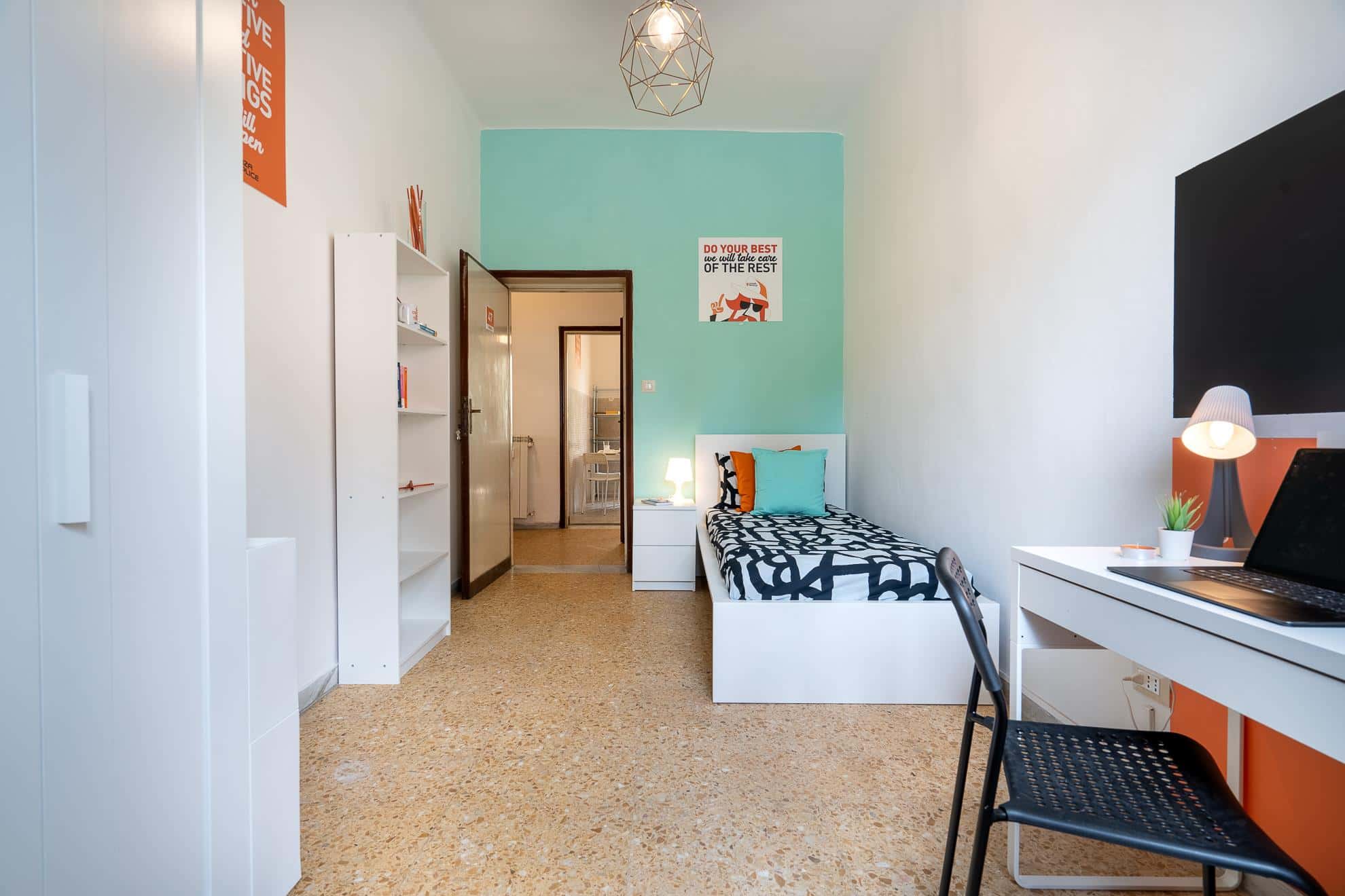 [ITA] Zona Aereoporto (vicina al centro), posizione strategica e ambita, si affitta una bellissima stanza singola Stanza Semplice ristrutturata appositamente per offrire comfort e comodità ai nostri studenti. La stanza è dotata di, letto singolo, armadio 3 ante, scrivania con portaoggetti, comodino, tendaggi, specchio, libreria. I colori delle pareti favoriscono il buon umore e aiutano nello studio. *Siccome in questo momento stiamo terminando di ristrutturare l'appartamento, le immagini dell'annuncio sono rappresentativa di una stanza di simili dimensioni e disposizione degli arredi (le ns stanze come colori e arredi sono tutte uguali!) Situato al primo piano, circa 90 mq di superficie. È composto da cucina non abitabile più una saletta da pranzo, 1 Bagno e 4 stanze singole. L'appartamento è ottimamente ristrutturato in funzione di tutto ciò che occorre ai nostri studenti. Dotato di WI-FI, lavatrice, cucina equipaggiata. [ENG] In the Airport area (close to the city center), a strategic and sought-after location, we're renting a beautiful single room. This simple room has been renovated specifically to offer our students comfort and convenience. The room is equipped with a single bed, a three-door wardrobe, a desk with storage, a bedside table, curtains, a mirror, and a bookcase. The wall colors promote a positive mood and aid study. *Since we are currently finishing renovating the apartment, the listing images are representative of a room of similar size and furniture layout (our rooms are all the same in terms of color and furnishings!) Located on the first floor, approximately 90 square meters. It consists of a separate kitchen, a small dining room, one bathroom, and four single bedrooms. The apartment has been beautifully renovated to provide everything our students need. It features Wi-Fi, a washing machine, and a fully equipped kitchen.