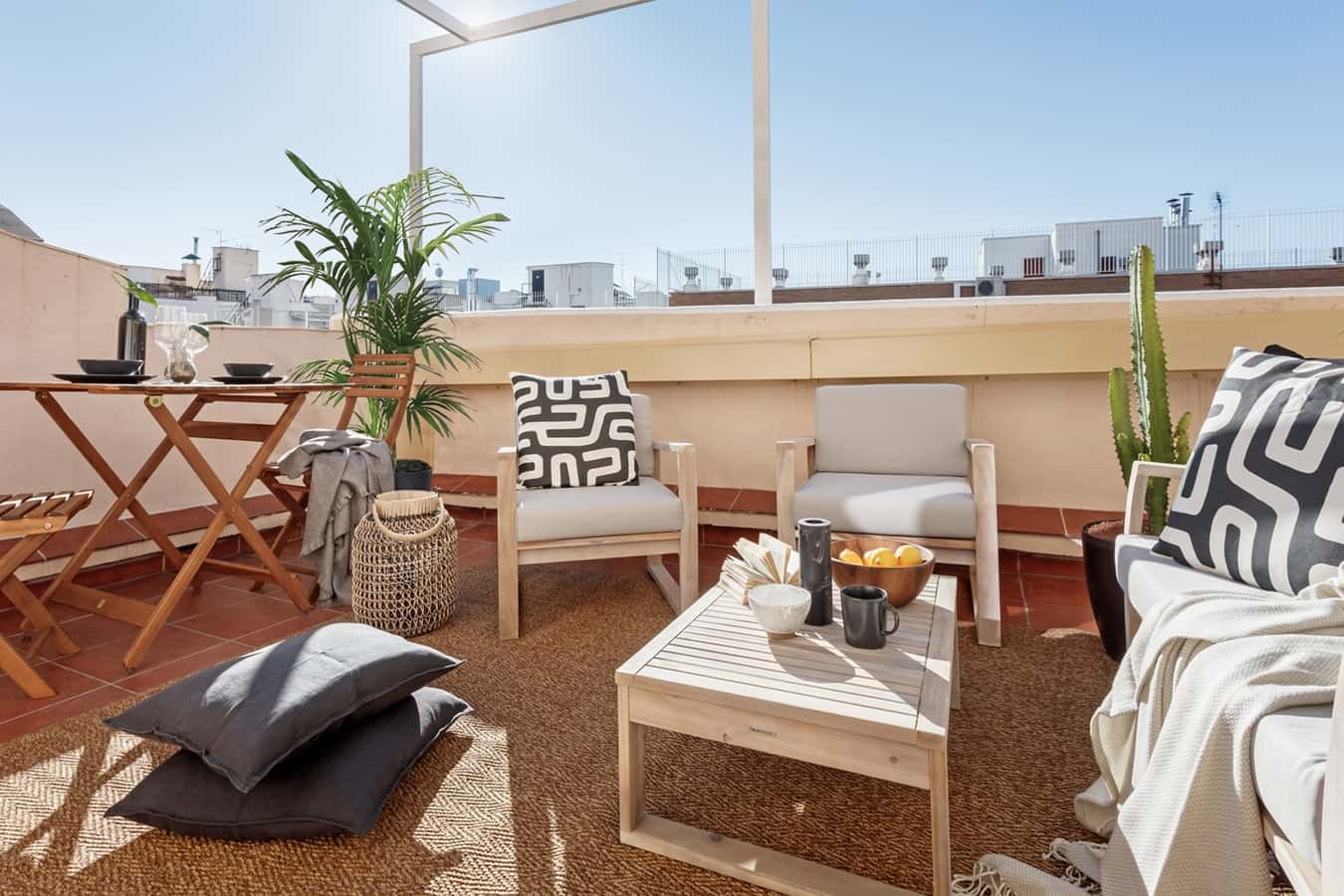 Derawan blends playful Madrilenian design with Saharan scenes. This 142 square meter home revels in beauty throughout all two bedrooms, two bathrooms, and continues into the remainder of the space. Located in the heart of Chamberi, Derawan provides a prime location for guests looking to experience authentic Madrid with its assortment of traditional tapas bars and stunning architecture. Guests are immediately drawn to Derawan’s traditional and colorful tiling that lines the entrance and continues throughout the whole space. Head right to discover the open-concept living and dining area. A stylish workstation sits to the right of the room while the four-person dining set to the left invites guests to indulge in a dinner party over its handcrafted furnishings. A step further into the room leads to a spacious salon complete with a full entertainment system and plush seating. Head through the living room’s french doors to find a sunbaked, glorious patio. Rich in space, the patio offers an outdoor living area on one side and a romantic tabletop for two on the other, all while providing eye-catching city views. Back inside, the door to the right opens up to Derawan’s kitchen. Granite countertops and backsplash highlight the home’s deluxe feel while modern appliances and cooking utensils are indicative of Derawan’s functionality. Guests can enjoy a snack or morning meal at the two-person breakfast nook in the right-hand corner. The hallway to the other side of the entrance is reserved for relaxation. The first bedroom past the entryway opens up to pure bliss. A handcrafted wooden accent piece hangs above the queen-sized bed. Floor to ceiling closet space sits in the right-hand corner while the large windows next to it bathe the room in natural light. Down the hallway to the right leads to the detached bathroom. Paralleling sandy escapes, the beige palette is seen throughout the travertine tiling, amber-hued accessories, and magnificent shower-tub combination. The space concludes with the ensuite bedroom. Geometric, wooden patterns cover the accent wall behind the queen-sized bed. The room transforms into a working space to the right with a nook dedicated to an ergonomic desk and built-in storage behind it. The door to the right inside the bedroom leads to the ensuite bathroom. Guests are greeted with an all-glass walk-in shower to the left with the same muted tones from the detached bathroom. All linens and bedding are provided. *Please, note that this apartment does not allow pets. *Guests will be informed of any additional charges in the final contract. *We cannot be held liable for any noises (construction, or street noise) done outside the apartment. We also cannot be liable for any rooms without air conditioning (all the rooms with air conditioner will be explicitly explained in our description). We will not accept any reservation cancellations or refund request related to these two issues. *Our in-house design team expertly selects all apartment furniture and decor to ensure the highest level of quality and comfort. As part of consistent home upkeep, design improvements, and photo staging, there may be minor differences in furnishings seen in the photos and what you find in the apartment. Inquire with a sales agent for any questions or doubts.