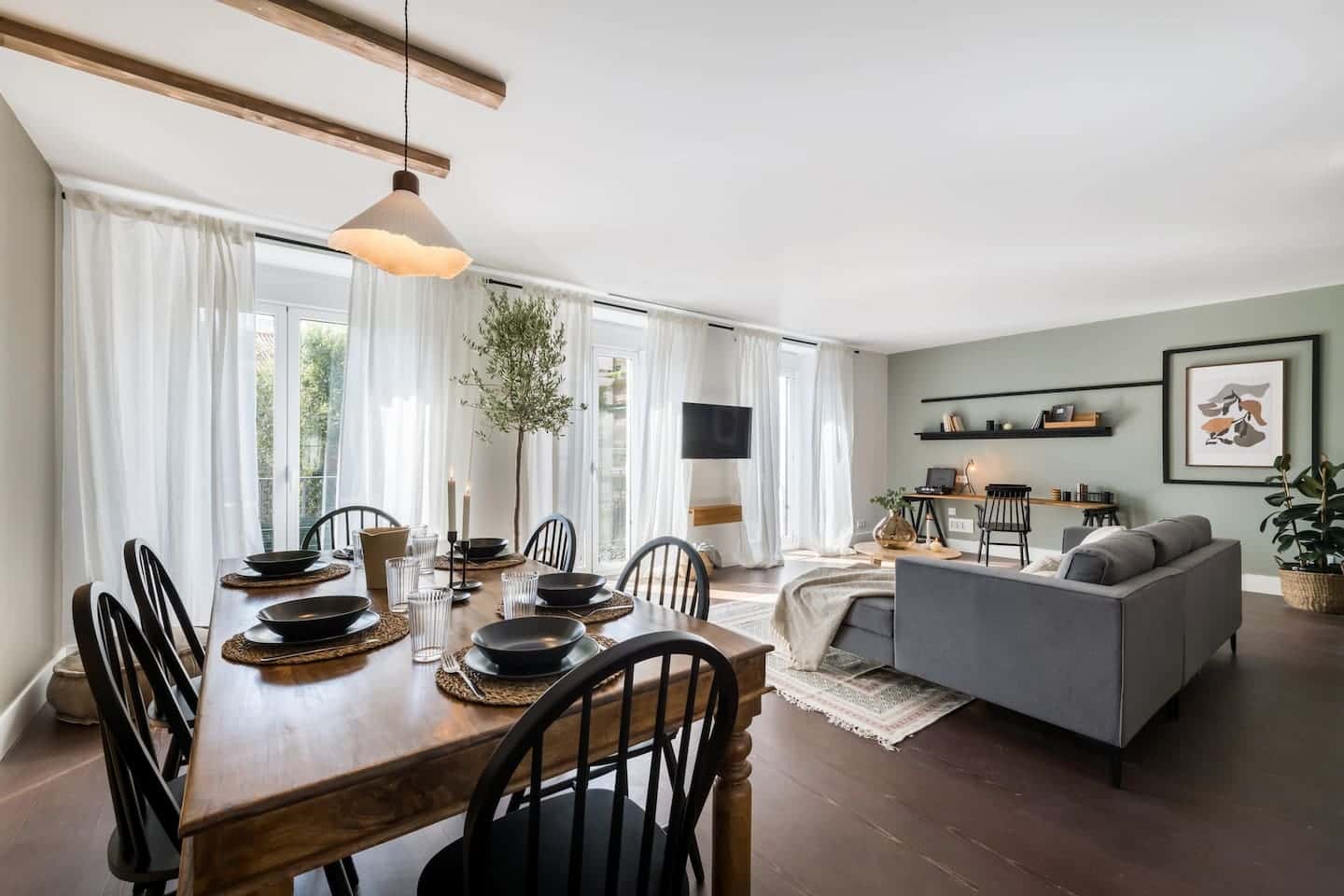 EN Our mission is to empower individuals to immerse themselves in new places by having a home wherever they go. We do this by providing artfully designed fully furnished and serviced apartments for stays of one month or more. We are currently present in some of the most important cities in Europe. Chianti couples a symmetry in design with soft light green and gray hues which contributes to a calming atmosphere. The 110 square meter apartment has 2 bedrooms, 2 baths and 2 balconies. There are dark hardwood floors throughout the brightly illuminated space. Upon walking in, find an open plan kitchen finished with gray blue vinyls and fully equipped with all cooking utensils and appliances. A small laundry room is next to the kitchen. The large kitchen island doubles as a bar and looks upon the spacious living room. The dining area, fitted with a large table, is decorated with custom made wooden beams doubling as lamps on the wall. The lounge area has a comfortable couch facing the Smart TV. A dedicated work space with desk and chair against a light green wall. Mounted on the wall, a geometric black design frames an art piece. At the other end of the apartment, find two large bedrooms fitted with queen-sized beds and ample storage space. The first bedroom features a geometric composition of frames and wooden beams mirroring those of the dining room wall. The second bedroom has a custom made wooden border. Both bathrooms are modern with full showers and fresh towels. This apartment comes equipped with ducted air system for absolute comfort. *We welcome pets, fees are subject to apply. Guests will be informed of any additional charges in the final contract. *We cannot be held liable for any noises (construction, or street noise) done outside the apartment. We also cannot be liable for any rooms without air conditioning (all the rooms with air conditioner will be explicitly explained in our description). We will not accept any reservation cancellations or refund request related to these two issues. *Our in-house design team expertly selects all apartment furniture and decor to ensure the highest level of quality and comfort. As part of consistent home upkeep, design improvements, and photo staging, there may be minor differences in furnishings seen in the photos and what you find in the apartment. Inquire with a sales agent for any questions or doubts. NRA ESFCNT00002810800022479500000000000000000000000000007