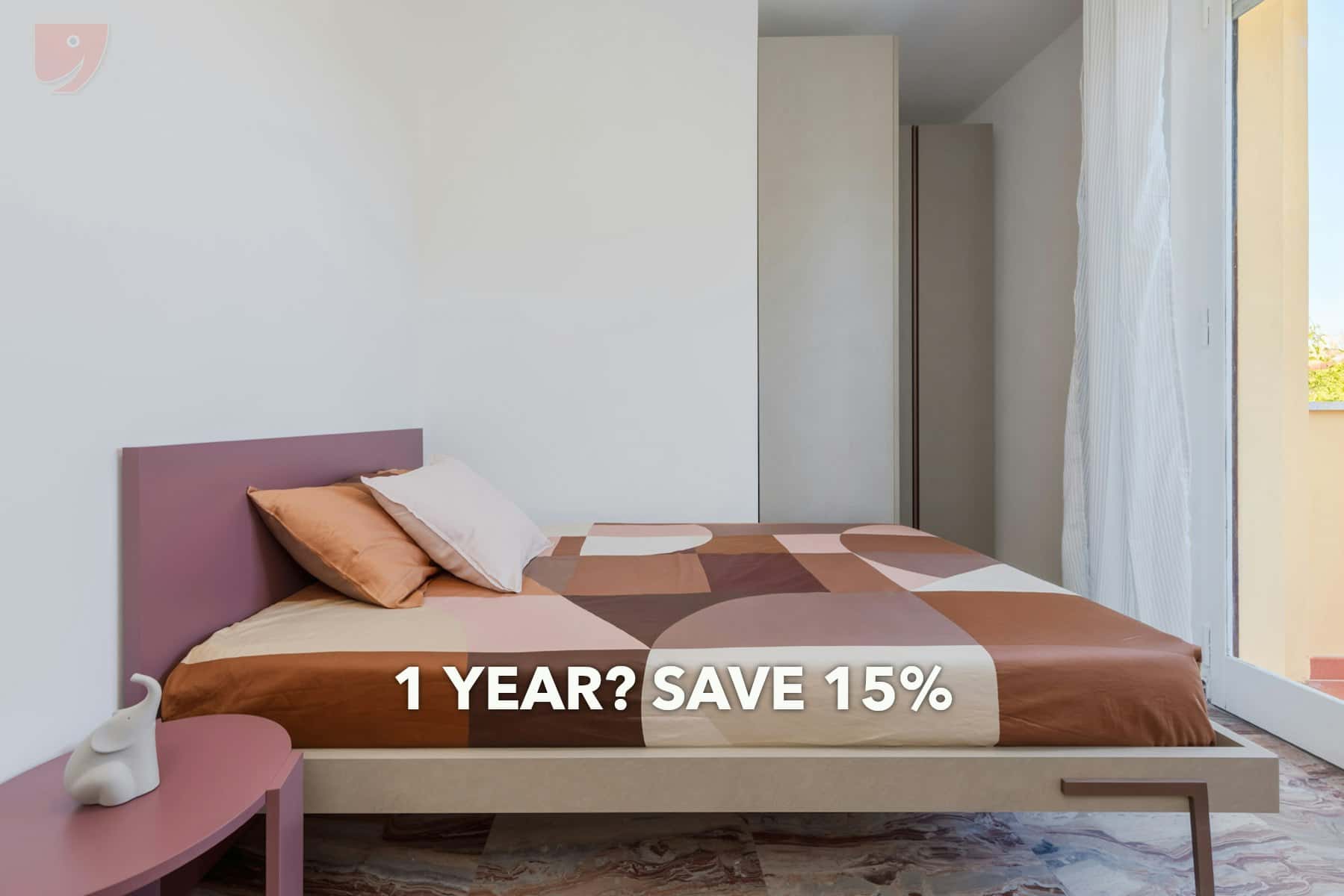 [ITA] Nella nostra azienda amiamo i soggiorni a lungo termine! Usufruite di sconti significativi se soggiornate con noi per 12 mesi. Se dovete soggiornare per meno di 12 mesi ma trovate qualcuno che vi sostituisca per il periodo rimanente, entrambi beneficerete dei nostri sconti sostanziali. Richiedete un preventivo oggi stesso e iniziate a risparmiare! Questa stanza offre un ambiente invitante e organizzato con cura. Il letto a una piazza e mezza, dotato di una rete a doghe e di un materasso ortopedico, assicura un riposo confortevole. Accanto c'è un comodino tondo, perfetto per appoggiare libri o bevande. L'armadio angolare con cassettiera interna offre ampio spazio per gli abiti. La scrivania da 135 x 60 cm, completata dalla comoda sedia BABILA Pedrali, crea uno spazio ideale per studiare o lavorare in modo produttivo. Per aggiungere un tocco finale di tranquillità, il balcone offre un luogo perfetto per rilassarsi e godere dell'aria aperta. Non perdere l'opportunità di vivere in uno spazio pensato per il successo accademico e il comfort personale! Questo appartamento offre un ambiente accogliente e ben organizzato. Con 9 stanze e 3 bagni, è ideale per la condivisione tra studenti o giovani professionisti. La cucina abitabile è perfetta per preparare pasti insieme, mentre la zona living rappresenta uno spazio comune dove rilassarsi o socializzare. Sono presenti comfort moderni come lavatrice, asciugatrice, lavastoviglie e Wi-Fi, rendendo la vita quotidiana semplice e piacevole. Lo stile minimalista degli arredi assicura la massima funzionalità. [ENG] At our company, we love long-term stays! Enjoy significant discounts when you stay with us for 12 months. If you need to stay for less than 12 months but find someone to take over for the remaining period, both of you will benefit from our substantial discounts. Ask for a quote today and start saving! This room offers an inviting and carefully organized environment. The queen-size bed, equipped with a slatted base and an orthopedic mattress, ensures a comfortable rest. Next to it there is a round table, perfect for placing books or drinks. The corner wardrobe with internal drawers offers ample space for clothes. The 135 x 60 cm desk, complemented by the comfortable BABILA Pedrali chair, creates an ideal space for studying or working productively. To add a final touch of tranquility, the balcony offers a perfect place to relax and enjoy the outdoors. This apartment offers a welcoming and well-organized environment. With 9 rooms and 3 bathrooms, it is ideal for sharing between students or young professionals. The eat-in kitchen is perfect for preparing meals together, while the living area represents a common space where you can relax or socialise. Modern conveniences such as a washing machine, dryer, dishwasher and Wi-Fi are present, making daily life simple and enjoyable. The minimalist style of the furnishings ensures functionality.