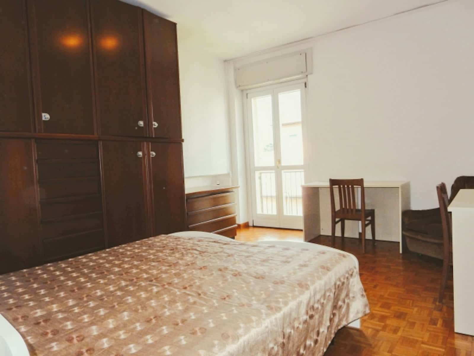 [ITA] Ampia stanza doppia con balconcino, arredata con due letti singoli (uniti a formare un matrimoniale), due scrivanie con sedie ottimamente illuminate, una cassettiera ed un grande armadio a 4 ante. La luce che entra dalla porta finestra creado un ambiente luminoso ideale per lo studio. Appartamento di 90 mq situato in zona San Pio X, quartiere residenziale e tranquillo della città di Trento, che dista solo 5 minuti in bici dalla Biblioteca BUC. Nelle vicinanze, inoltre, ci sono tutti i servizi utili tra cui supermercati, bar, farmacie, locali, ristoranti, tabaccherie. L‘abitazione, al terzo piano di un condominio dotato di ascensore, è composta di una cucina funzionale, multi-accessoriata con piano snack e sgabelli in stile americano, tre stanze singole, di cui due con accesso al balcone, un bagno finestrato con vasca e lavatrice. [ENG] Large double room with balcony, furnished with two single beds (joined to form a double), two desks with well-lit chairs, a chest of drawers and a large 4-door wardrobe. The light that enters through the French window creates a bright environment ideal for the study. A apartment of 90 square meters located in the San Pio X area, a quiet residential area of the city of Trento, which is only 5 minutes by bike from the BUC Library . Furthermore, nearby there are all useful services including supermarkets, bars, pharmacies, clubs, restaurants, tobacconists. The house, on the third floor of an apartment building with a lift, consists of a functional kitchen , multi-equipped with American-style snack top and stools, three single rooms, two of which with access to the balcony, a bathroom with window with bathtub and washing machine.