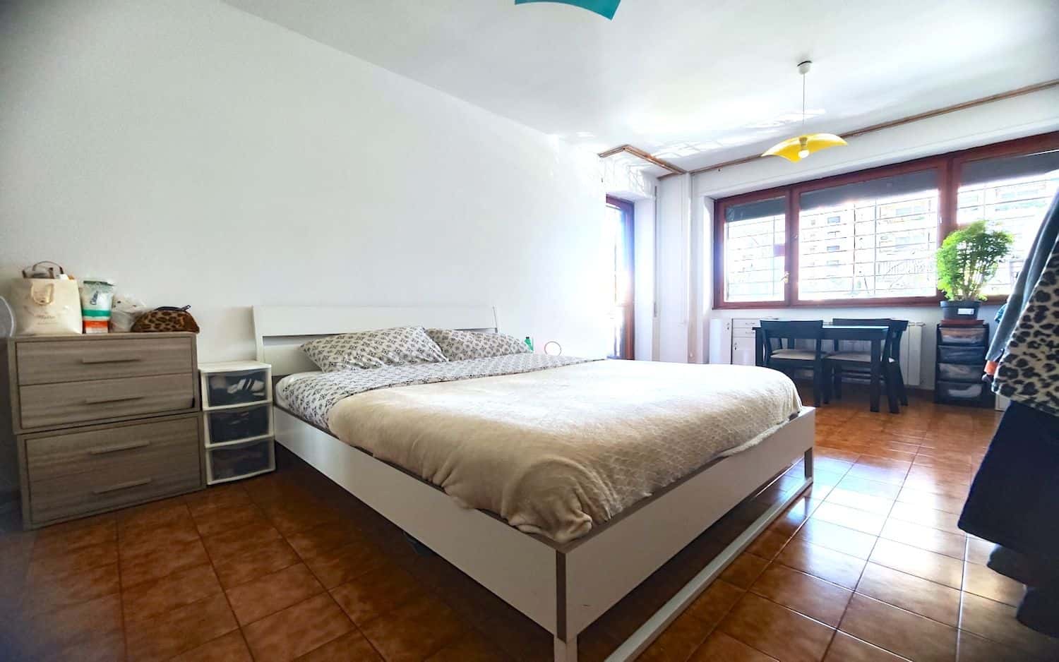 Spacious room with double bed size, private fridge and balcony for rent in a 4 students/young workers apartment with 2 bathrooms in Talenti area. The apartment is on the 1st floor with lift, it is 35 minutes walking far from Conca d'Oro metro station and has supermarkets, bars and pharmacies in the nearby.