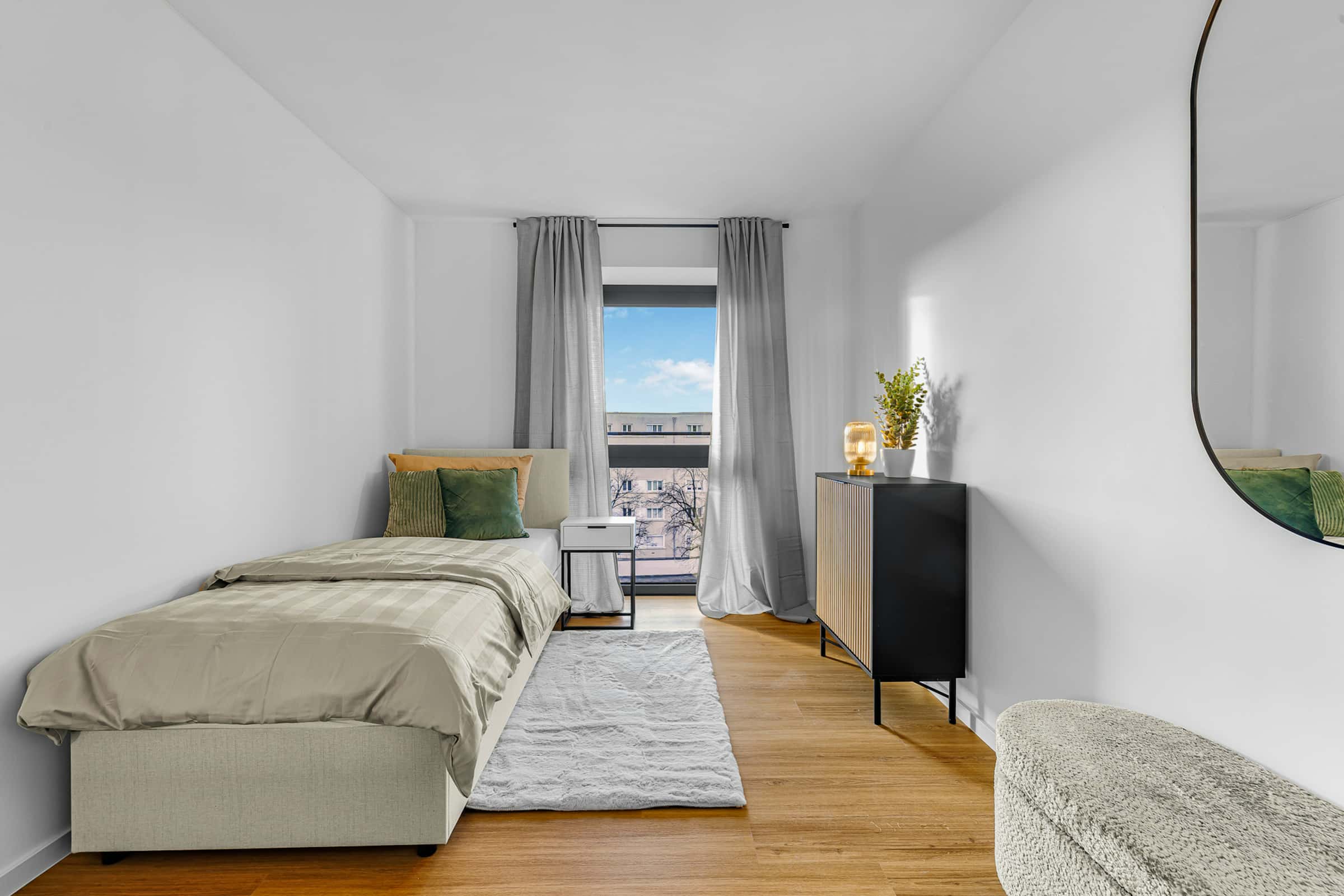 🏠 Ginhardtstraße 40 – Newly renovated 4-bedroom shared flat This brand-new, fully refurbished apartment combines elegant design, modern comfort, and a welcoming shared-living concept. Each of the five identical flats offers four fully furnished rooms, two stylish bathrooms with showers, a separate guest toilet, a modern kitchen with dishwasher and washing machine, and a bright dining area. The building also includes an elevator and private basement storage units for each tenant. ☀️ Room 3 – Bright & Functional (12.1 m2 | €850) Similar in size to Room 2 but with slightly different light orientation, Room 3 feels fresh and vibrant. The combination of bright walls, soft textiles, and high-quality materials gives the room a welcoming character. An excellent option for those who prefer a neat, balanced space for both living and working. ✅ Comfortable layout and good natural light ✅ Easy access to shared bathroom and kitchen ✅ Elegant, timeless design🛋️ Shared Areas Modern kitchen with dining area, oven, dishwasher, and washing machine Two elegant bathrooms with showers Separate guest toilet High-speed Wi-Fi included Elevator and basement storage 📍 Location (Laim, Munich) Located at Ginhardtstraße 40, 80639 Munich (Laim), the flat sits on a quiet residential street with excellent everyday convenience. You’re close to Laim S-Bahn station (S1–S8) for fast city access (Hackerbrücke/Hauptbahnhof in a few minutes), and U5 Laimer Platz is also within easy reach. Several bus and tram connections (incl. tram 19) run along the nearby main streets, so getting to the city centre and universities is quick and straightforward. 🚆 Laim Station (S1 – S8): Direct to city centre in minutes 🚇 U5 Laimer Platz and 🚋 Tram 19 nearby 🛒 Supermarkets (REWE, Lidl, Aldi) 5–10 min walk ☕ Cafés & bakeries around the corner 💪 Gyms (FitX & Clever Fit) close by 🌳 Green parks for running or relaxing Perfect for students and young professionals looking for a beautiful, fully furnished home with style and comfort. 🌟The shared apartment is home to young people between 18 and 30 who are open, relaxed, and helpful. It's all about learning together, supporting each other, and living comfortably together, where everyone can enjoy some peace and quiet. If you're looking for a friendly and modern shared apartment with a comfortable atmosphere, you're a perfect fit! 150 € additional costs are added to the rental price Bitte beachte, dass auf Anfrage auch ein Video der WG bereitsgestellt werden kann. Please note, that upon request a video of the porperty can be shared.