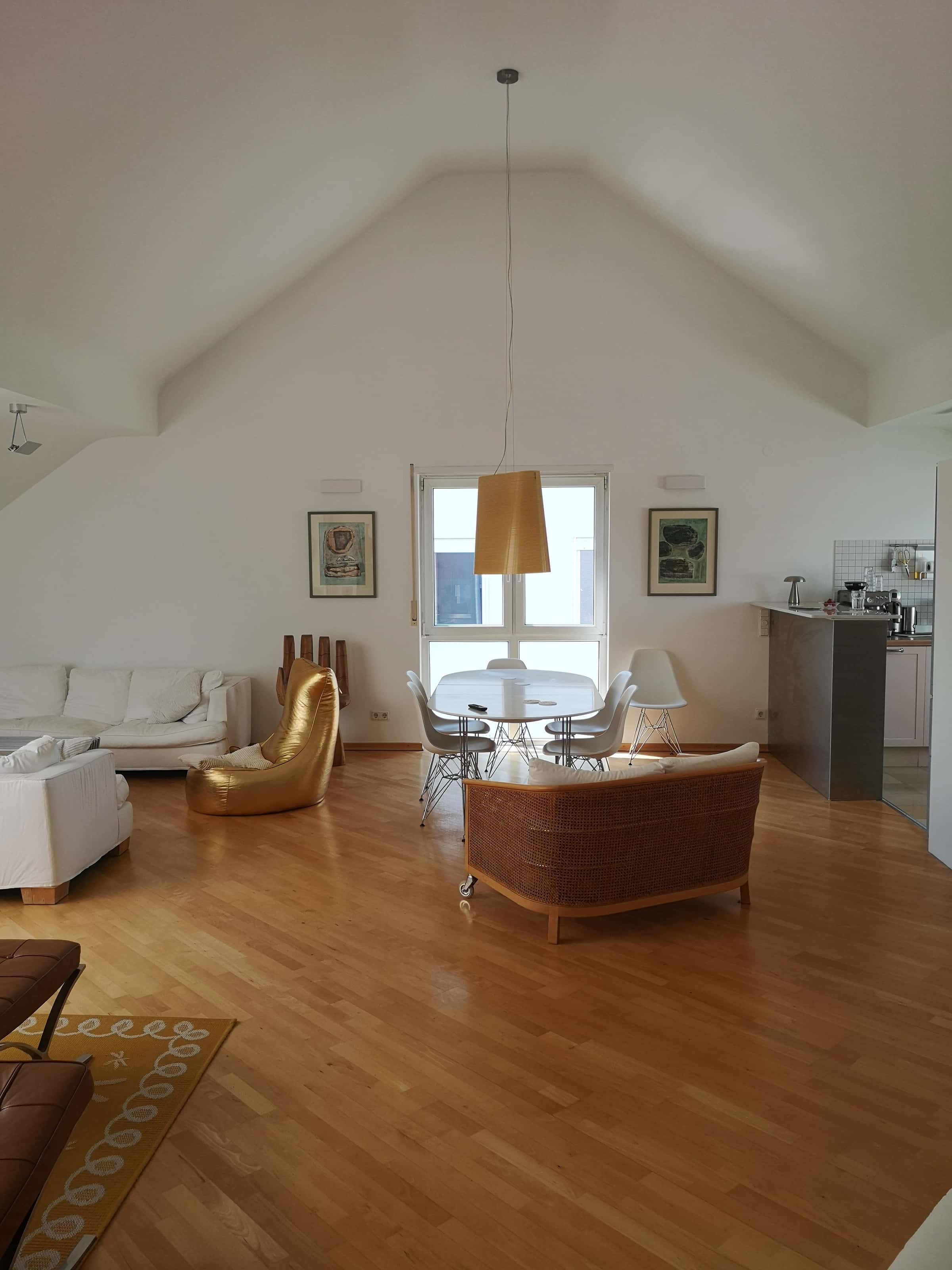 Mitwohn-Gelegenheit 1 Zimmer "No.1" im Appartment – zur längerfristigen Anmietung für 1 Pers. Alle Räume und Einrichtungen ausser Zimmer "No.2" und Mansarde können mitgenutzt werden. Der Eigentümer behält sich vor diese Räume nach Ankündigung gelegentlich temporär selbst zu nutzen, wie dann auch den Rest des Objekt gemeinschaftlich zusammen mit dem Mitbewohner aus Schlafraum "No1. (Absprachen möglich) Diese außergewöhnlich großzügige 3-Zimmer-Wohnung (106 m² Wohnfläche, 153 m² Grundfläche) verbindet modernes Loft-Ambiente mit naturnahem Wohnen. Sie befindet sich im komplett ausgebauten 2. Obergeschoss eines gepflegten 3-Parteien-Hauses in einer ruhigen Seitenstraße – unmittelbar am Naturschutzgebiet und nur wenige Schritte vom Badesee entfernt. Die Wohnung ist lichtdurchflutet, nicht einsehbar und hochwertig möbliert. Moderne Technik, geschmackvolle Ausstattung und ein klarer Grundriss sorgen für ein exklusives Wohngefühl. Die vollflächige Fußbodenheizung mit Raumthermostate sowie eine zusätzliche Wandheizung im Bad bieten höchsten Komfort. Vor dem Haus stehen ausreichend Parkmöglichkeiten zur Verfügung; ein eigener Stellplatz ist inklusive. Eine geschlossene Garage mit Lademöglichkeit für E-Mobilität kann auf Wunsch angemietet werden. In fußläufiger Umgebung (ca. 5 Minuten) befinden sich Bäckerei, Eisdiele, Supermarkt, Tankstelle und verschiedene Restaurants. Die Straßenbahnhaltestelle ist ebenfalls bequem erreichbar – Fahrtzeit zum Hauptbahnhof ca. 10 Minuten, zum Flughafen Frankfurt ca. 40 Minuten. Universität, Schulen, Kindergärten sowie diverse Sportmöglichkeiten (Fußball, Schwimmen, Tennis, 9-Loch-Golfplatz, Reitclub) liegen nur 5–10 Minuten entfernt. Die Umgebung bietet zudem zahlreiche Ausflugsmöglichkeiten, darunter der Schwetzinger Schlosspark, Heidelberg und das Neckartal, die Bergstraße, der Odenwald sowie die Pfälzer Weinstraße mit ihren vielen Attraktionen. Optionale Extras - Reinigungskraft auf Anfrage (Stundenpreis nach Vereinbarung) - Garage (Maße ca. 5,75 × 2,76 × 2,10 m, Einfahrt min. 2,10 m) - 2 Fahrräder