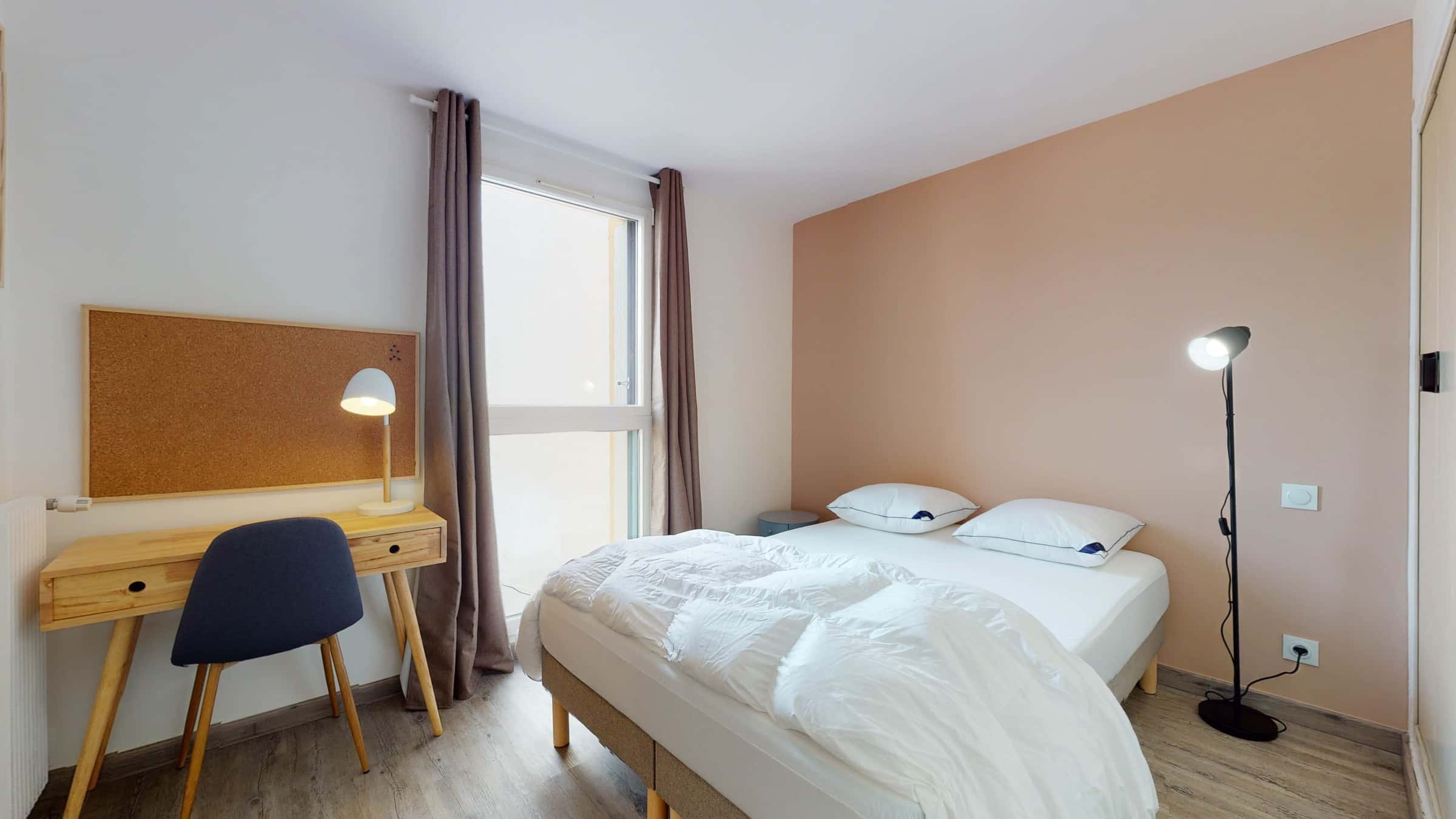 This spacious and comfortable room has been designed for you dear roomie! Practical and functional, the room is equipped with high quality bedding (140x200cm), numerous storage spaces (bed drawers, closet, shelves and night table) and a true office space for your exams or your home office days! All of this in a cheerful and warm atmosphere. In addition, you have access to a shared bathroom. Discover Montpellier Alco, our cosy and freshly renovated contemporary-style apartment. Close to local shops and restaurants, it is easily accessible by subway 3. With a surface area of 107 m², it is perfect to accommodate the busy and exciting lives of 5 happy tenants! You will enjoy a kitchen and a living room. All of this in a friendly and modern atmosphere. And because you may want to share a rent but not your intimacy, our apartment offers each of you its own night space equipped with a desk. Who says better? Want to live here? Book your room online now ! 🛒 Supermarkets | 9 min 🛍 Mall "Les Portes du soleil"| 23 min by Metro 3 🍴Restaurants | 7 min 🚇 Metro 3 | 3 min 🚍 Bus 7 | 3 min