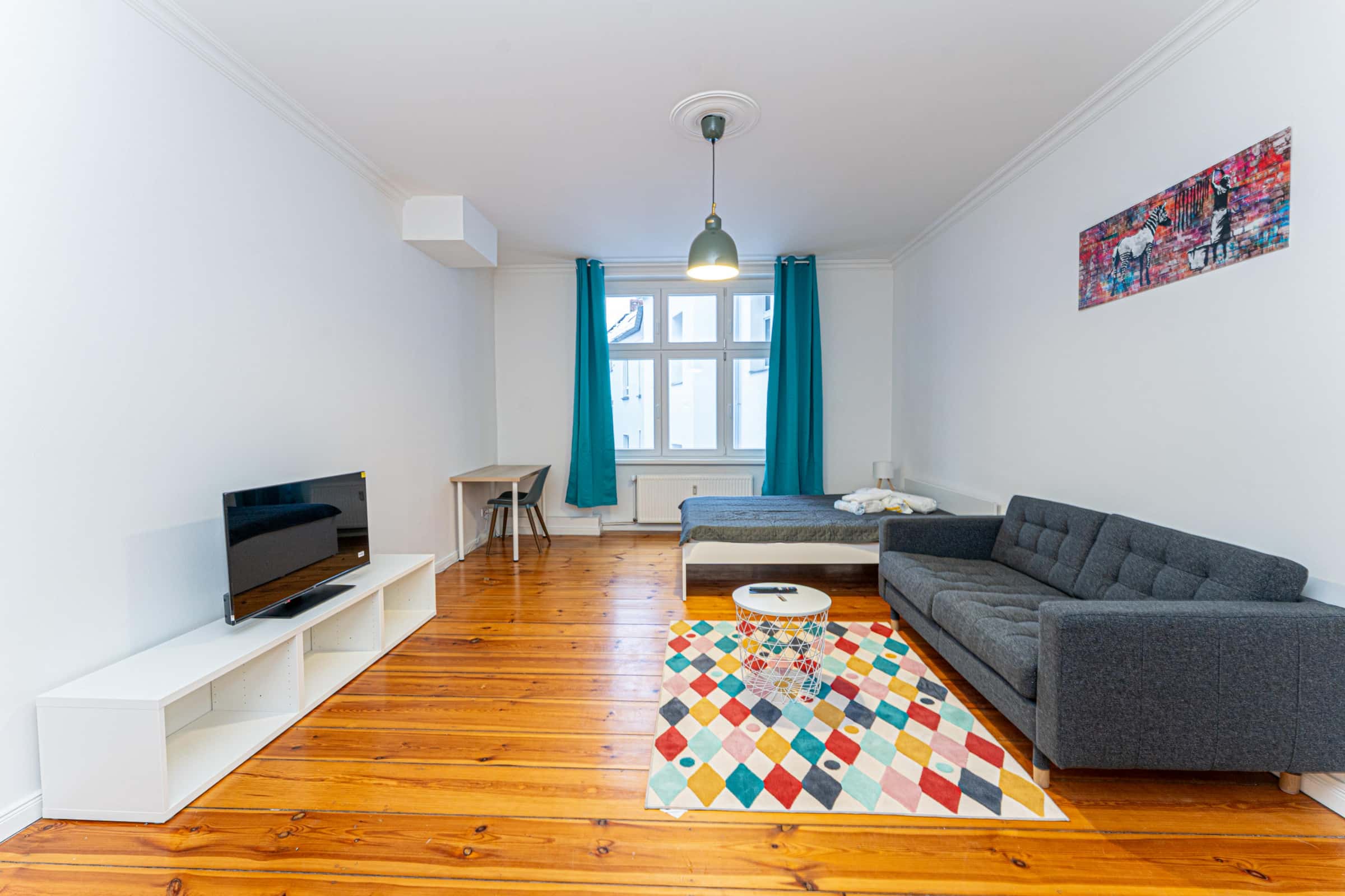 EN Enjoy your stay in this beautiful and bright room in a freshly renovated shared apartment! Located in a dynamic district in Berlin, this room will become your nest in the lively city. Your cosy room will be fully furnished with bed (incl. mattress, blanket and pillow), desk and chair, wardrobe, shelf, curtains. hanging and/or standing lamp. Heating, electricity, water, and internet are included in the price. Public transport connections are easily reachable nearby and you will find many restaurants, supermarkets and shops in the area. Check-in is possible from Monday to Firday, from 9AM to 2PM. Kindly note that the building has been fully renovated. Some finishing work is still in progress. DE Genieß deinen Aufenthalt in diesem schönen und hellen Zimmer in einem frisch renovierten Apartment! In einem dynamischen Stadtteil Berlins gelegen, wird dieses Zimmer zu deinem Rückzugsort in der lebendigen Stadt. Dein gemütliches Zimmer ist komplett eingerichtet mit Bett (inkl. Matratze, Decke und Kissen), Schreibtisch und Stuhl, Kleiderschrank, Regal, Vorhängen, Hänge- und/oder Stehlampe. Heizung, Strom, Wasser und Internet sind im Preis inkludiert. Öffentliche Verkehrsmittel sind in der Nähe und leicht erreichbar. In der Umgebung findest du viele Restaurants, Supermärkte und Geschäfte. Check-in ist möglich von Montag bis Freitag, von 9 bis 14 Uhr. Wir möchten Sie darauf hinweisen, dass das Gebäude umfassend saniert wurde. Derzeit finden noch letzte Fertigstellungsarbeiten statt.
