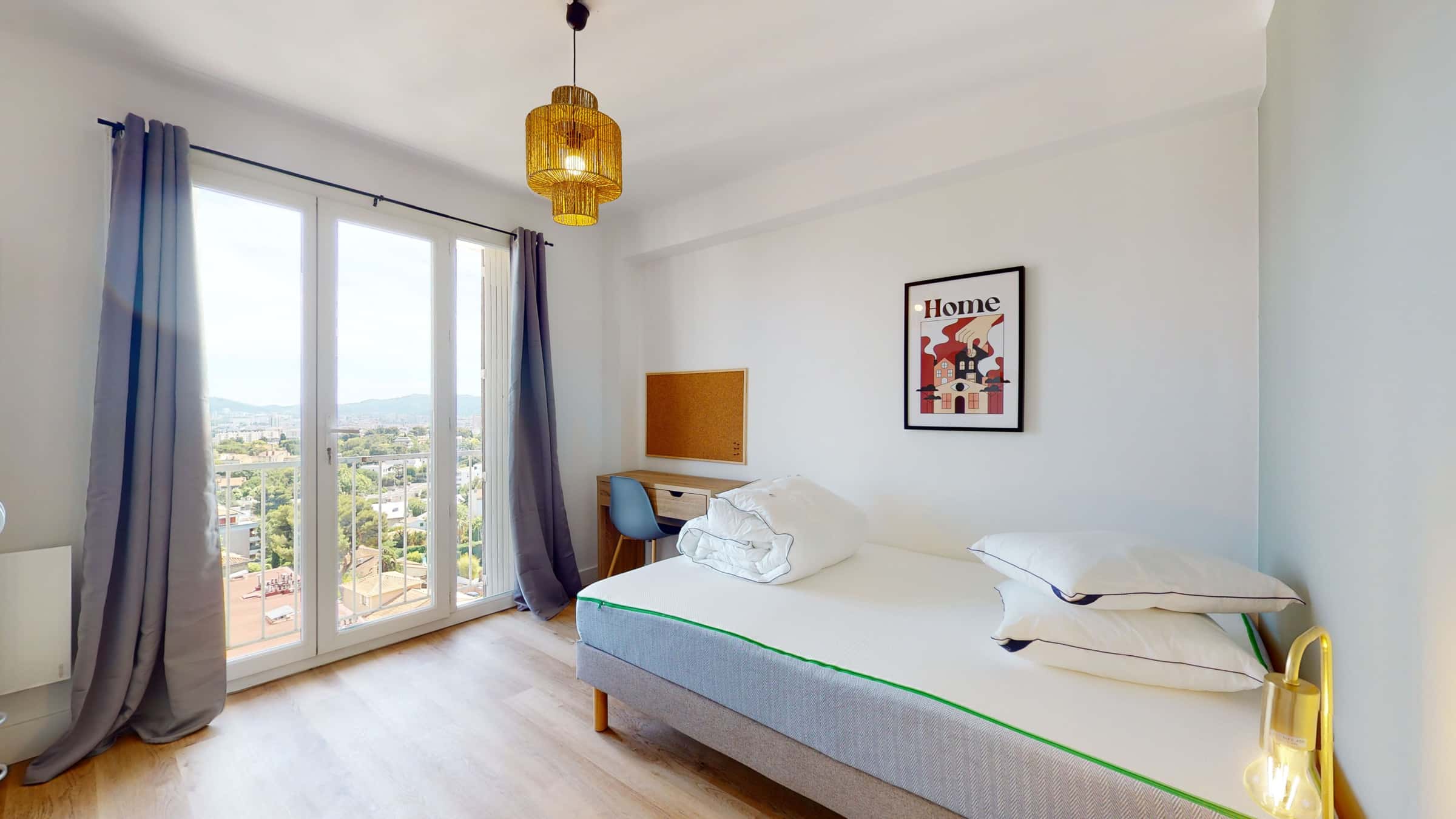 This spacious and comfortable room has been designed for you dear roomie! Practical and functional, the room is equipped with high quality bedding (140x200cm), a beautiful wardrobe, a night table and a true office space for your exams or your home office days! All of this in a cheerful and warm atmosphere. In addition, you have access to a shared bathroom. Beautiful flatshare in Marseille ! Discover Marseille Roux, our cosy and freshly renovated contemporary-style apartment. Close to local shops and restaurants, it is easily accessible by M1, bus 6, 67. With a surface area of 65 m², it is perfect to accommodate the busy and exciting lives of 3 happy tenants! You will enjoy a kitchen and a living room. All of this in a friendly and modern atmosphere. All charges are included: water, electricity, heating but also internet and building maintenance. A large living room / kitchen: Fully equipped kitchen, Large sofa, Bright living room, Smart TV, Large table. 3 bedrooms perfectly equipped: 140x200 hotel quality bed, Desk in each room, Large wardrobe. Want to live here? Book your room online now! 🍴 Restaurant | 1 min 🥐 Bakery | 1 min 🛒 Supermarket | 1 min 🚆 Chartreux (M1) | 3 mins 🚍 Roux Esplanade (Bus 6, 67) | 1 min